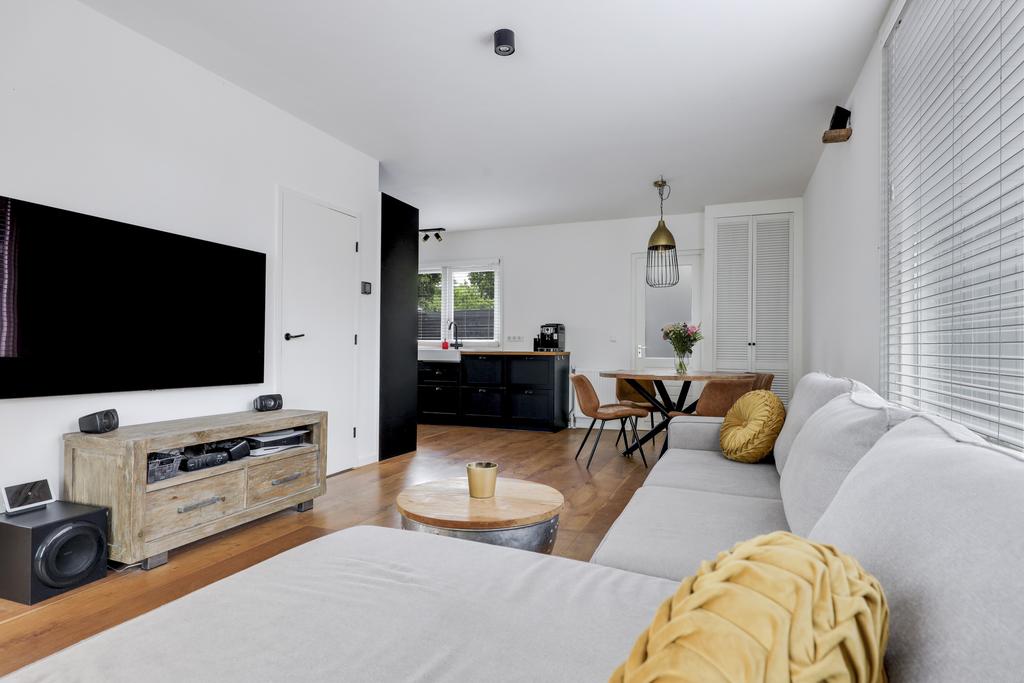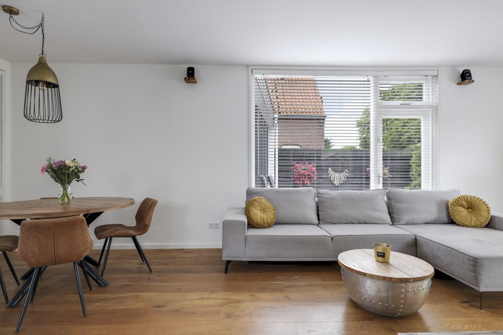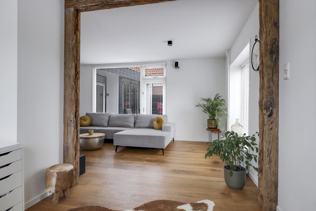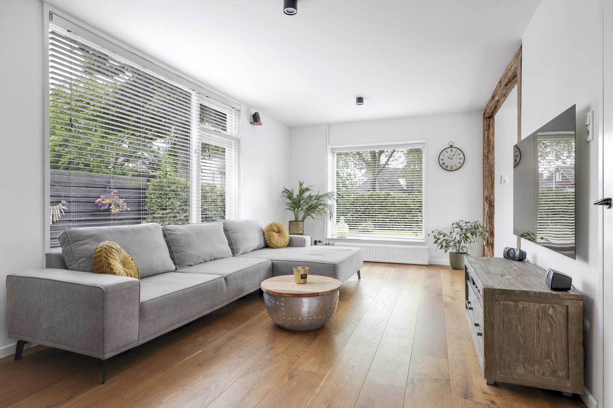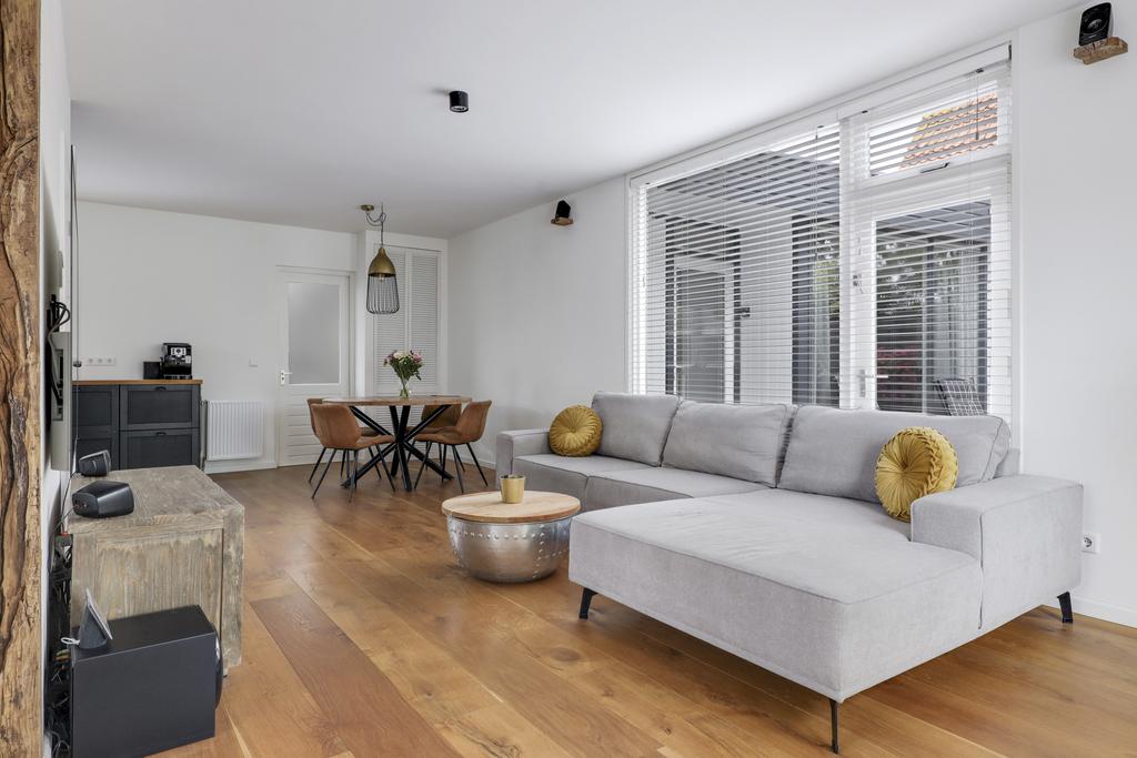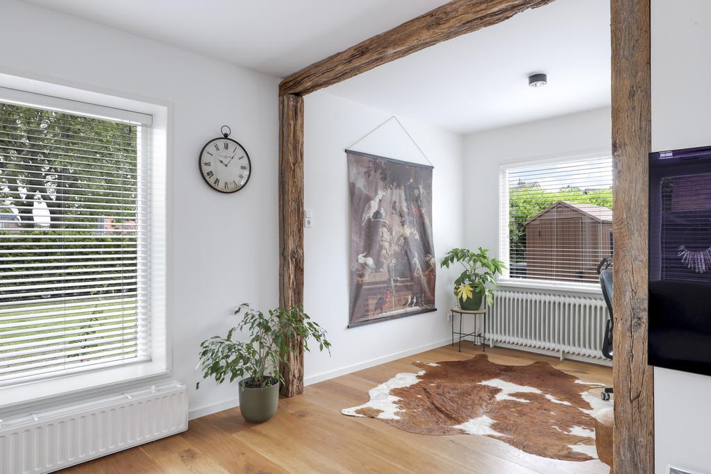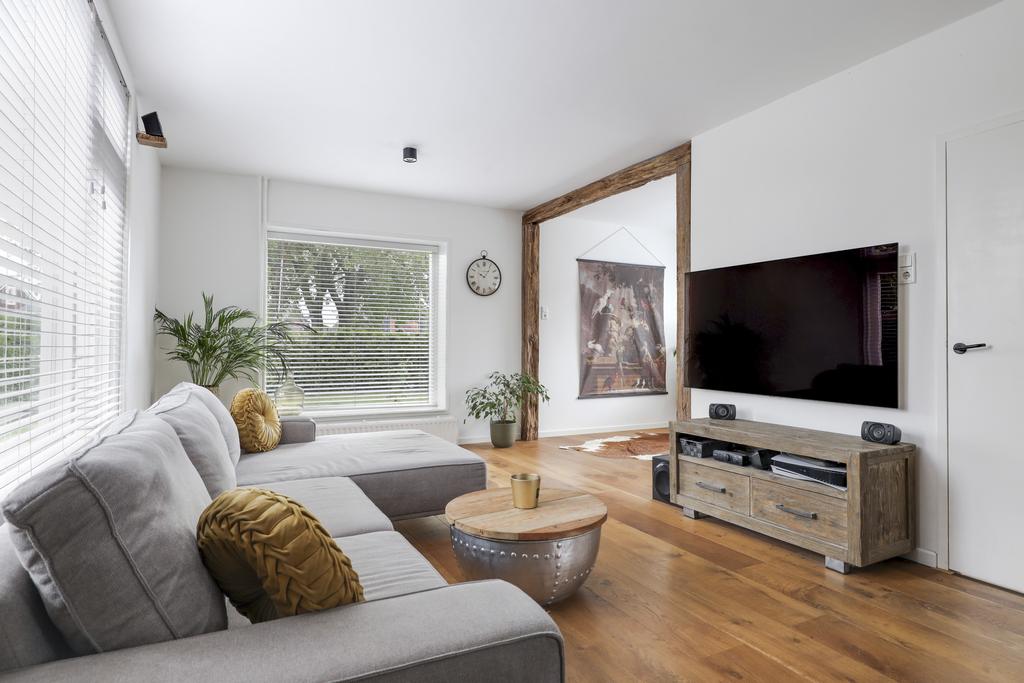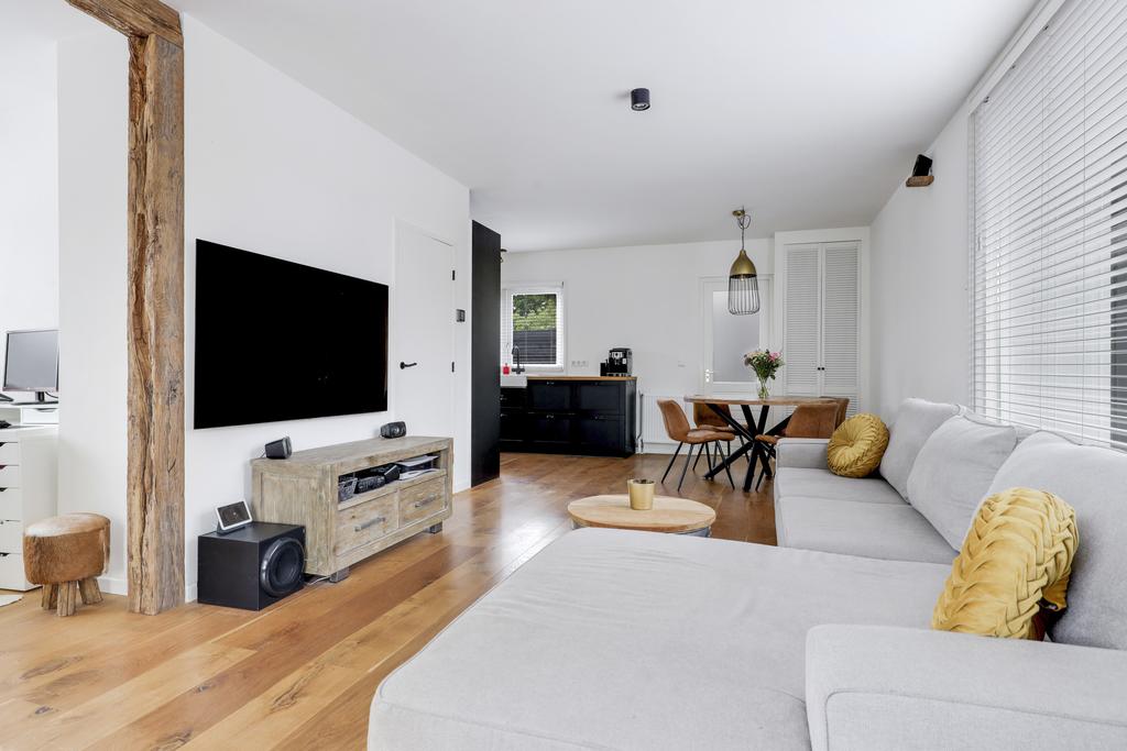 Zoals benoemd heeft de woonkamer een grote metamorfose ondergaan. Binnenmuren zijn weggehaald waardoor de ruimte lichter is geworden en een open verbinding heeft gekregen met de keuken. De woonkamer zelf is in een L-vorm gesitueerd, waarbij de karakteristieke (oude Franse) houten balken de aandacht pakken. Op de vloer ligt een houten parketvloer wat de ruimte een warme uitstraling geeft. De wanden en het plafond zijn strak gestuct, waarbij de grote raampartijen veel lichtinval bieden. Het plafond is daarbij voorzien van isolatie. Doordat de ruimte praktisch is opgesteld kan je hier spelen met de indeling van de meubels waardoor je verschillende zithoeken kwijt kunt. Je kan hier zelfs een werkhoek of speelhoek voor de kinderen kwijt.