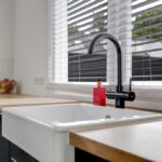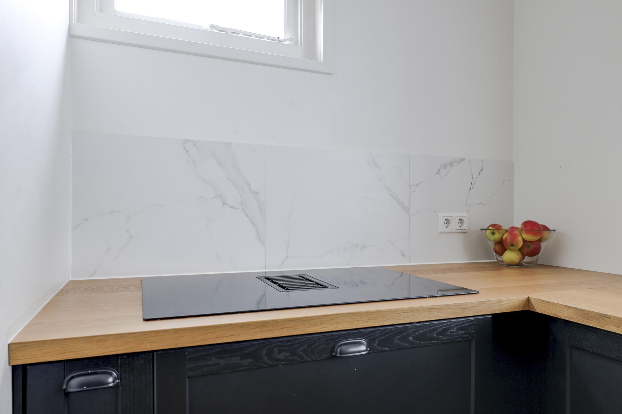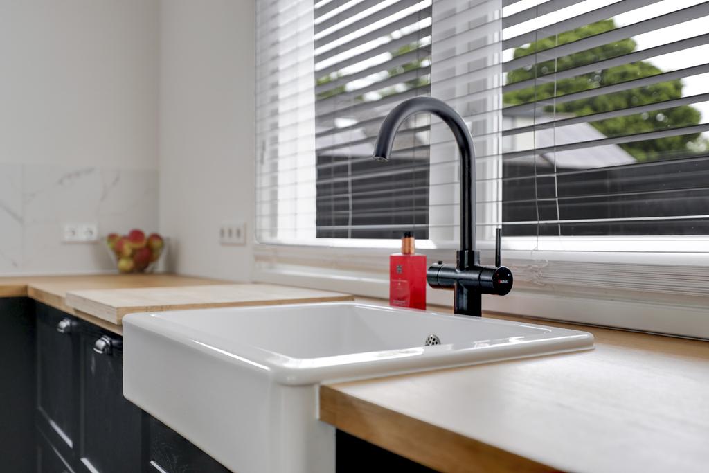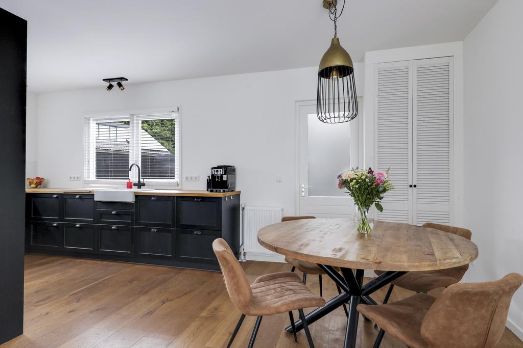 De keuken staat in open verbinding met de woonkamer. Het kozijn bij de keuken is vervangen, je hebt hier een fijne lichtinval direct op het werkblad. Het keukenblok is in 2 delen geplaatst. Je hebt hier namelijk een hoekkeuken met daartegenover een apparatenwand. De kasten zijn stijlvol zwart uitgevoerd waardoor het houten aanrechtblad extra opvalt. Het zal niet verbazen dat alle wenselijke inbouwapparatuur aanwezig is, namelijk een inductiekookplaat met geïntegreerde afzuigkap, een koel/vriescombinatie, een vaatwasser, een stoomoven en een combi-oven/magnetron. Zelfs een Quooker is geïntegreerd in de keukenkraan waardoor je direct heet water tot je beschikking hebt.