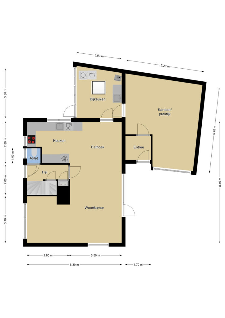 Een groot pluspunt bij deze woning is de extra ruimte aan huis. Je treft hier namelijk een kantoor/praktijkruimte aan huis. Met ca. 30m² is dit een volwaardige ruimte welke eindeloos veel mogelijkheden biedt. Door de eigen entree kan je hier gemakkelijk een praktijk of kantoor aan huis vestigen. Deze ruimte heeft een eigen huisnummer (4a), echter is dubbele bewoning niet toegestaan. Dit 2e huisnummer kan praktisch zijn als je hier je eigen bedrijf houdt. Je kan hier zelfs een slaapkamer en badkamer creëren waardoor je de woning levensloopbestendig kan bewonen. De douchecabine in deze ruimte blijft niet achter.