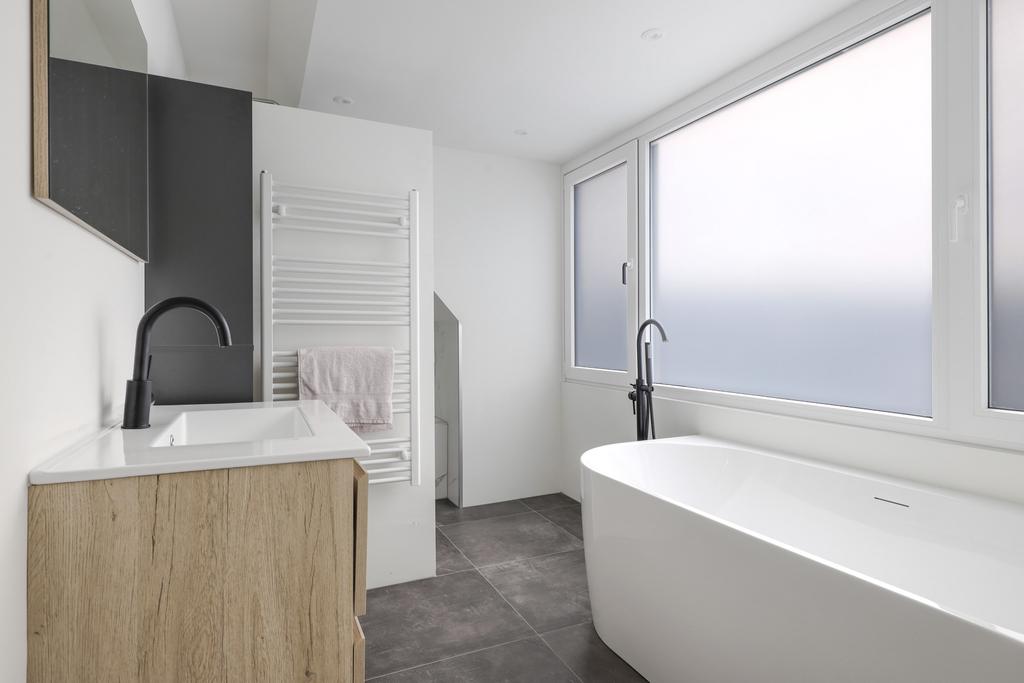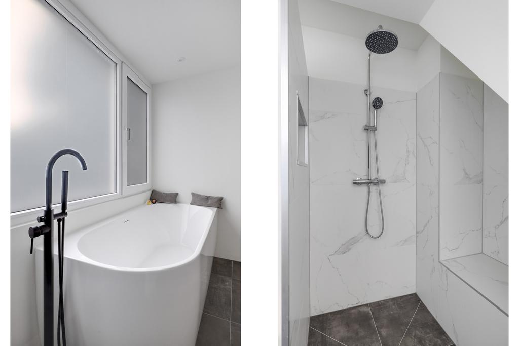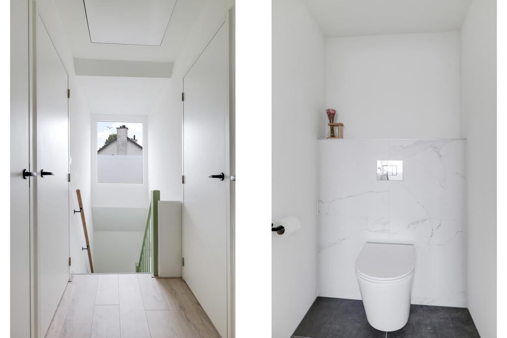 Deze badkamer is hagelnieuw en in 2023 pas geplaatst. Ook hier geeft de dakkapel de nodige extra ruimte. De ruimte is ingedeeld met een half-vrijstaand bad met stijlvolle, vrijstaand zwarte kraan. Achter een scheidingswand is de inloopdouche te vinden welke stijlvolle marmerlook tegels heeft. Een nisje biedt ruimte voor de douchegel en de shampoo. Het wastafelmeubel is voorzien van twee lades waardoor je hier voldoende opbergruimte hebt. Uiteraard is er ook een handdoekradiator geplaatst. Het toilet is separaat van de badkamer geplaatst en vanaf de overloop bereikbaar.
