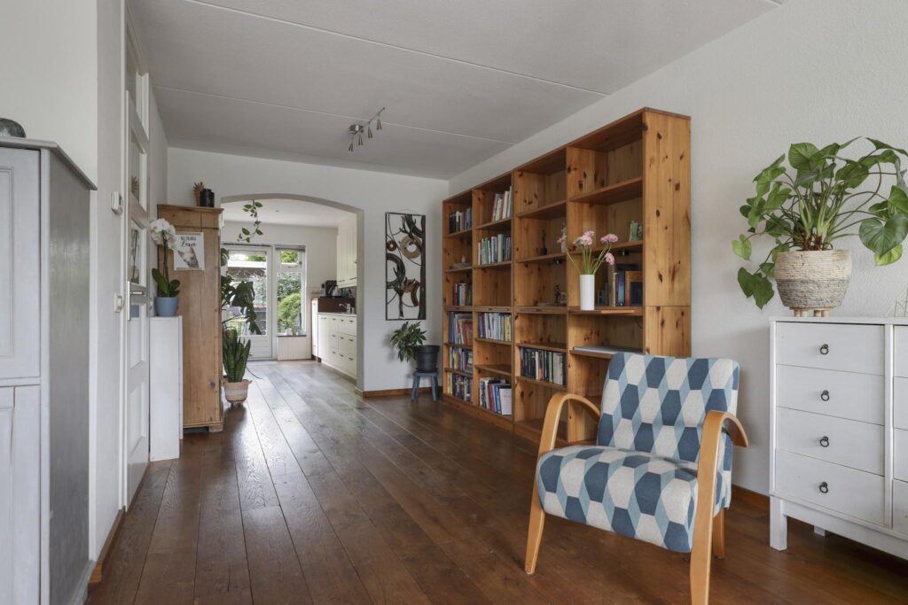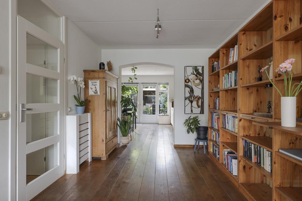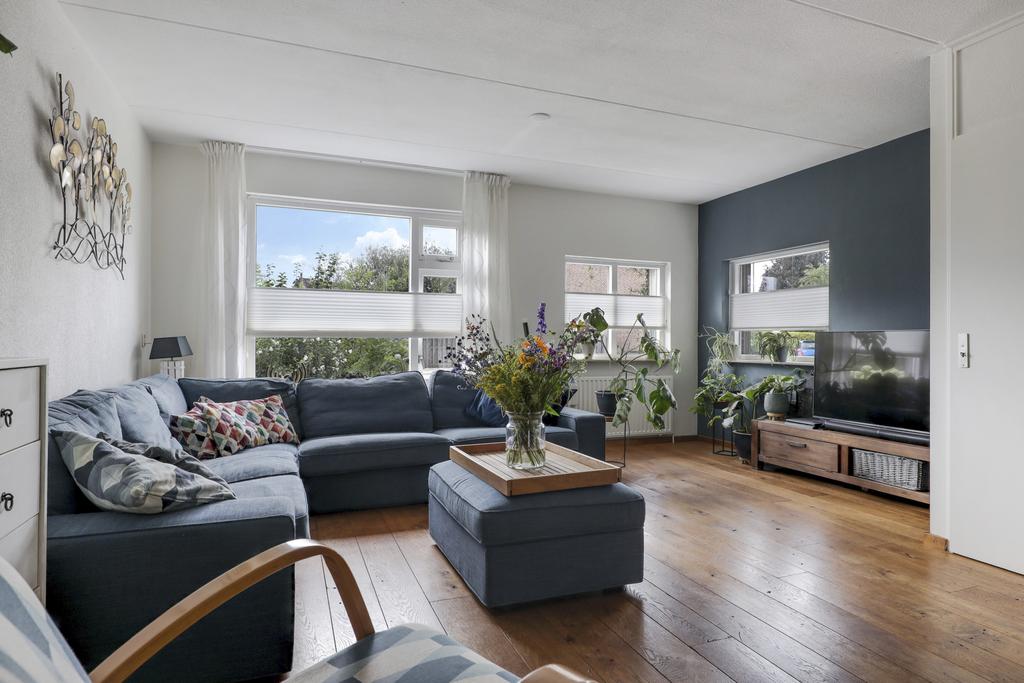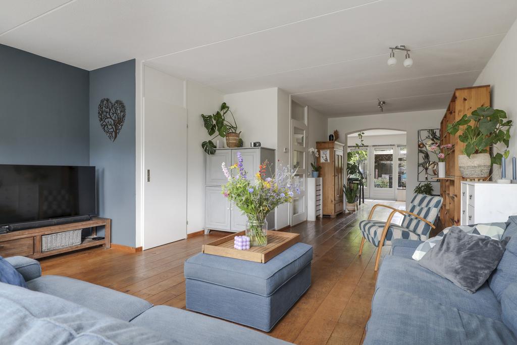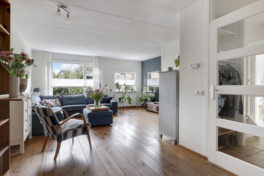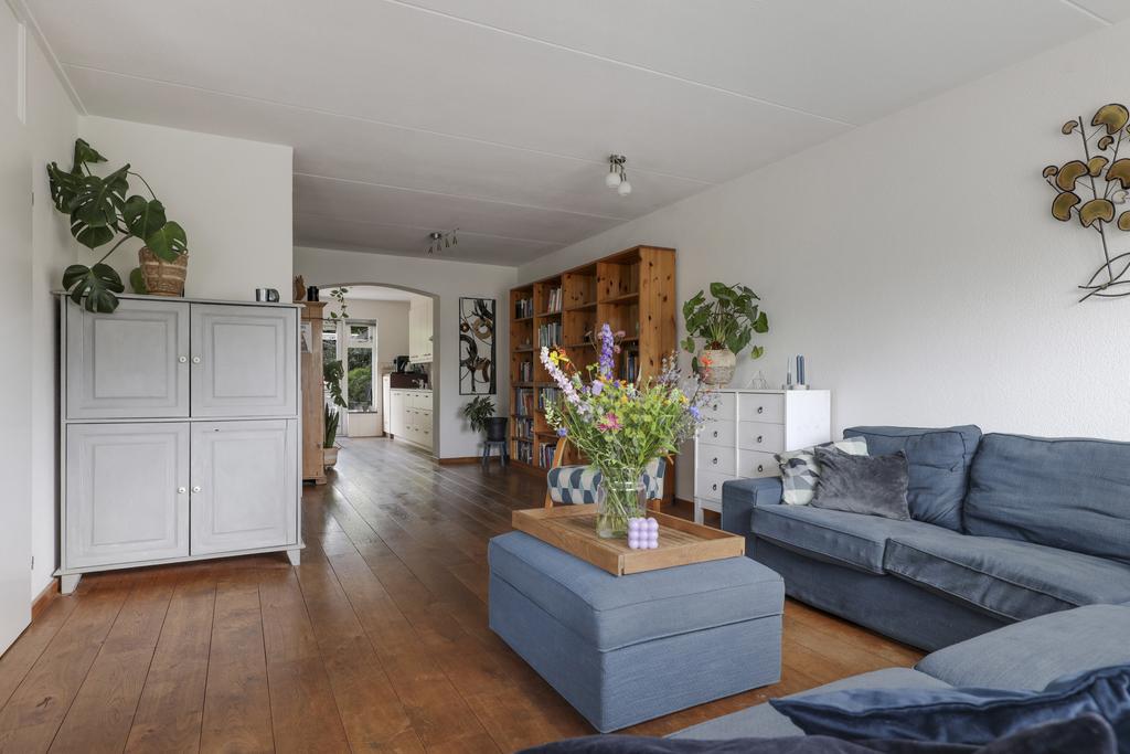 Doordat de woning is uitgebouwd en de keuken naar de uitbouw is verplaatst, is er ook meer leefruimte in de woonkamer ontstaan. Dit geeft een ruimtelijk gevoel omdat je de meubels over een groter vloeroppervlak kan inrichten. De woonkeuken biedt bijvoorbeeld plaats aan de eettafel, waardoor deze niet in de woonkamer hoeft. Je kan hier dan ook met gemak een riante hoekbank en een flinke boekenkast kwijt. Noemenswaardig is de massief houten plankenvloer wat de ruimte een sfeervolle en warme uitstraling geeft. De ligging aan een doodlopend hofje zorgt voor minimaal verkeer voor de woning wat meer rust biedt wanneer je op de bank zit.