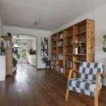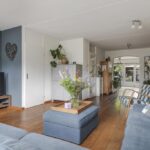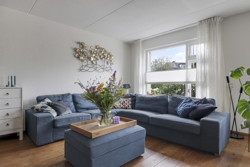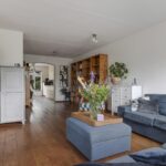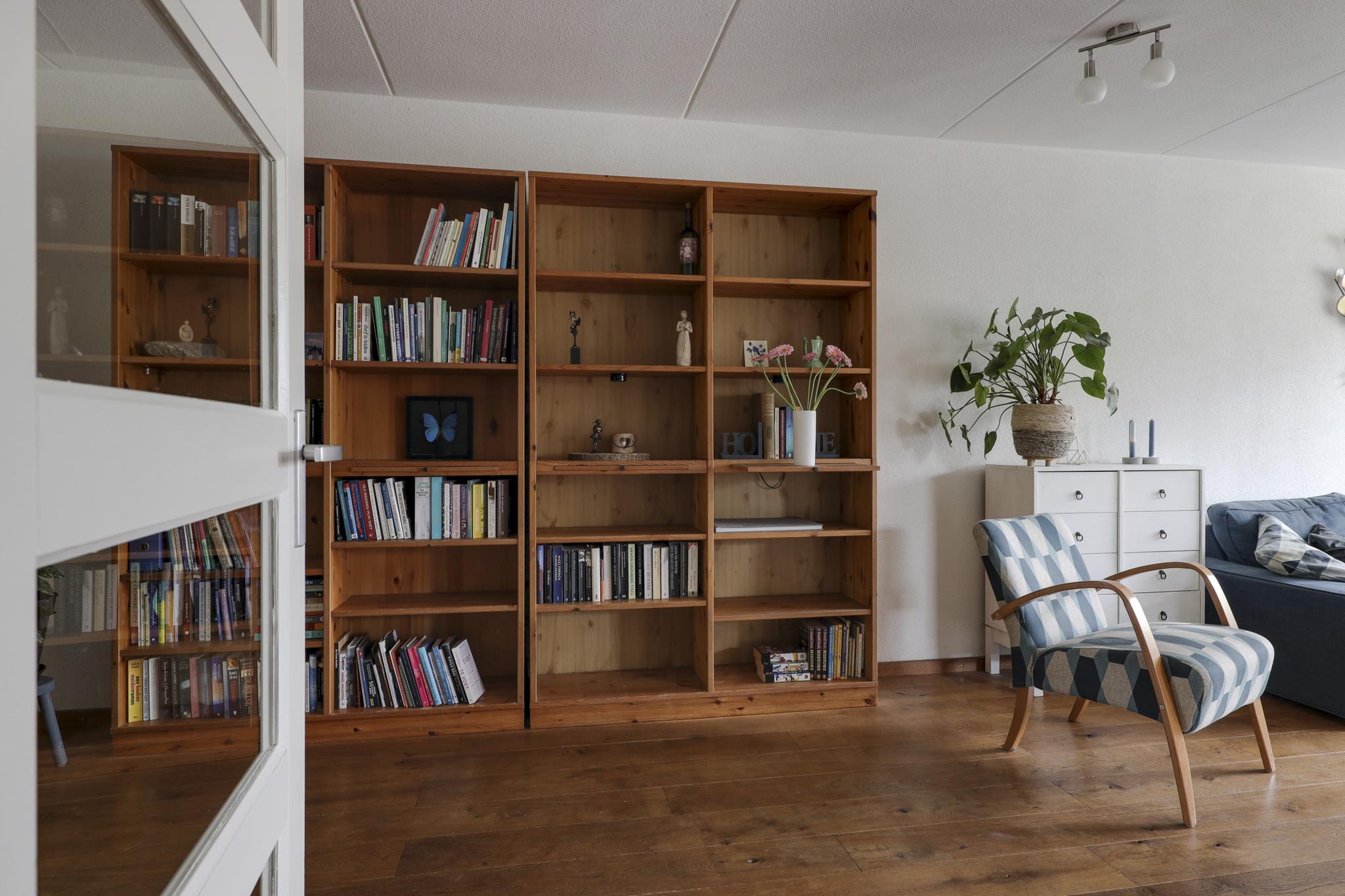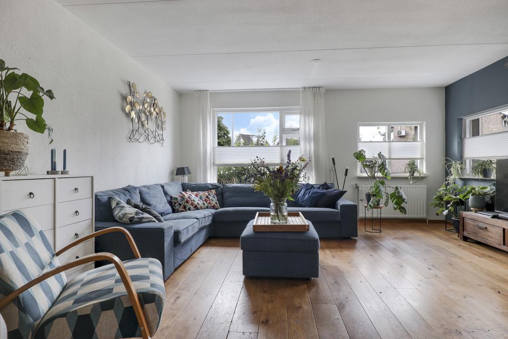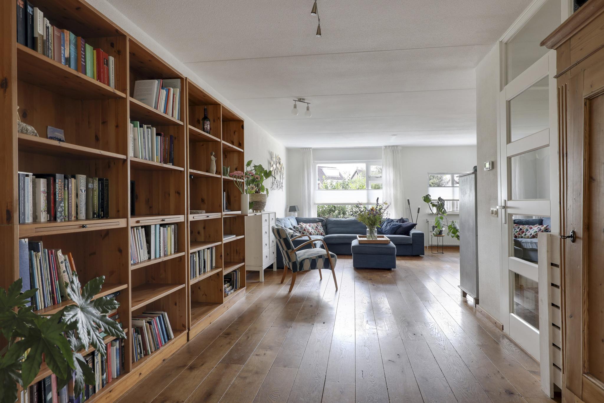 Doordat de woning is uitgebouwd en de keuken naar de uitbouw is verplaatst, is er ook meer leefruimte in de woonkamer ontstaan. Dit geeft een ruimtelijk gevoel omdat je de meubels over een groter vloeroppervlak kan inrichten. De woonkeuken biedt bijvoorbeeld plaats aan de eettafel, waardoor deze niet in de woonkamer hoeft. Je kan hier dan ook met gemak een riante hoekbank en een flinke boekenkast kwijt. Noemenswaardig is de massief houten plankenvloer wat de ruimte een sfeervolle en warme uitstraling geeft. De ligging aan een doodlopend hofje zorgt voor minimaal verkeer voor de woning wat meer rust biedt wanneer je op de bank zit.