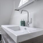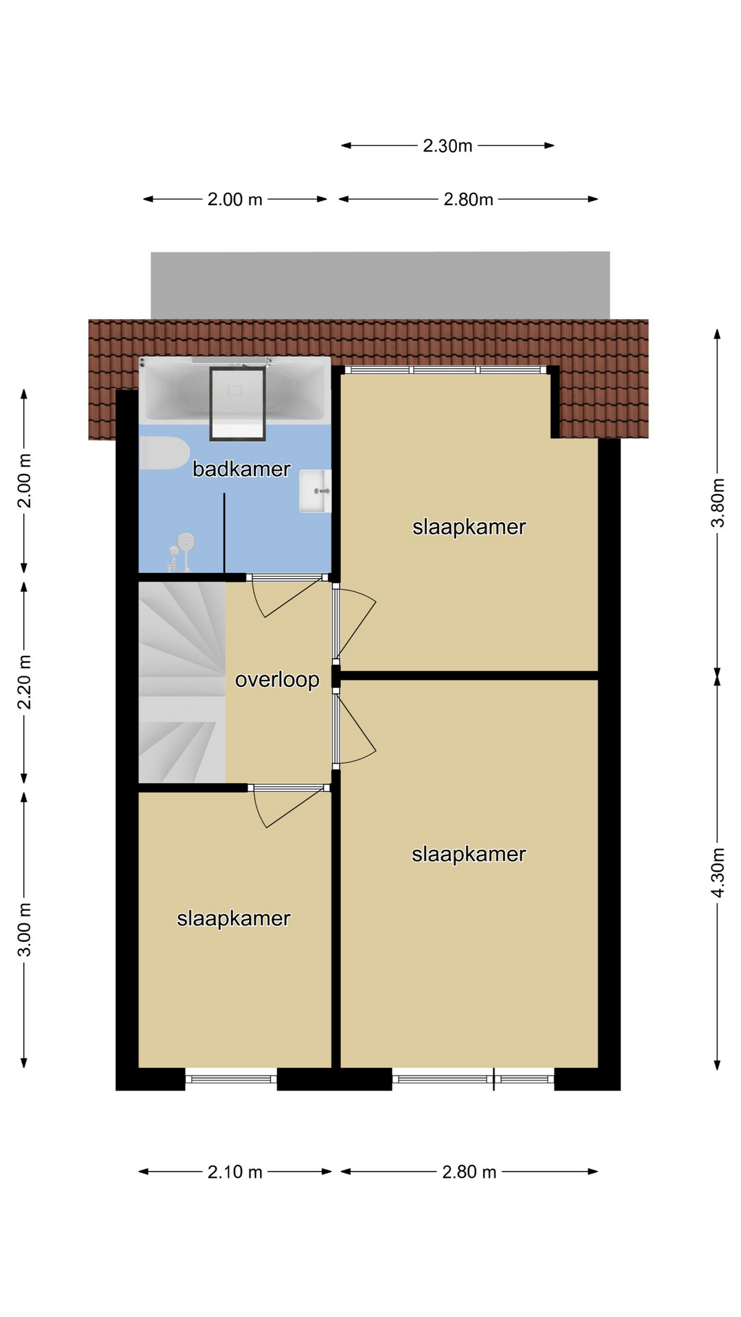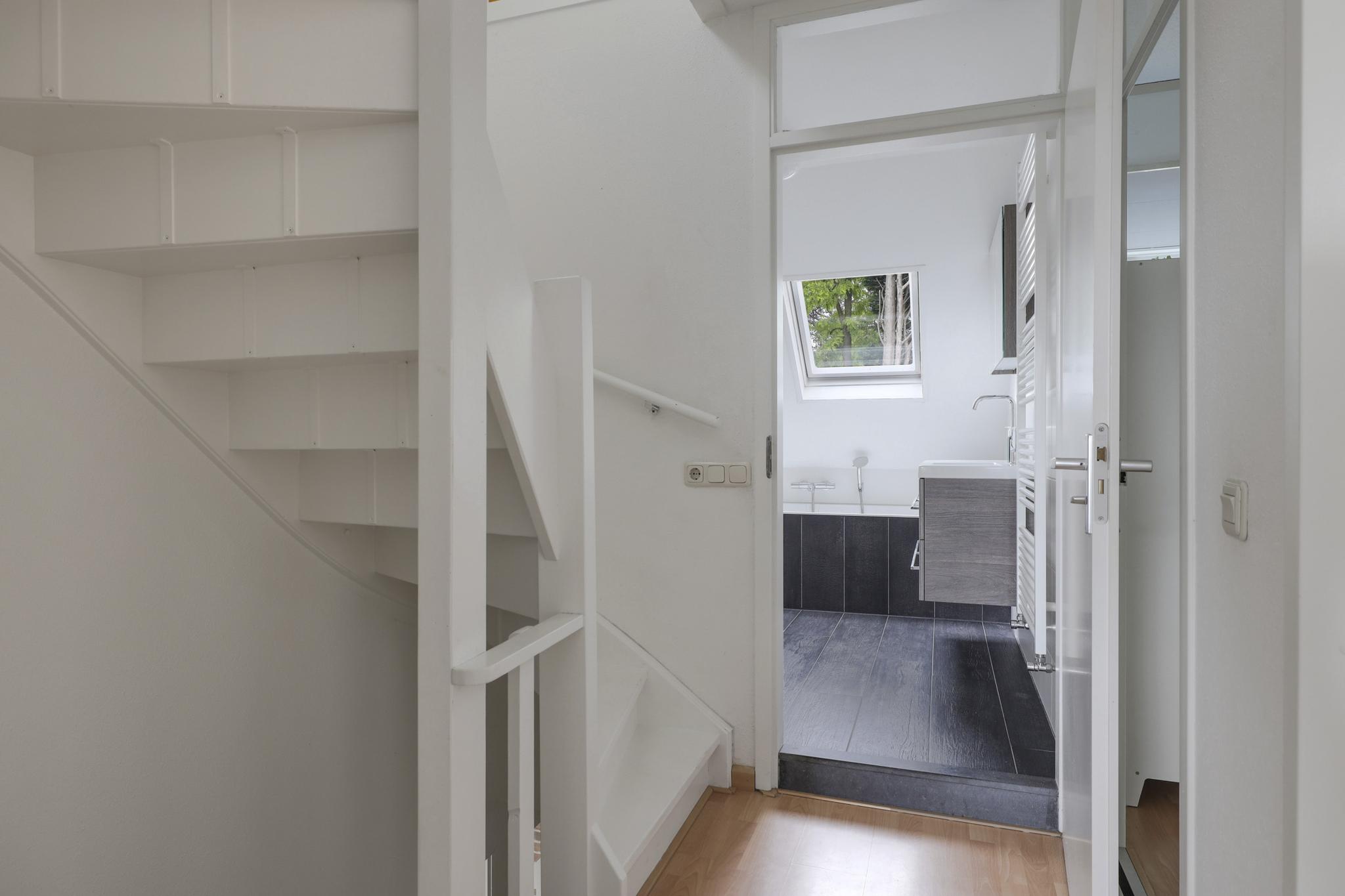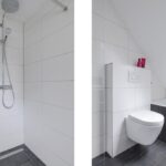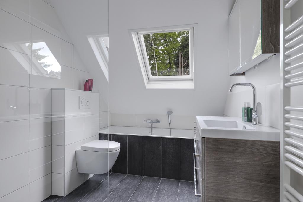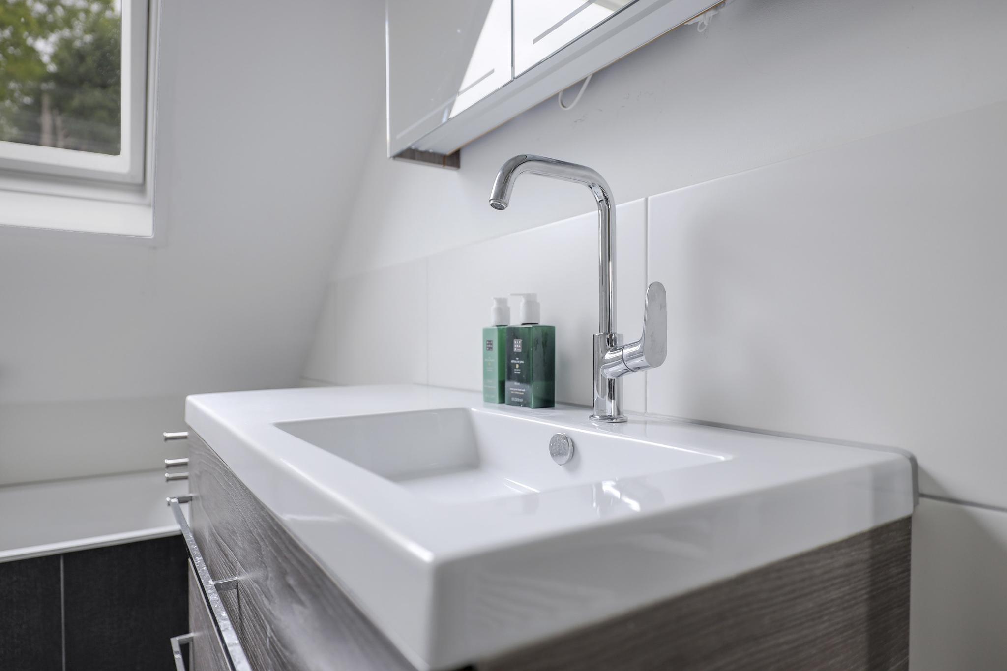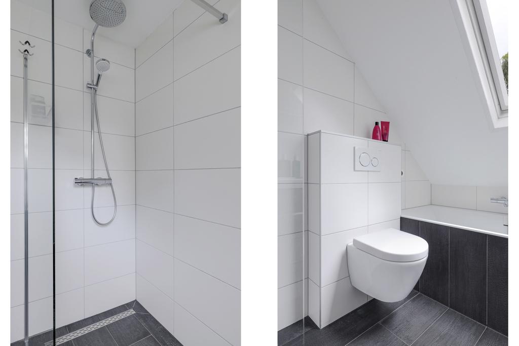 De 4e deur op de overloop geeft toegang tot de badkamer. De badkamer is in 2019 vervangen en heeft een moderne en tijdloze uitstraling. Door het schuine dakvlak is de badkamer wat beperkter in te richten, echter is bij het vernieuwd creatief nagedacht over de indeling. Door het bad onder het schuine dakvlak te plaatsen is er ruimte ontstaan voor een ligbad en een aparte inloopdouche. Het sanitair wordt aangevuld door een tweede toilet en een wastafelmeubel. Verder is er een Velux, kunststof dakvenster (met screen) aanwezig, die niet alleen daglicht maar ook een prima ventilatiemogelijkheid biedt.