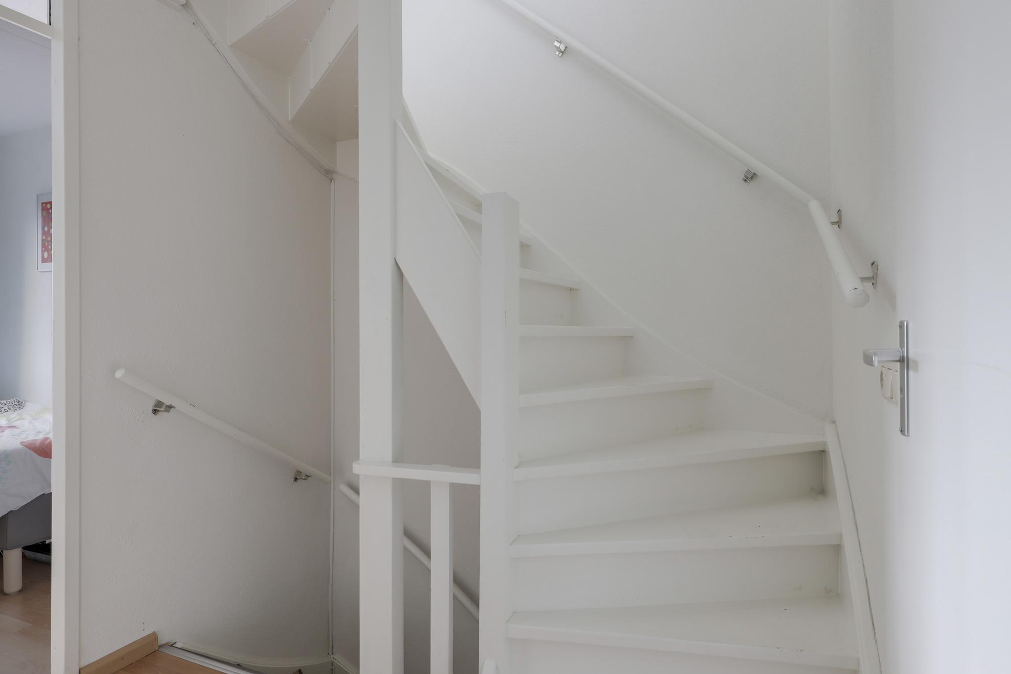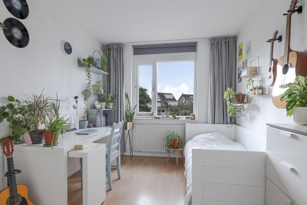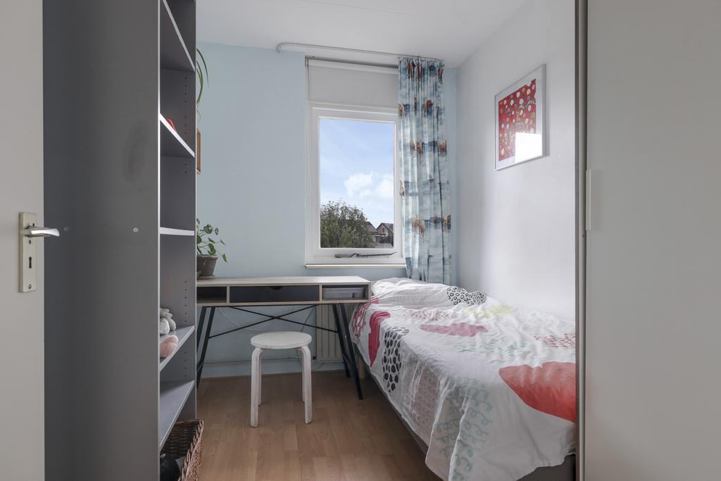 De 1e verdieping is ingedeeld met 3 slaapkamers en een badkamer. De kamers zijn respectievelijk 12m², 10m² en 7m² groot en voelen praktisch aan. De slaapkamer aan de achterzijde heeft van origine een schuin dakvlak, maar dit is grotendeels opgeheven door de brede dakkapel die is geplaatst. Er is daardoor weinig ruimteverlies en bovendien is de kamer meteen voorzien van handige draai/kiepramen. Om de kamer volledig te kunnen verduisteren, is er een rolluik aangebracht die elektrisch te bedienen is.