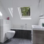Badkamer met ligbad, inloopdouche, 2e toilet (zwevend), wastafelmeubel en dakvenster