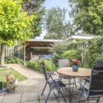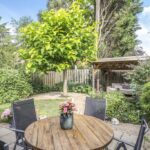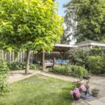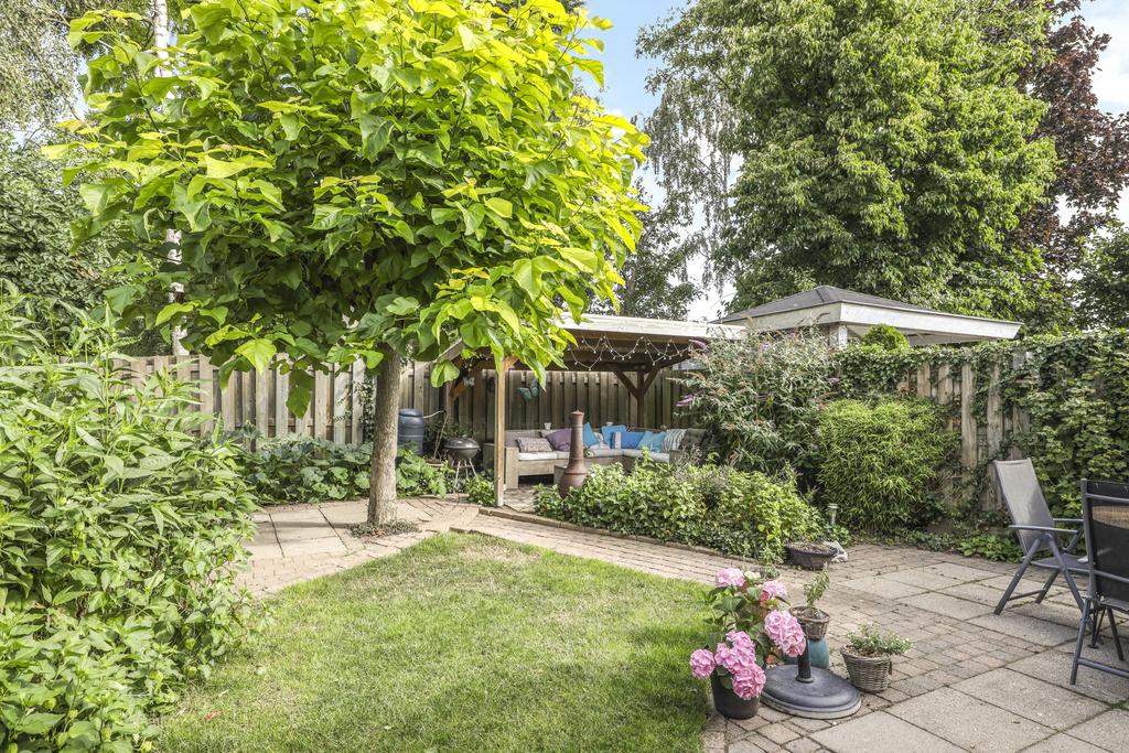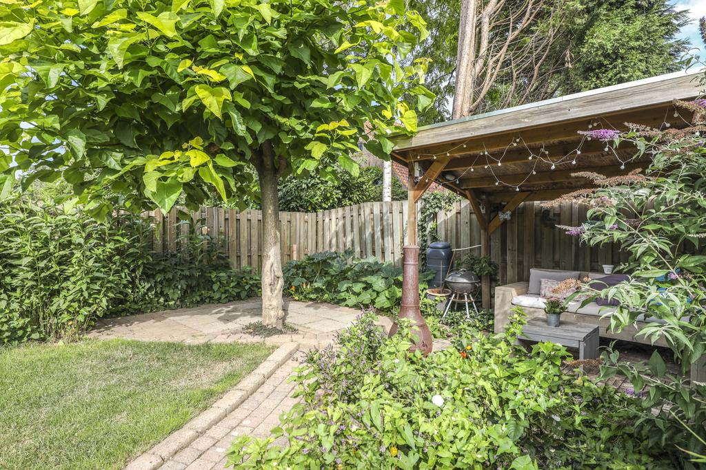 Dit is een heerlijke tuin voor een tuinliefhebber. Ondanks de flinke uitbouw blijft hier een prima formaat over (bijna 10m diep). De tuin is breder dan gemiddeld (ruim 8m) waardoor je hier met gemak meerdere zithoeken kunt creëren. Achter in de tuin is een sfeervolle, houten veranda geplaatst waar je goed een loungeset onder kunt plaatsen. Dit zorgt dat je een fijn plekje in de schaduw hebt. Door de groene omsluiting van de tuin geniet je hier van veel privacy. In het midden van de tuin staat een Catalpa wat de tuin een groene uitstraling biedt.