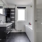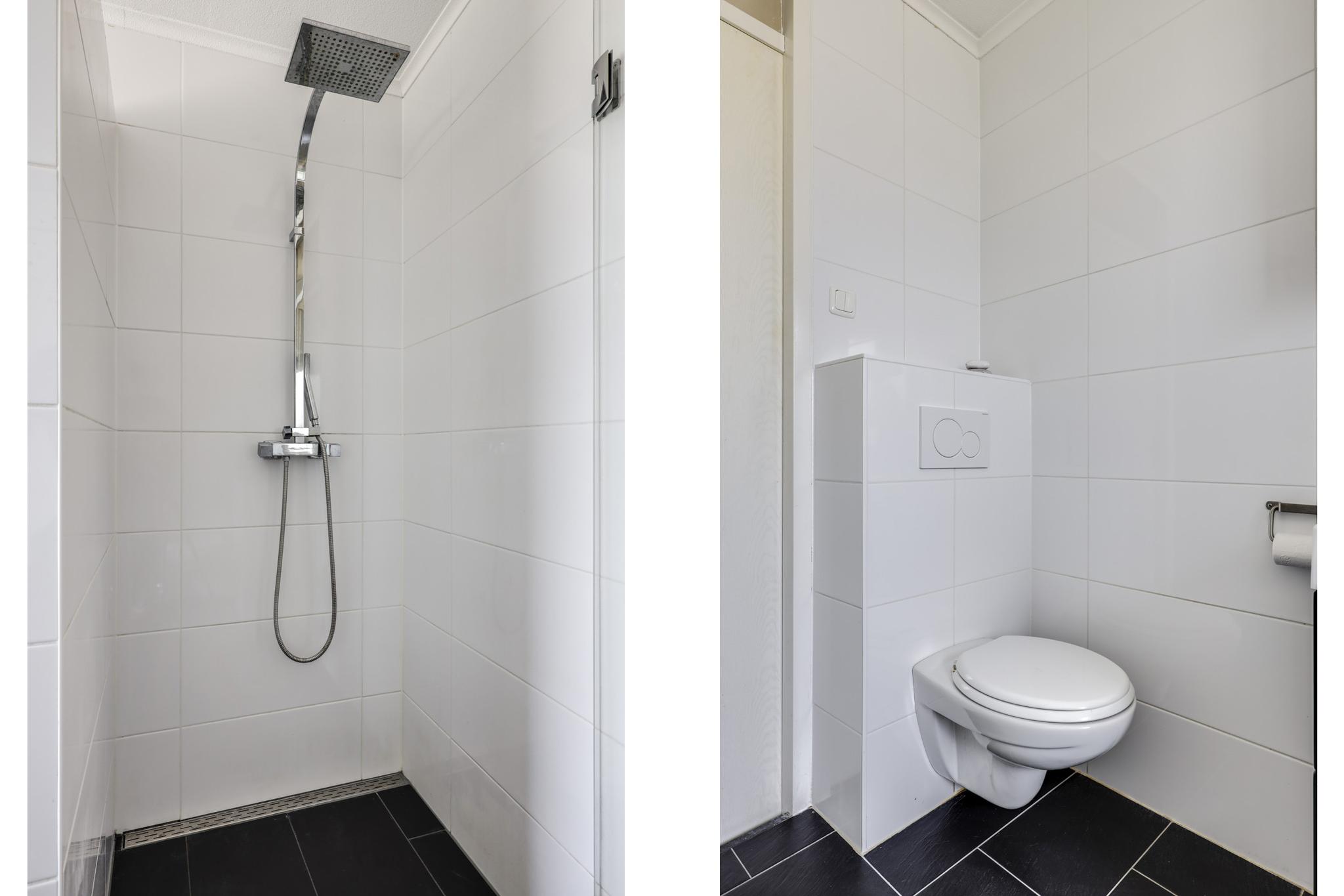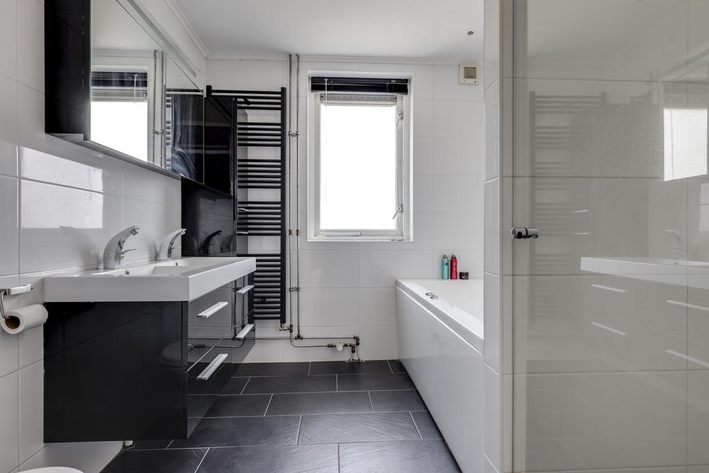 In de algehele modernisering is ook de badkamer meegenomen. Die is in dezelfde stijl als het (gasten)toilet in de hal afgewerkt. Dat wil zeggen: modern en neutraal sanitair met groot formaat wand- en vloertegels (zwart/wit). Er is dankbaar gebruik gemaakt door deze compleet in te richten met o.a. een diep ligbad (whirlpool), een inloopdouche met rainshower/handdouche, een 2e zwevend toilet en een breed 2-persoons wastafelmeubel met ladekorven en een bijbehorende spiegelkast én kolomkast. Je zou kunnen stellen dat er aan opbergruimte voor toiletspullen en handdoeken geen gebrek is.