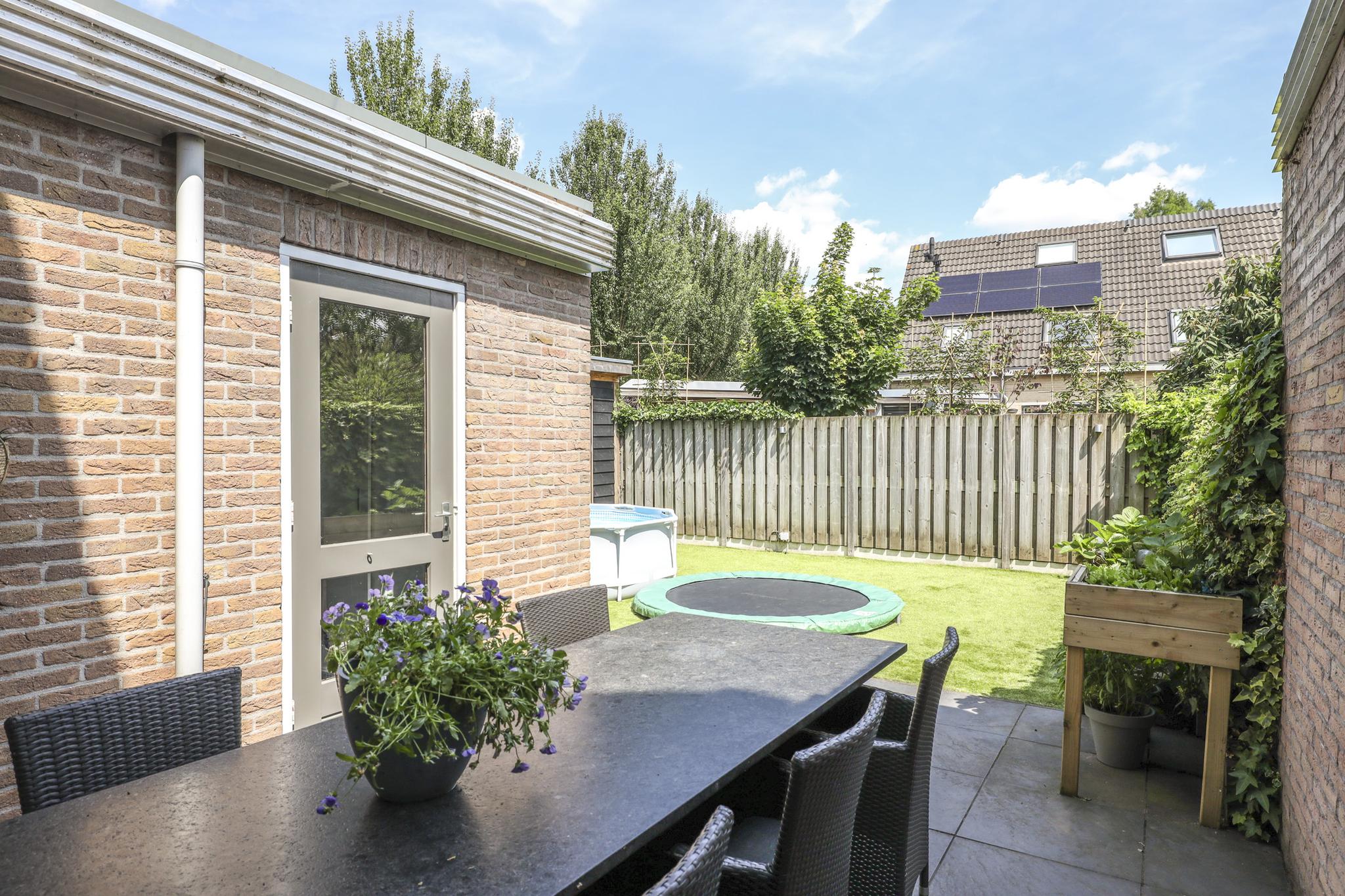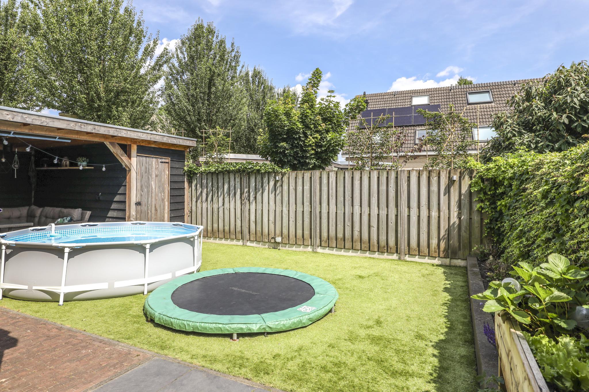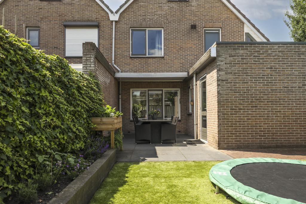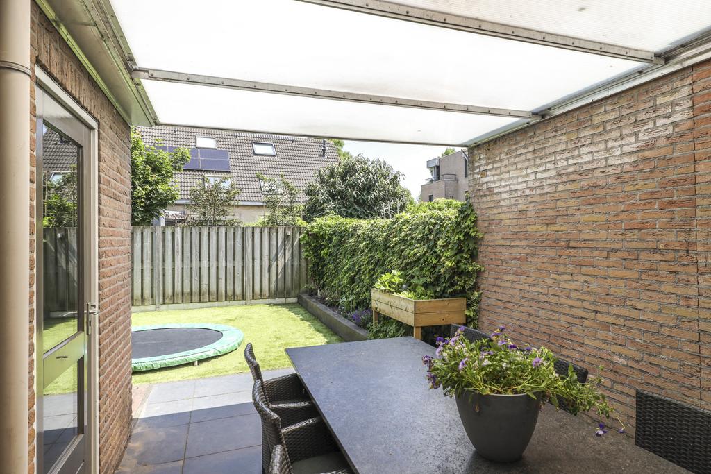 In de achtertuin vind je onder meer een overdekt terras (dak is open te schuiven), een stijlvolle, douglashouten veranda (13m2) en een extra schuur van 8m2 (beiden onder 1 dak). De tuin is onderhoudsarm te noemen met o.a. kunstgras en groot formaat leisteen (60×60). De ingegraven trampoline blijft achter en er is een achterom aanwezig.
