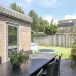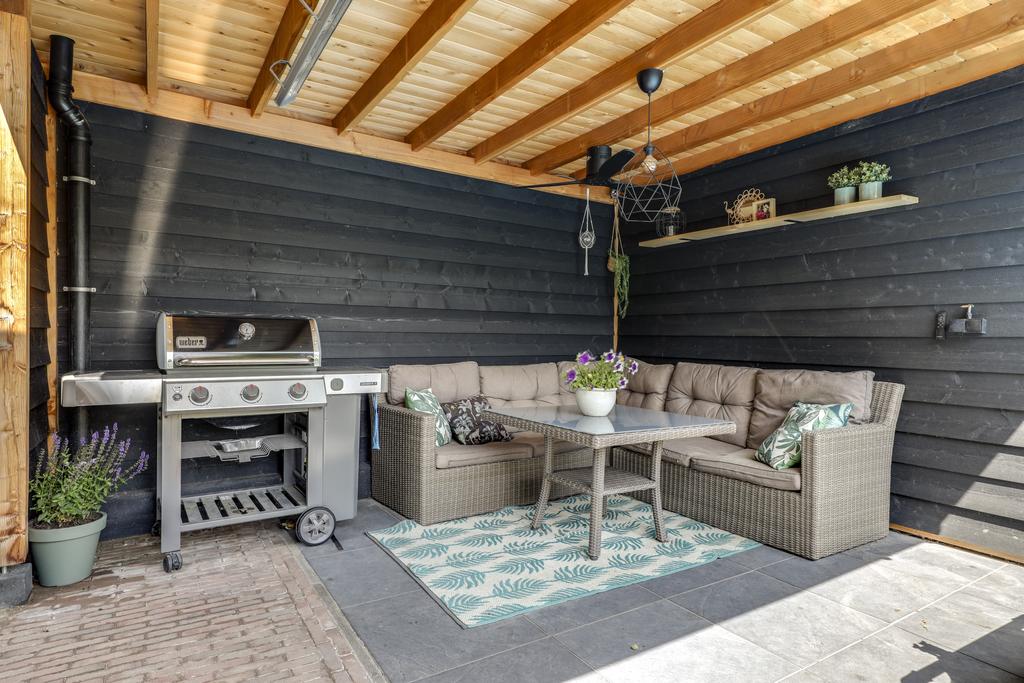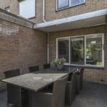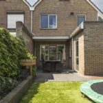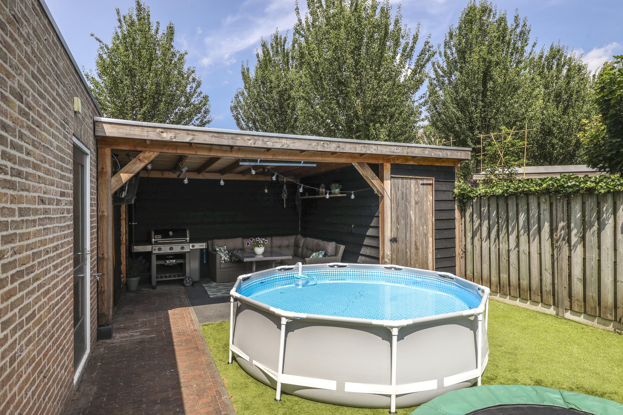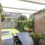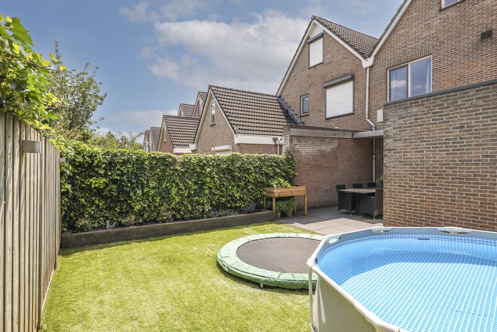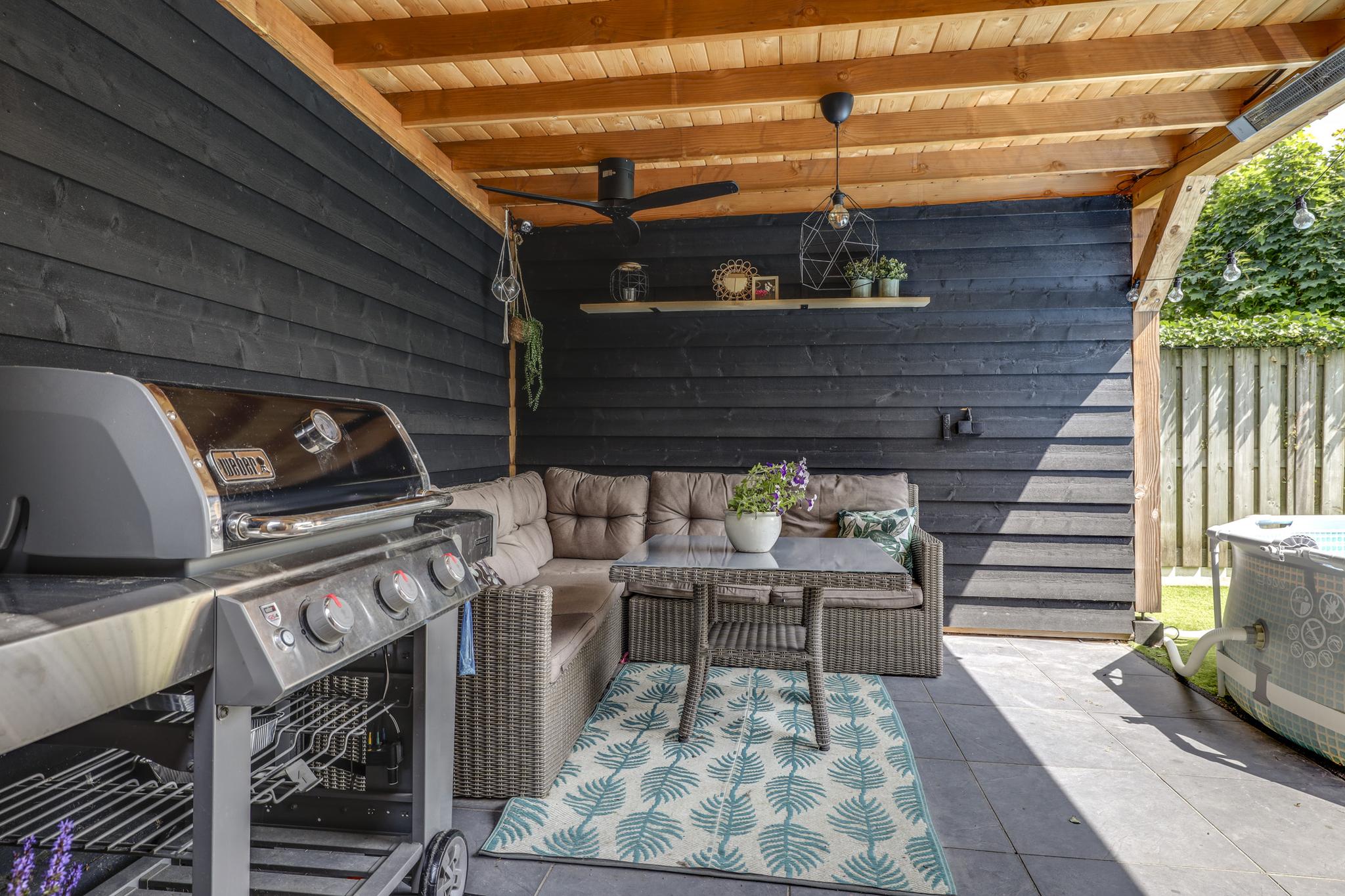 In de achtertuin vind je onder meer een overdekt terras (dak is open te schuiven), een stijlvolle, douglashouten veranda (13m2) en een extra schuur van 8m2 (beiden onder 1 dak). De tuin is onderhoudsarm te noemen met o.a. kunstgras en groot formaat leisteen (60×60). De ingegraven trampoline blijft achter en er is een achterom aanwezig.