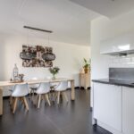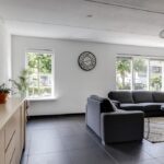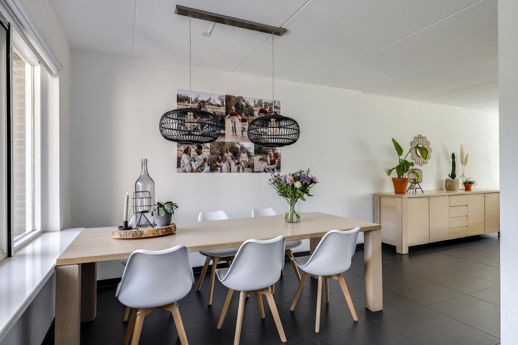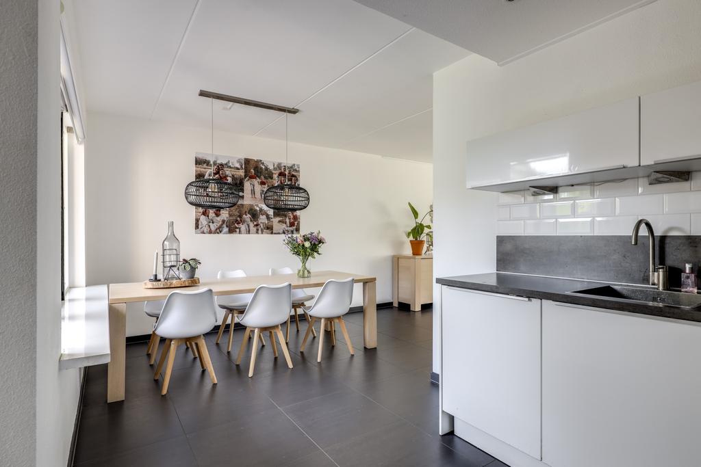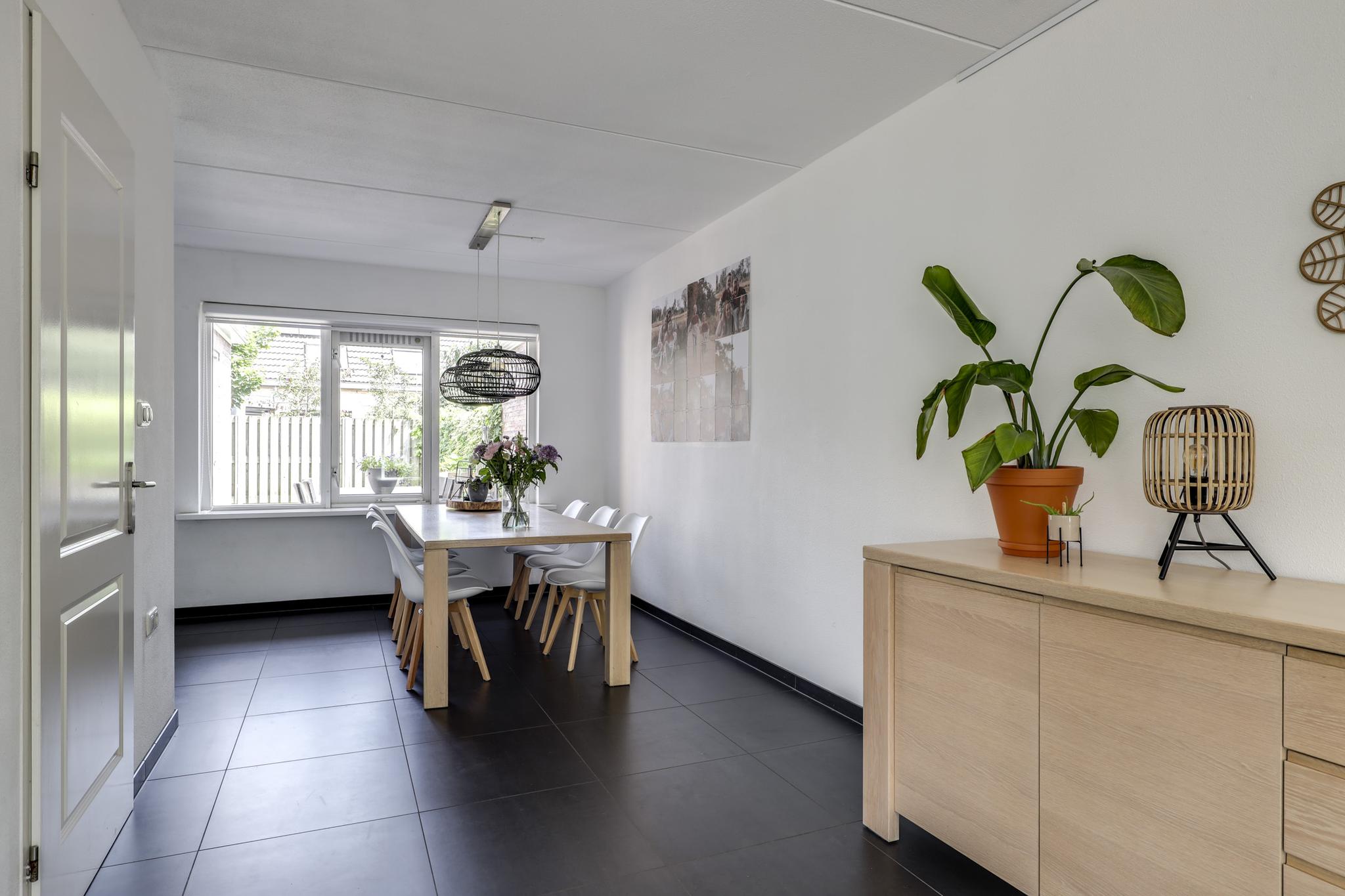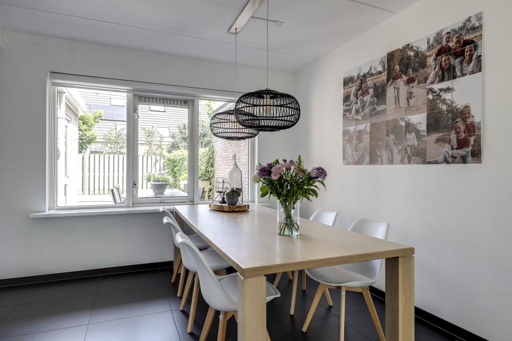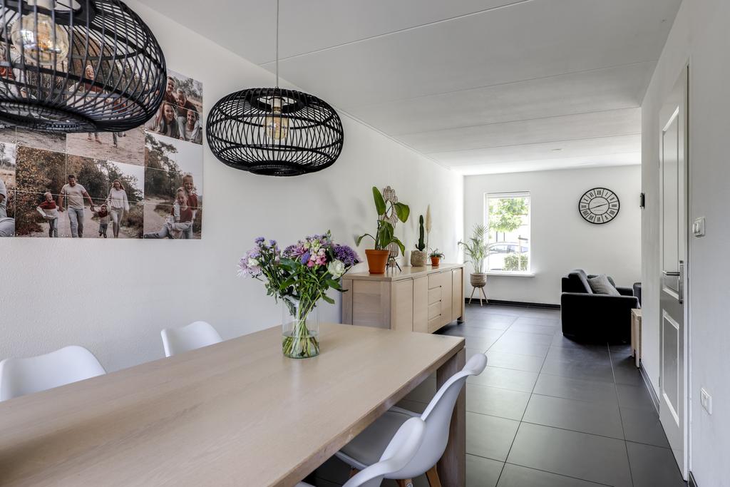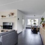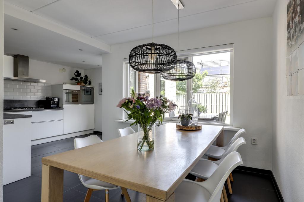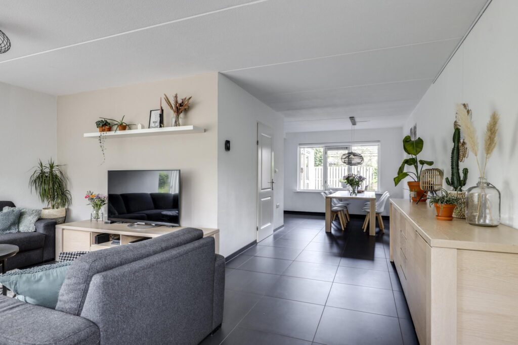 Bij een gezinswoning hoort natuurlijk een ruime woonkamer. Met iets meer dan 40m2 vind je hier de ruimte waar je meerdere zithoeken kunt creëren. De woonkamer is aan de voorzijde gelegen en met een binnenmaat van 5,8 meter kun je hier prima een lekkere hoekbank kwijt. Ramen (waaronder het hoekraam) zorgt daarbij voor een prettige lichtinval. Wanneer je naar achteren loopt, kun je met gemak een 6- tot 8-persoons eettafel kwijt. Wat erg fijn is, is dat er geen radiatoren te vinden zijn. Tijdens de algehele modernisering in 2014 is er een strakke plavuizen vloer (60×60) gelegd welke is voorzien van vloerverwarming (hoofdverwarming). Deze is zelfs doorgelegd in de keuken, hal en toilet.