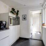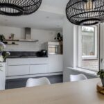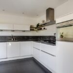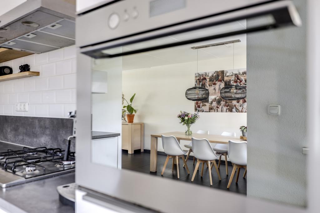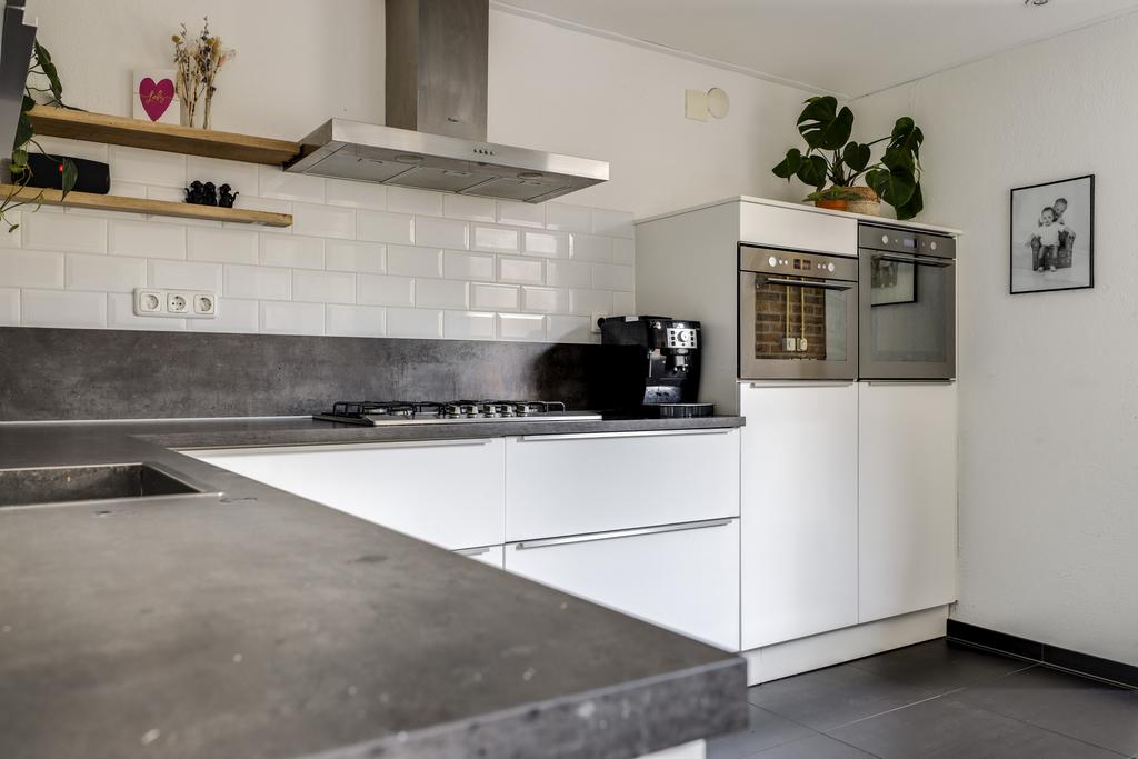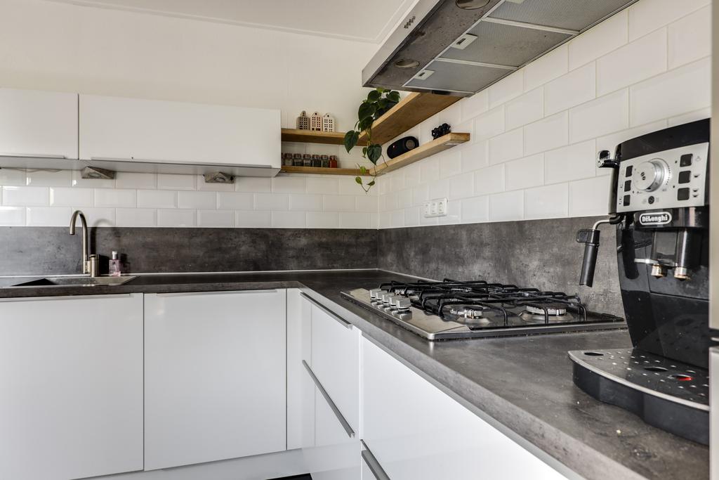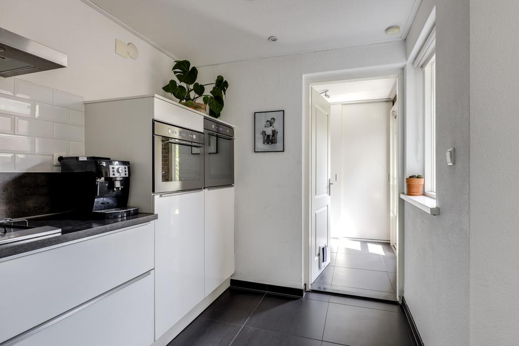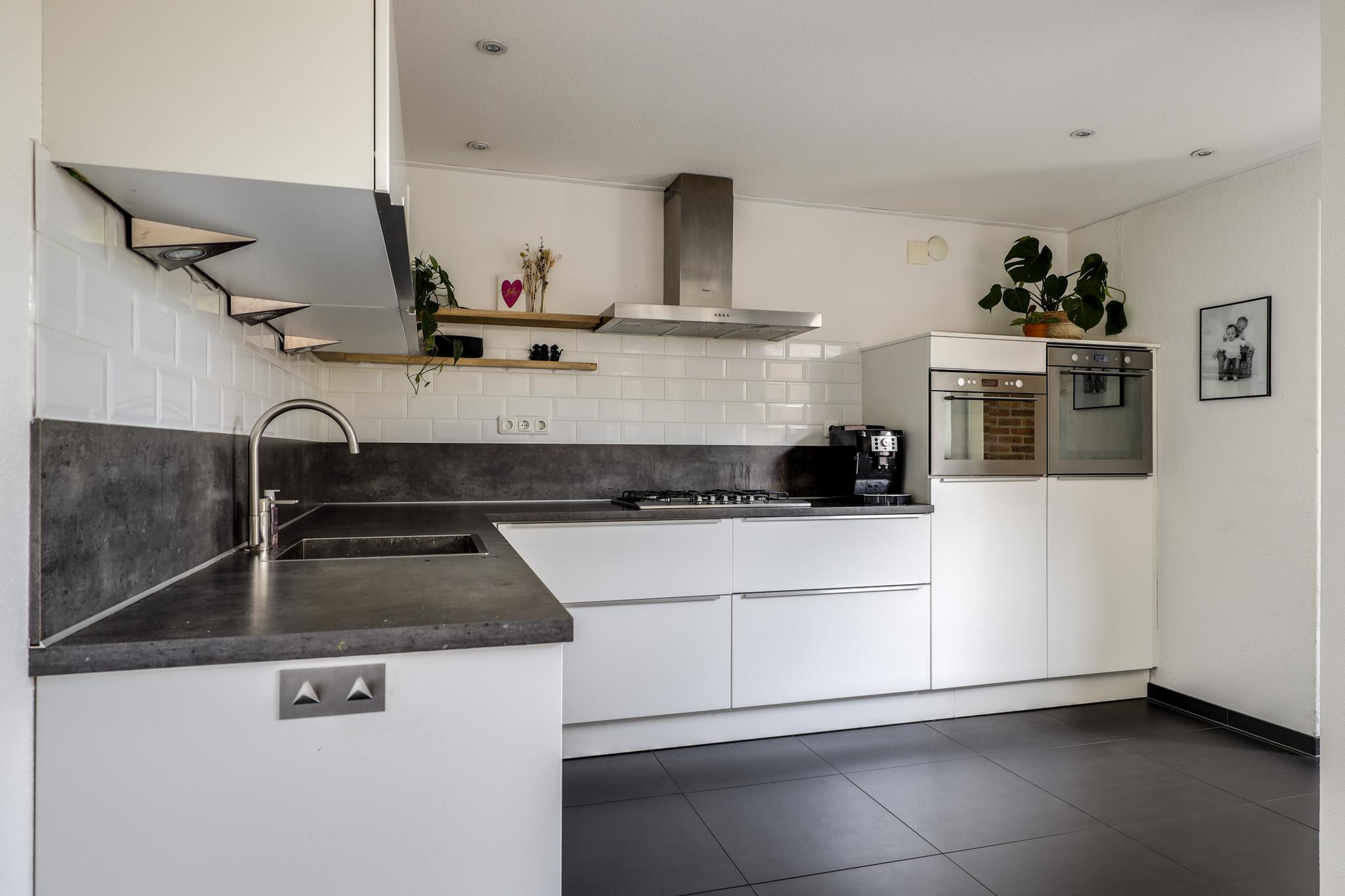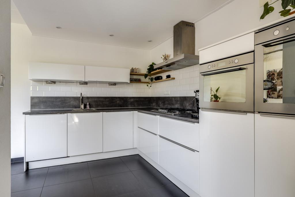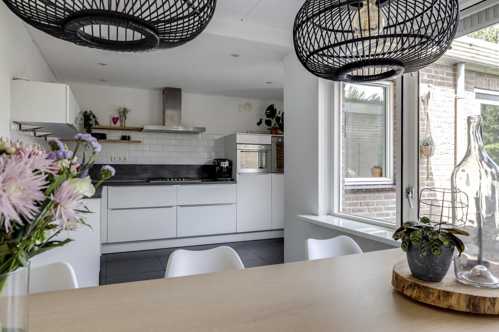 De keuken heeft een open karakter naar de woonkamer wat het ruimtelijke gevoel vergroot. Dit komt ook doordat de keuken verder naar achteren (naar de bijkeuken) doorsteekt waardoor er plaats was voor een uitgebreide hoekopstelling met lang aanrechtblad. De inbouwapparatuur bestaat uit een vaatwasser (2021), een grote oven, een aparte magnetron, een 5-pits gaskookplaat met afzuigschouw en een koelkast. Indien gewenst zou je ook nog een aparte vriezer kunnen inbouwen. Verder heeft de keuken een moderne uitstraling met o.a. hoogglans witte fronten, strakke RVS grepen, brede ladekorven en subtiele bovenkasten met liftdeuren. Om het af te maken is het plafond iets verlaagd en voorzien van inbouwspots.