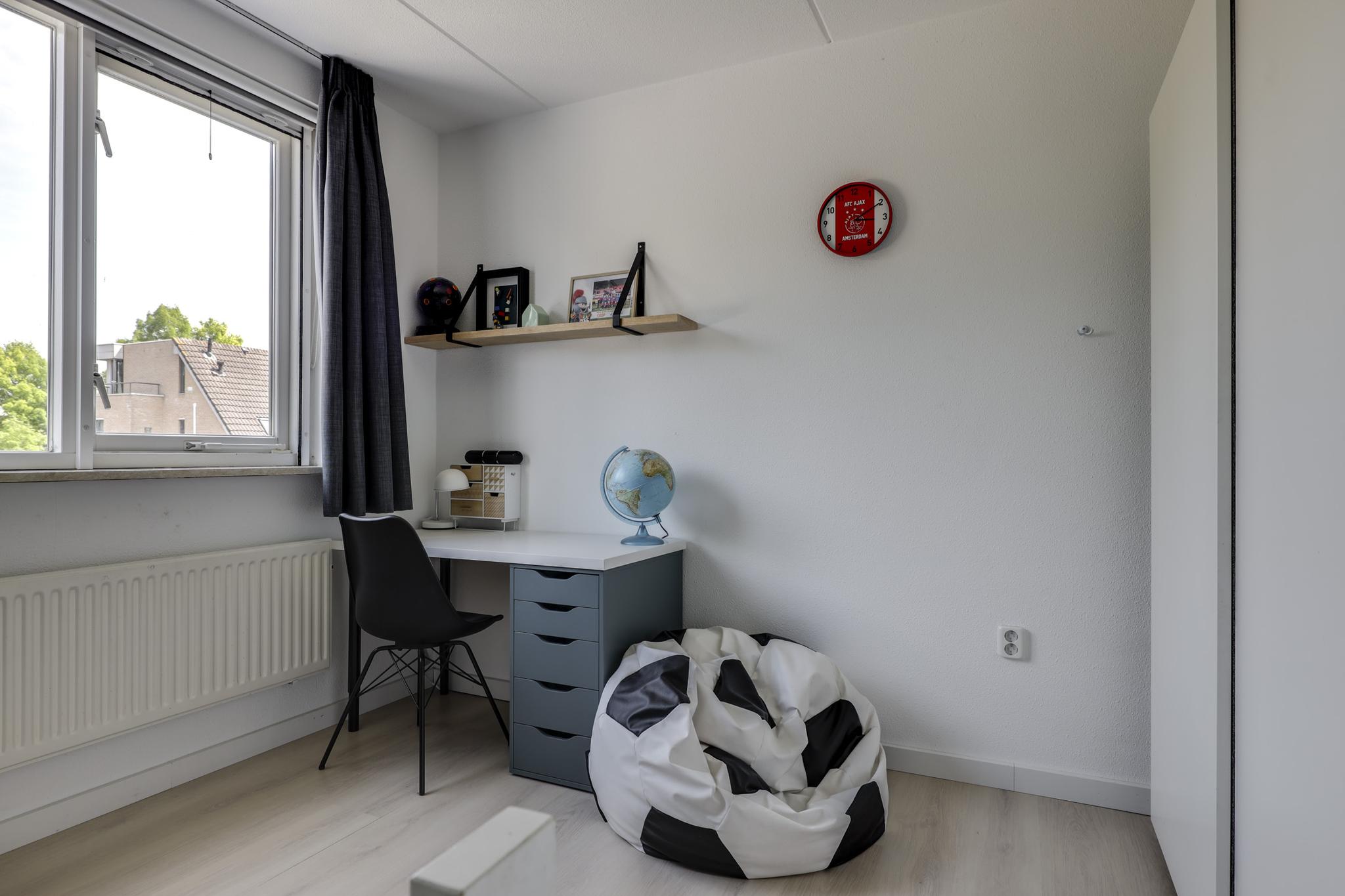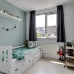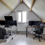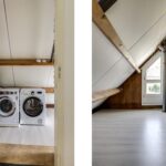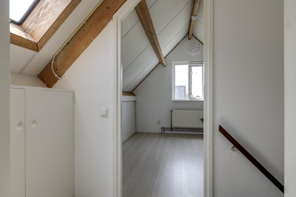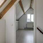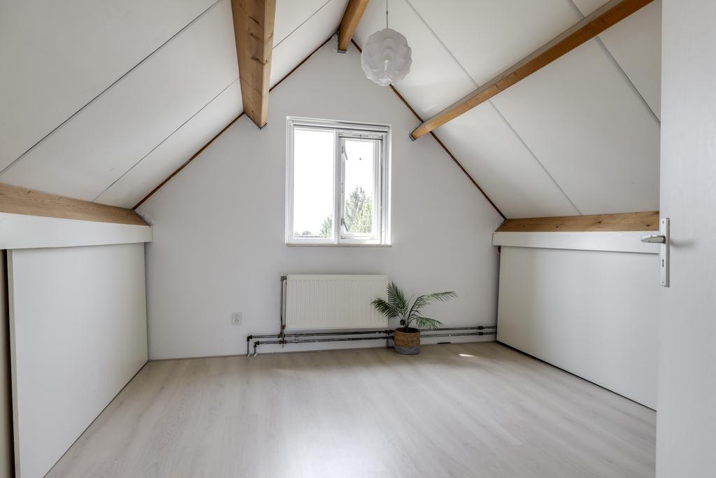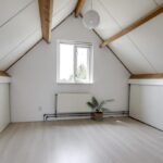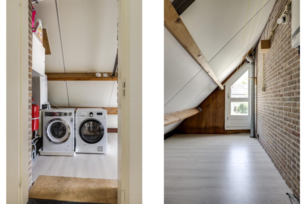 Alle beglazing bestaat uit isolatieglas en de ramen die open kunnen zijn voorzien van rolhorren. Een groot pluspunt is de airco-unit op de overloop die op een warme zomerdag voor verkoeling kan zorgen. Zoals eerder vermeld, is er nog een (verwarmde) ruimte boven de garage te vinden. We noemen dit de wasruimte omdat je hier de wasmachine en wasdroger kwijt kunt. Hoe fijn is het om een aparte was- en strijkkamer te hebben? Overigens zou je hier in de andere hoek ook nog een werkhoek kunnen creëren, wellicht in combinatie met een extra dakvenster of dakkapel. Verder is er een deur aanwezig die toegang verleent tot het (vernieuwde) platte dak.