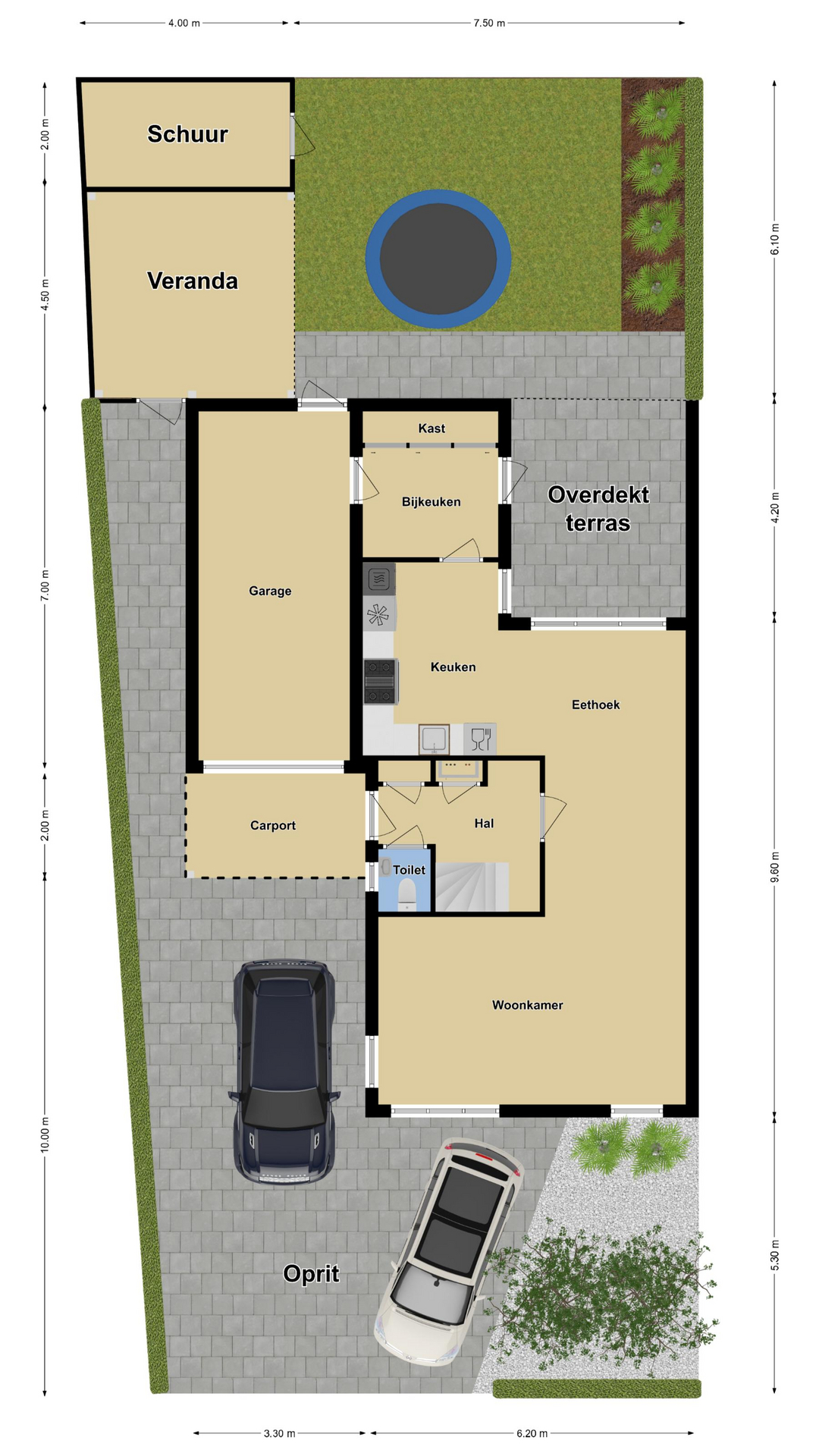 Oprit met plaats voor 3 auto’s waarbij je 2 auto’s naast elkaar kunt parkeren