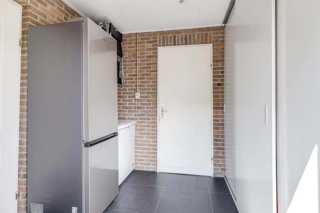 Bij een grote gezinswoning hoort ook een praktische bijkeuken. Dat kom je dus ook hier tegen. De bijkeuken grenst direct aan de keuken en is voorzien van een vaste schuif/kastenwand. Hier kun je veel spullen kwijt zoals voorraad, een stofzuiger en schoonmaakspullen. Aan de andere zijde is er plaats voor diverse witgoedapparaten zoals een vriezer en/of een extra koelkast. Vanuit de bijkeuken is er een doorloop naar de garage waardoor deze van binnenuit toegankelijk is. Een tuindeur geeft toegang tot het (overdekte) buitenterras.
