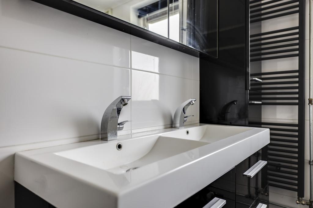 In de verdere afwerking is er gedacht aan inbouwspots in het plafond en een designradiator voor het drogen van handdoeken. In de tegelvloer zijn overigens extra lussen (op de retourleiding van de CV) gelegd waardoor je ook het comfort hebt van vloerverwarming. En niet te vergeten het raam die niet alleen voor daglicht zorgt, maar ook voor de ideale ventilatiemogelijkheid.