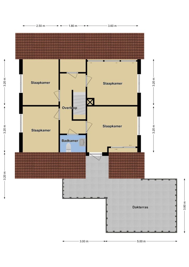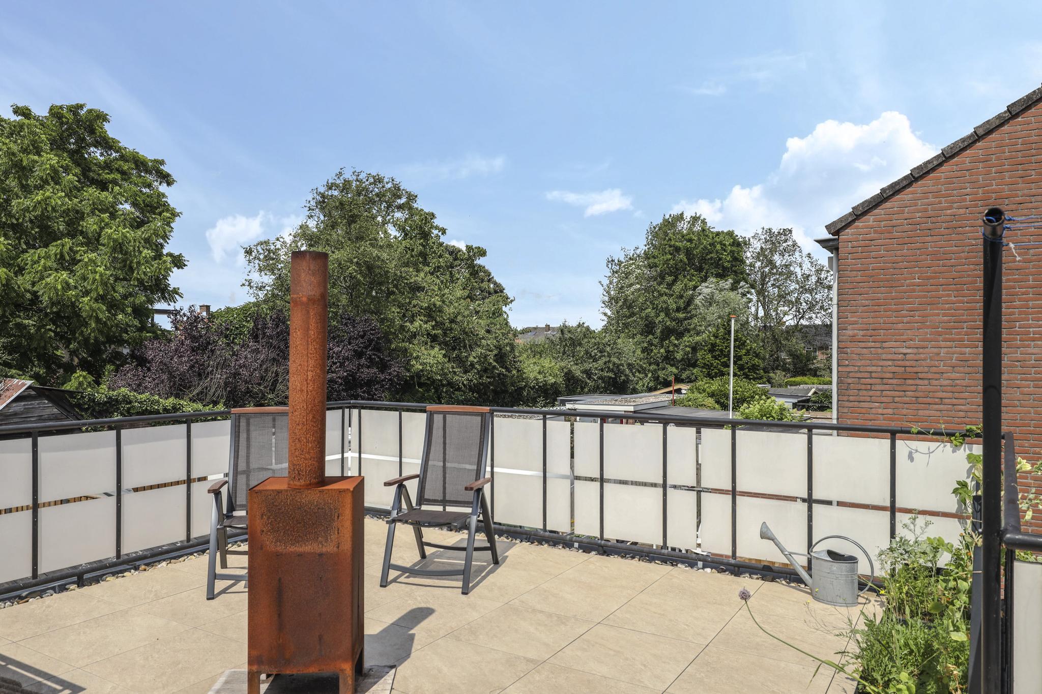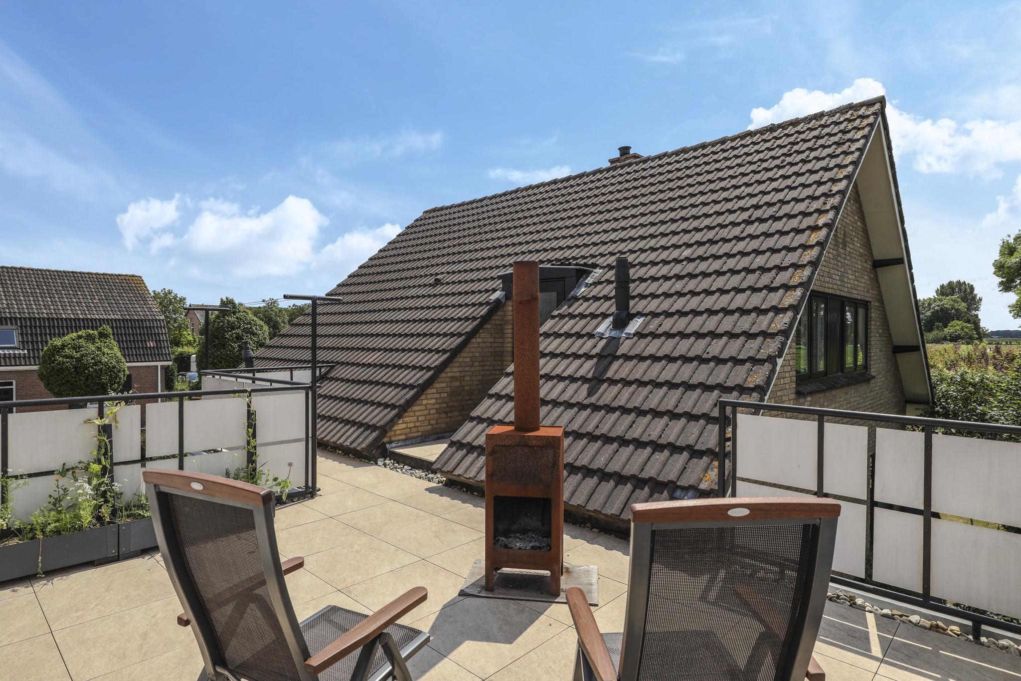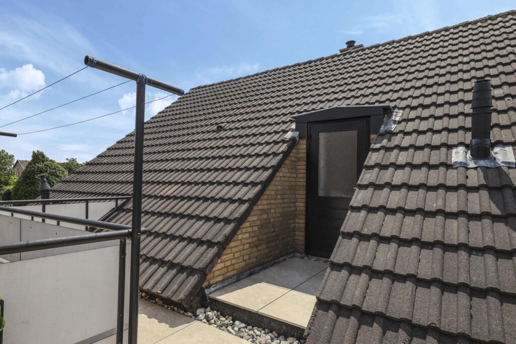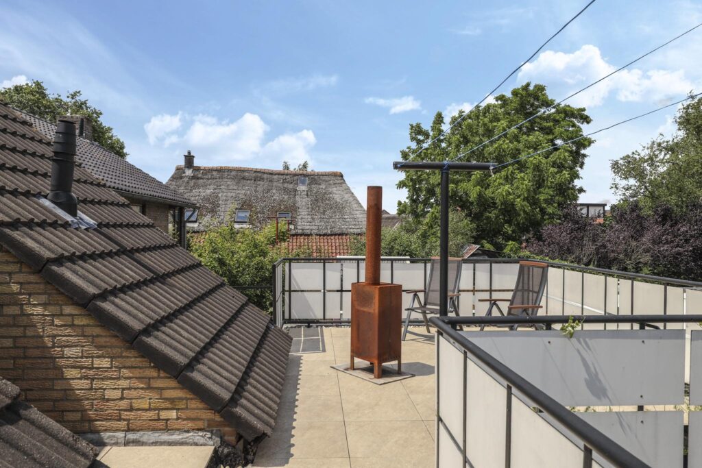 Vanaf een slaapkamer is het dakterras te bereiken, dit dakterras zal je zeker doen verrassen. De ruimte boven de garage wordt hier goed benut waardoor je een extra terras hebt om buiten te kunnen zijn. Hier kun je rustig en beschut van de zon genieten waarbij je uitkijkt over de agrarische velden welke tegenover de woning zijn gelegen.