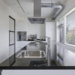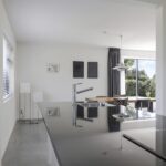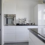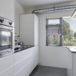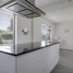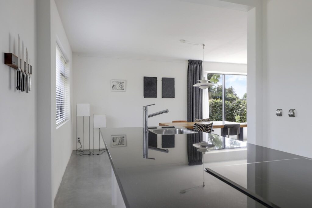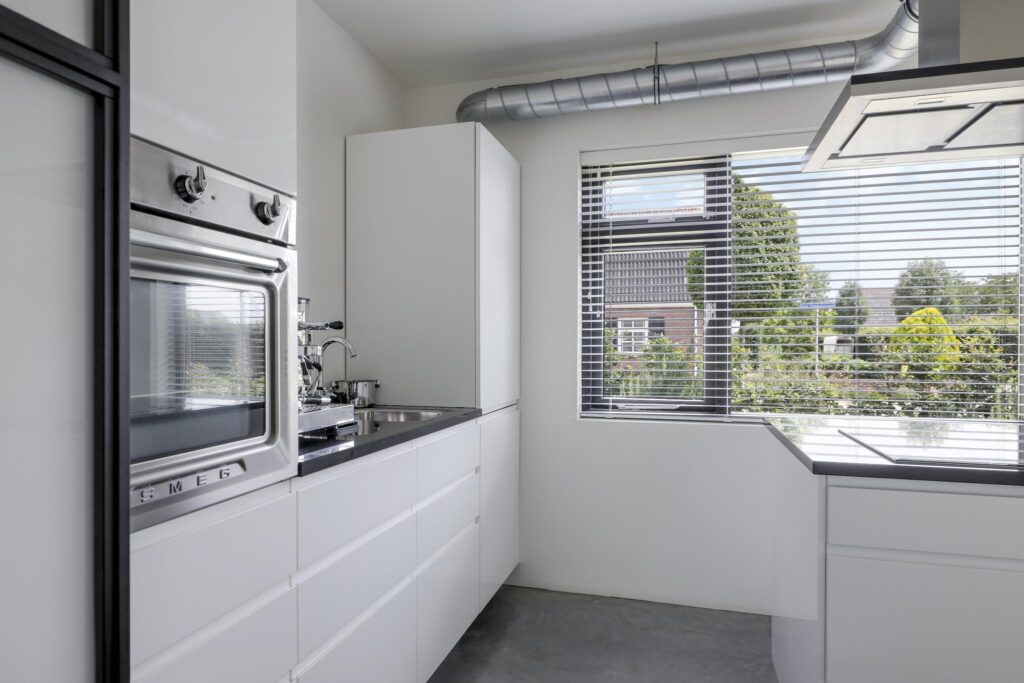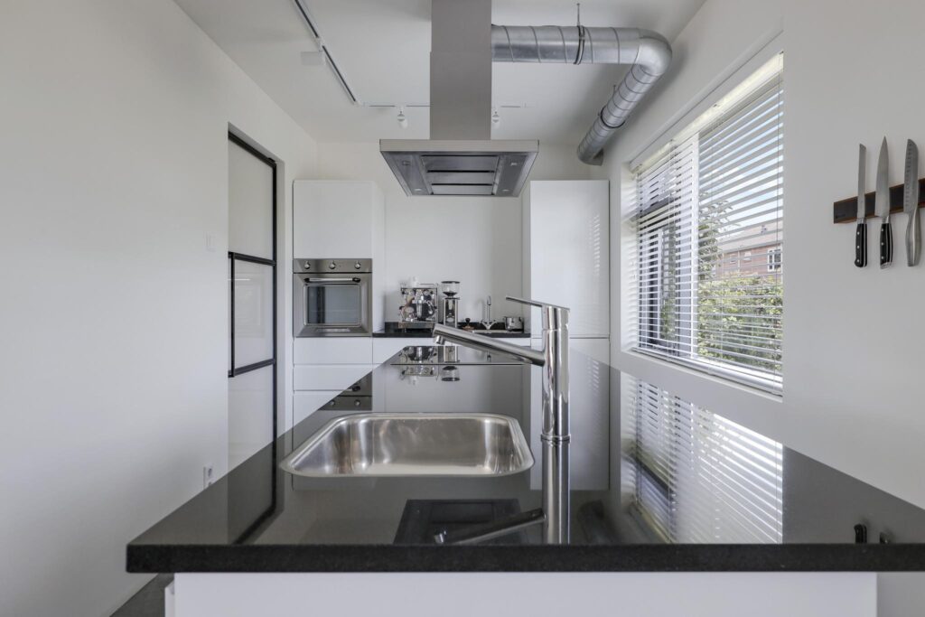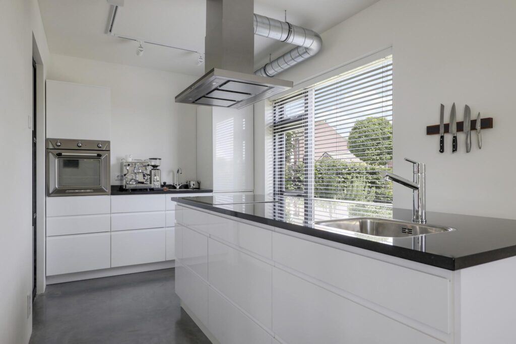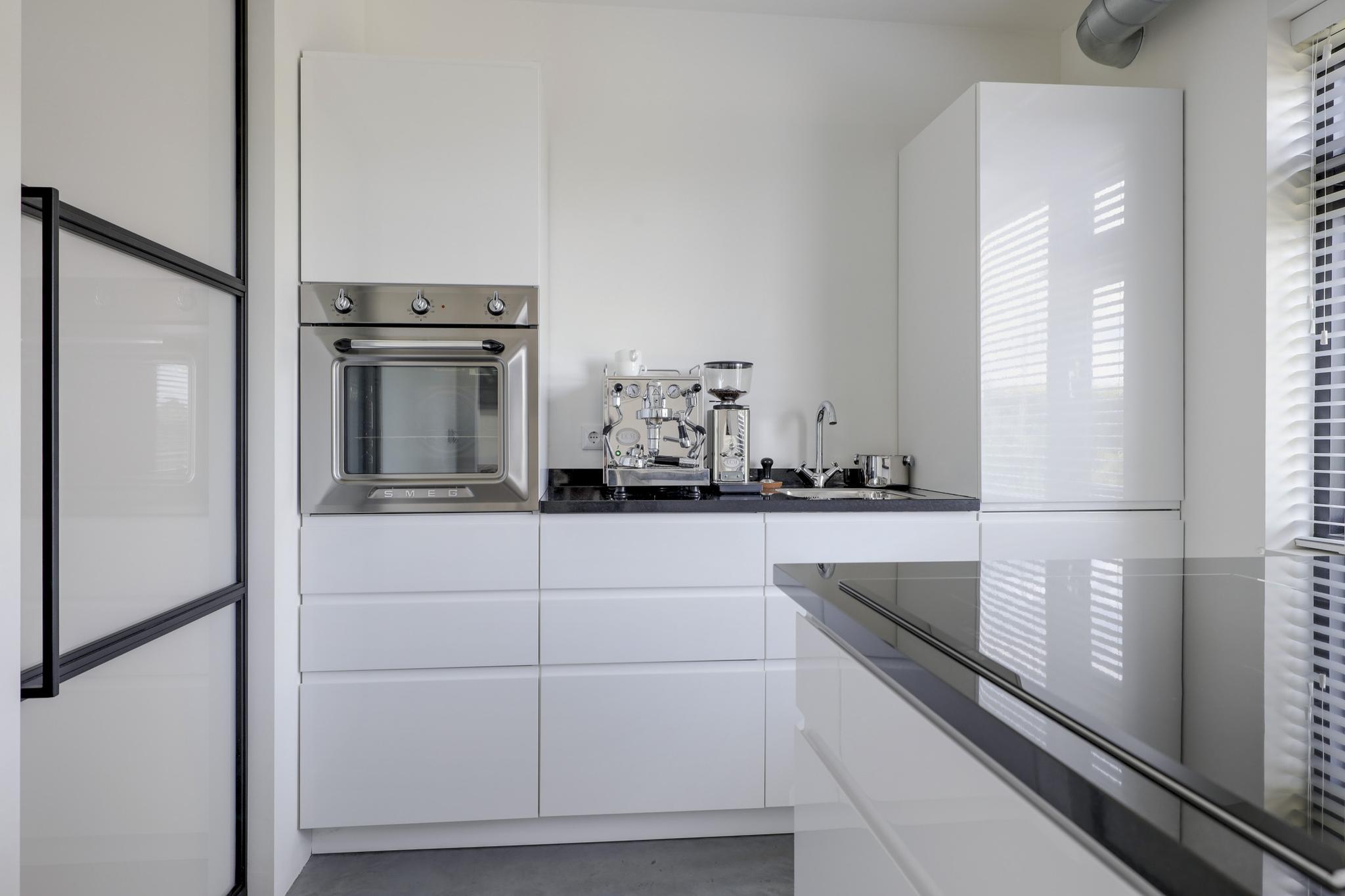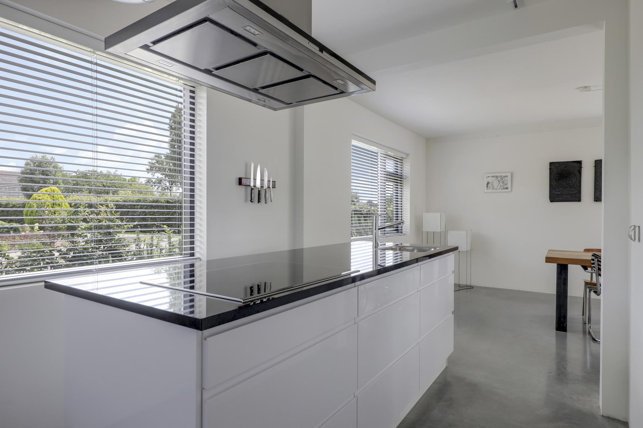 De keuken past geheel in stijl bij de living, de uitstraling is strak en modern. De ruimte wordt volledig benut door het grote kookeiland met inductie kookplaat. Tegen de achterwand is een 2e keukenblok geplaatst, hier tref je de koelkast, vriezer en een oven. Opvallend detail is dat beide keukenblokken zijn voorzien van een wasbak. Door de huidige opstelling is er veel opbergruimte aanwezig. De fronten zijn wit en greeploos, wat mooi afsteekt bij het zwarte granieten aanrechtblad.