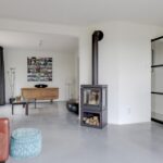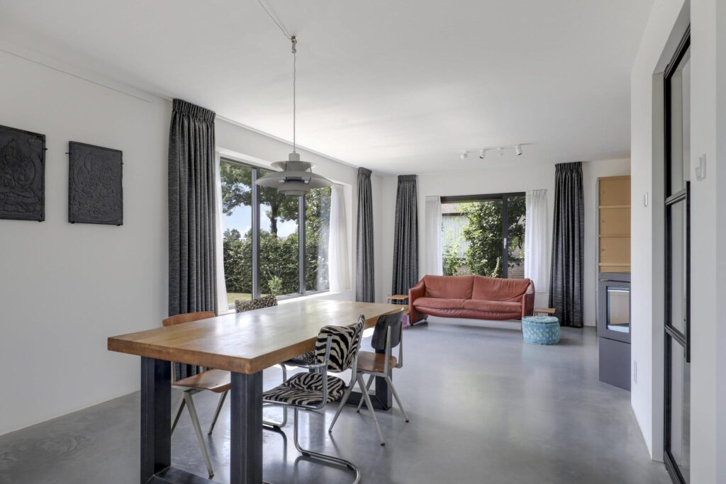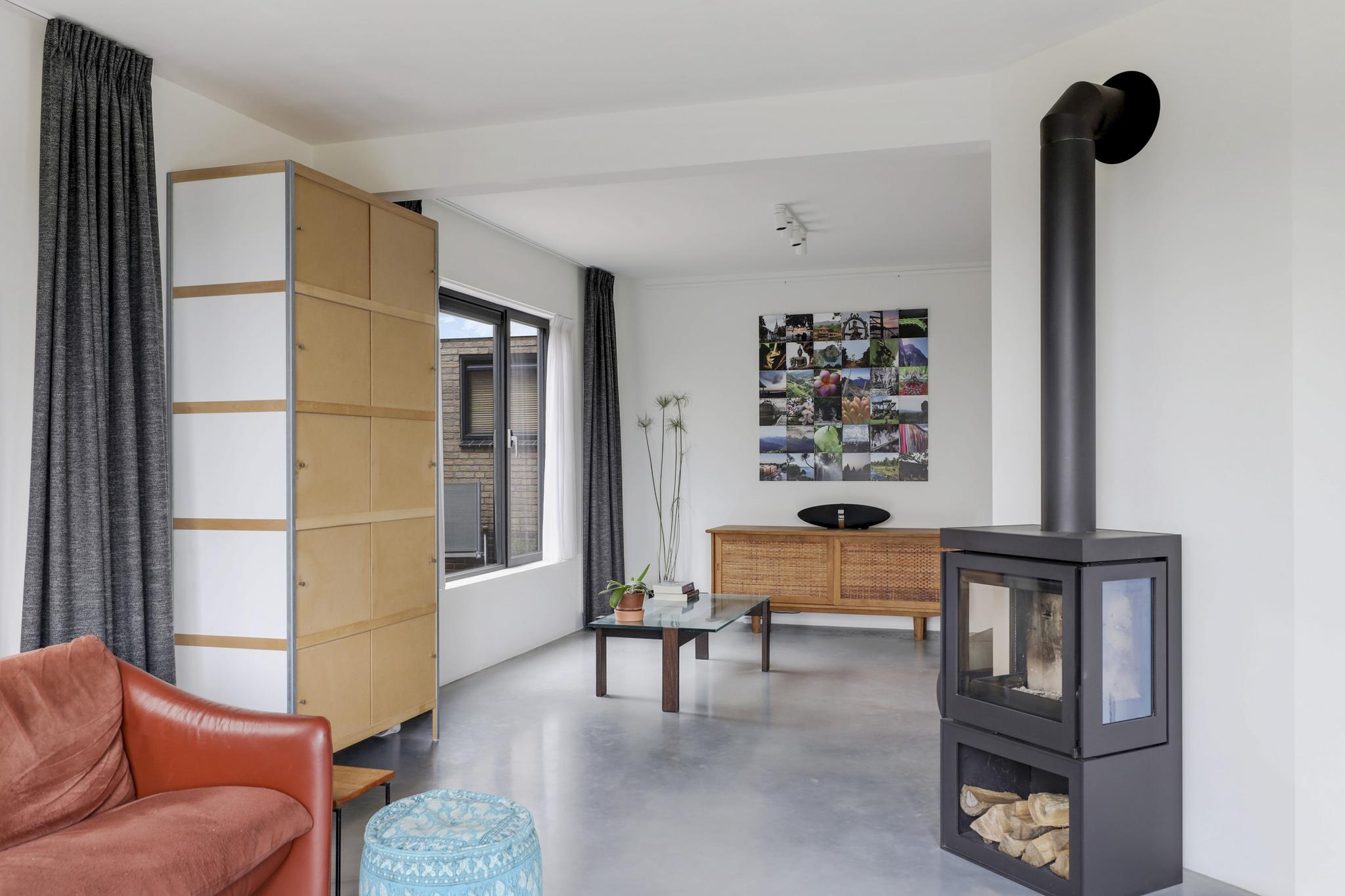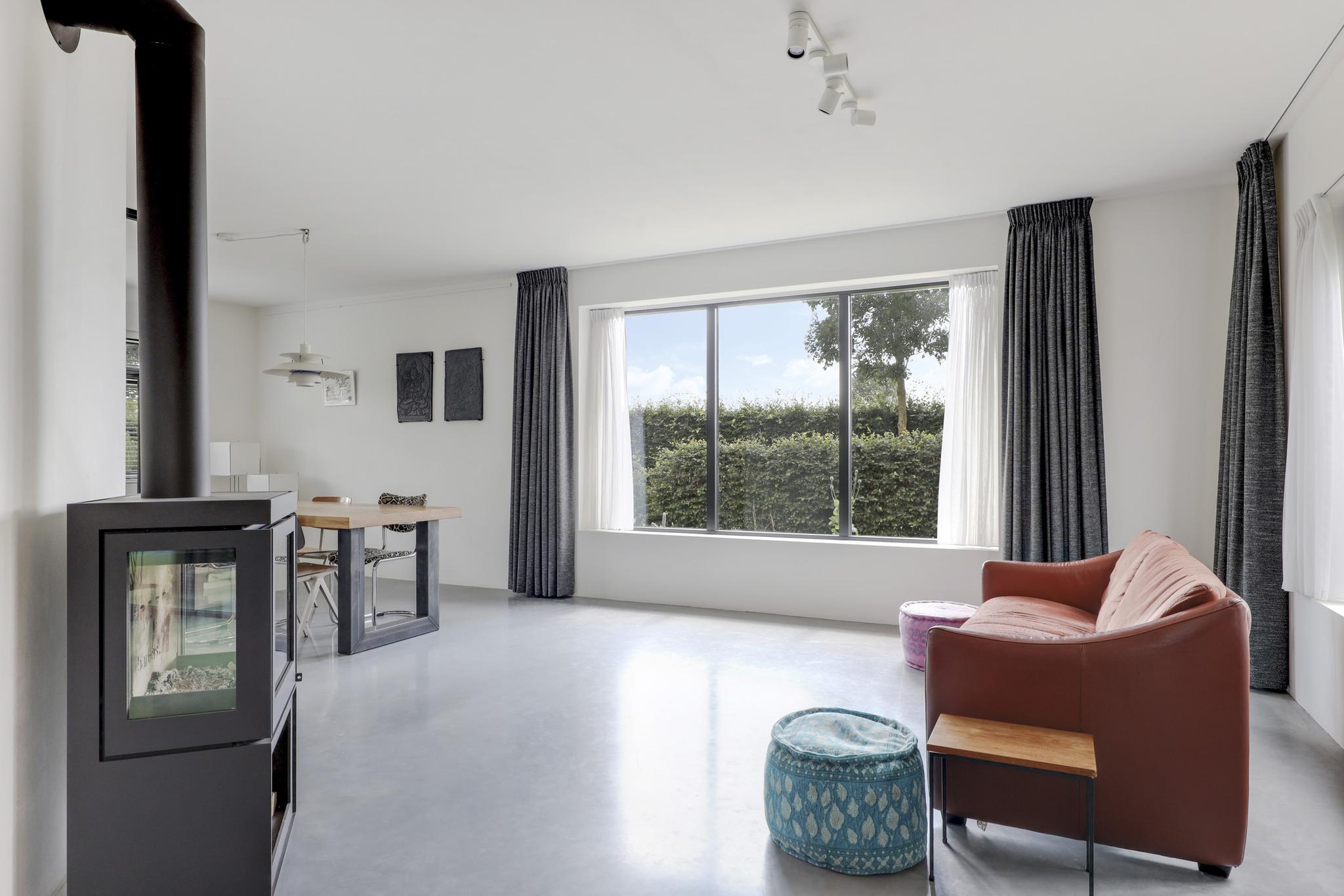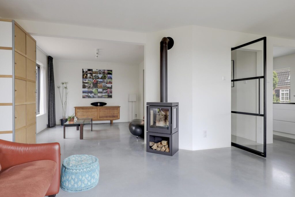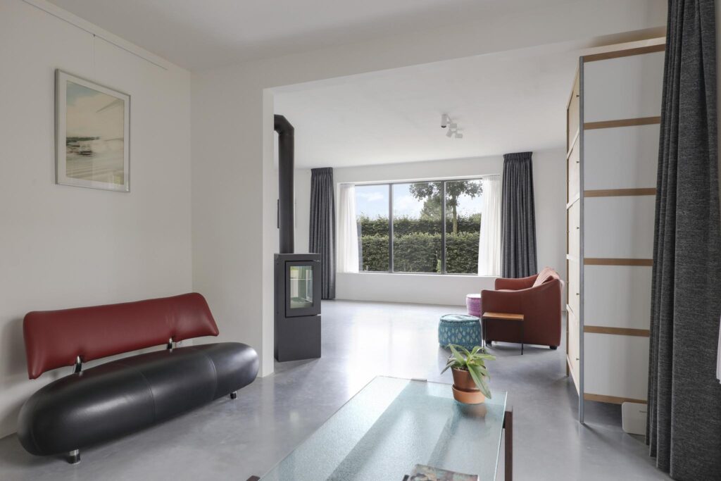 Houd je van een modern en strak interieur? Dan zal deze living je zeker aanspreken. De constructievloer is vervangen door een geïsoleerde betonvloer met vloerverwarming welke aangenaam aanvoelt. De afwerking met een gietvloer geeft de ruimte een strakke uitstraling. Tussen de living en de hal zijn trendy stalen deuren geplaatst. Een leuk detail is dat je vanuit de hal meerdere toegangen hebt tot de living. Grote raampartijen geven de ruimte veel lichtinval, de houtkachel zorgt voor veel sfeer op een koude winterdag.