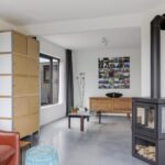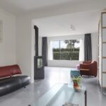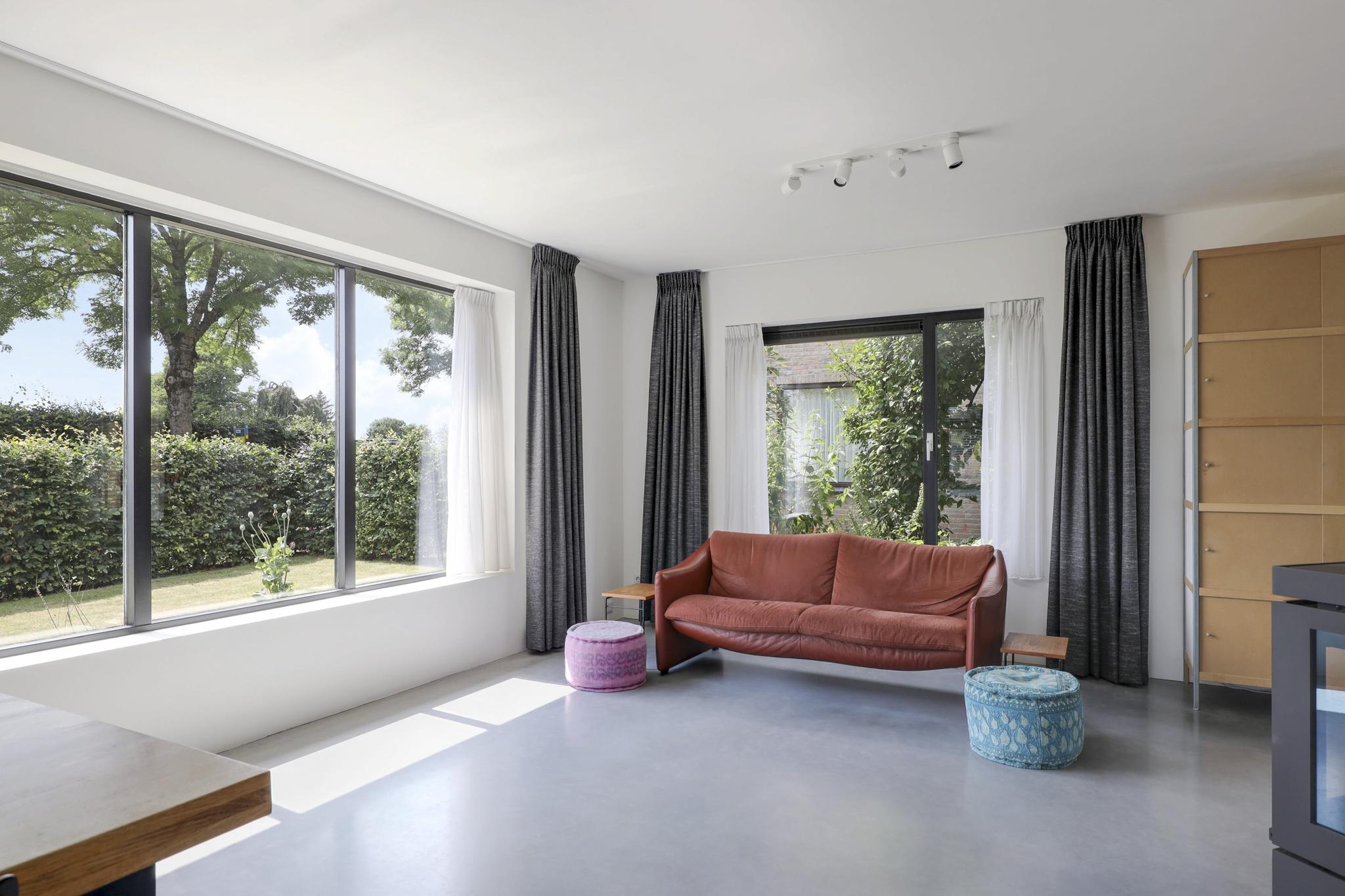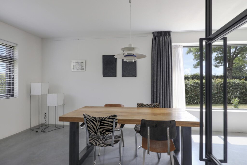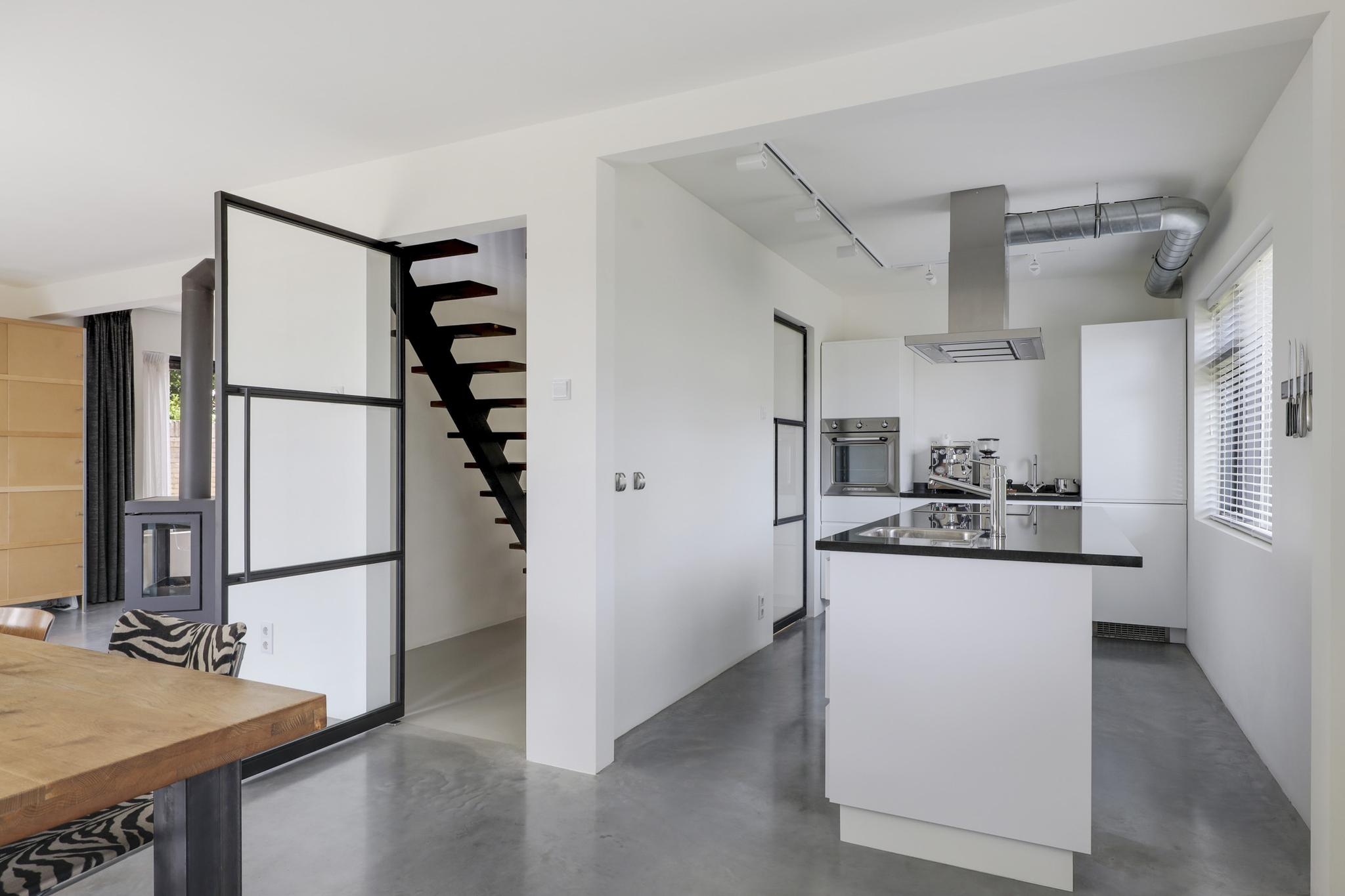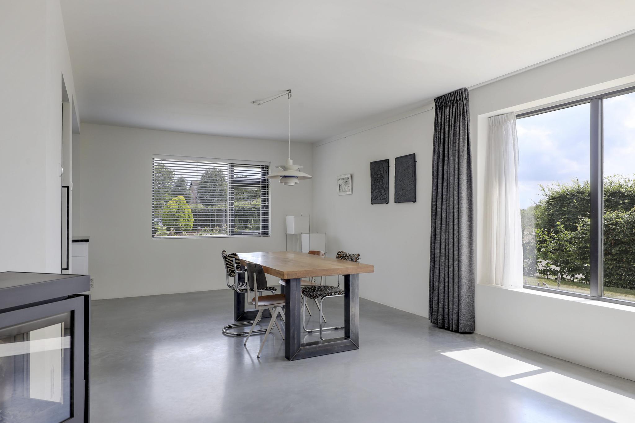 Houd je van een modern en strak interieur? Dan zal deze living je zeker aanspreken. De constructievloer is vervangen door een geïsoleerde betonvloer met vloerverwarming welke aangenaam aanvoelt. De afwerking met een gietvloer geeft de ruimte een strakke uitstraling. Tussen de living en de hal zijn trendy stalen deuren geplaatst. Een leuk detail is dat je vanuit de hal meerdere toegangen hebt tot de living. Grote raampartijen geven de ruimte veel lichtinval, de houtkachel zorgt voor veel sfeer op een koude winterdag.