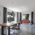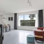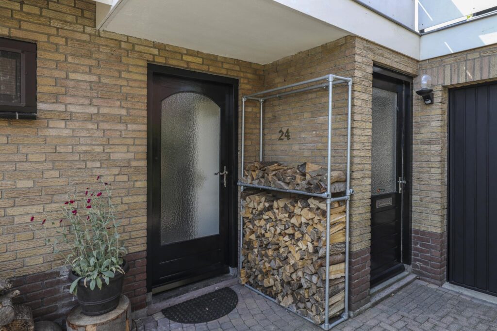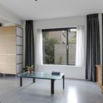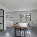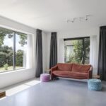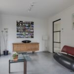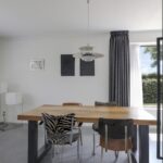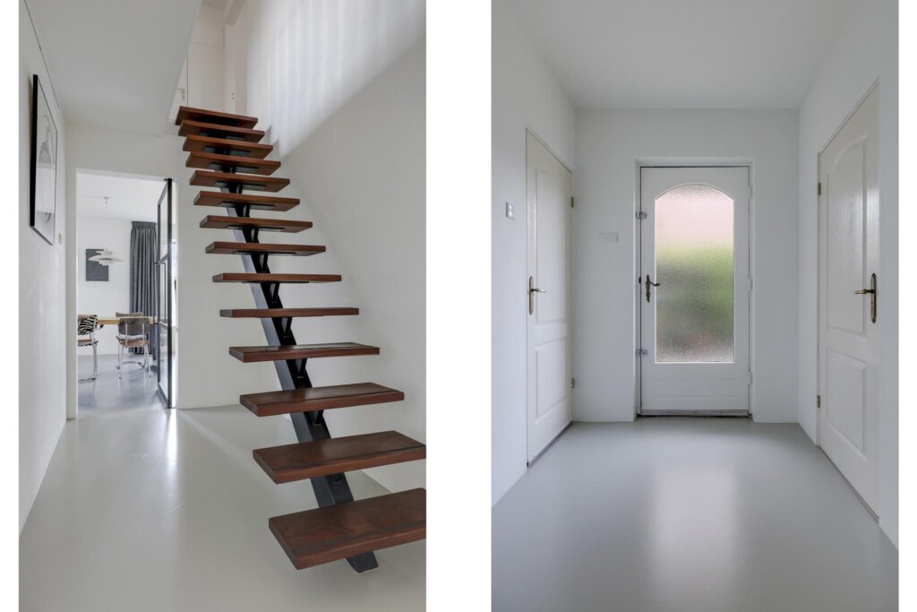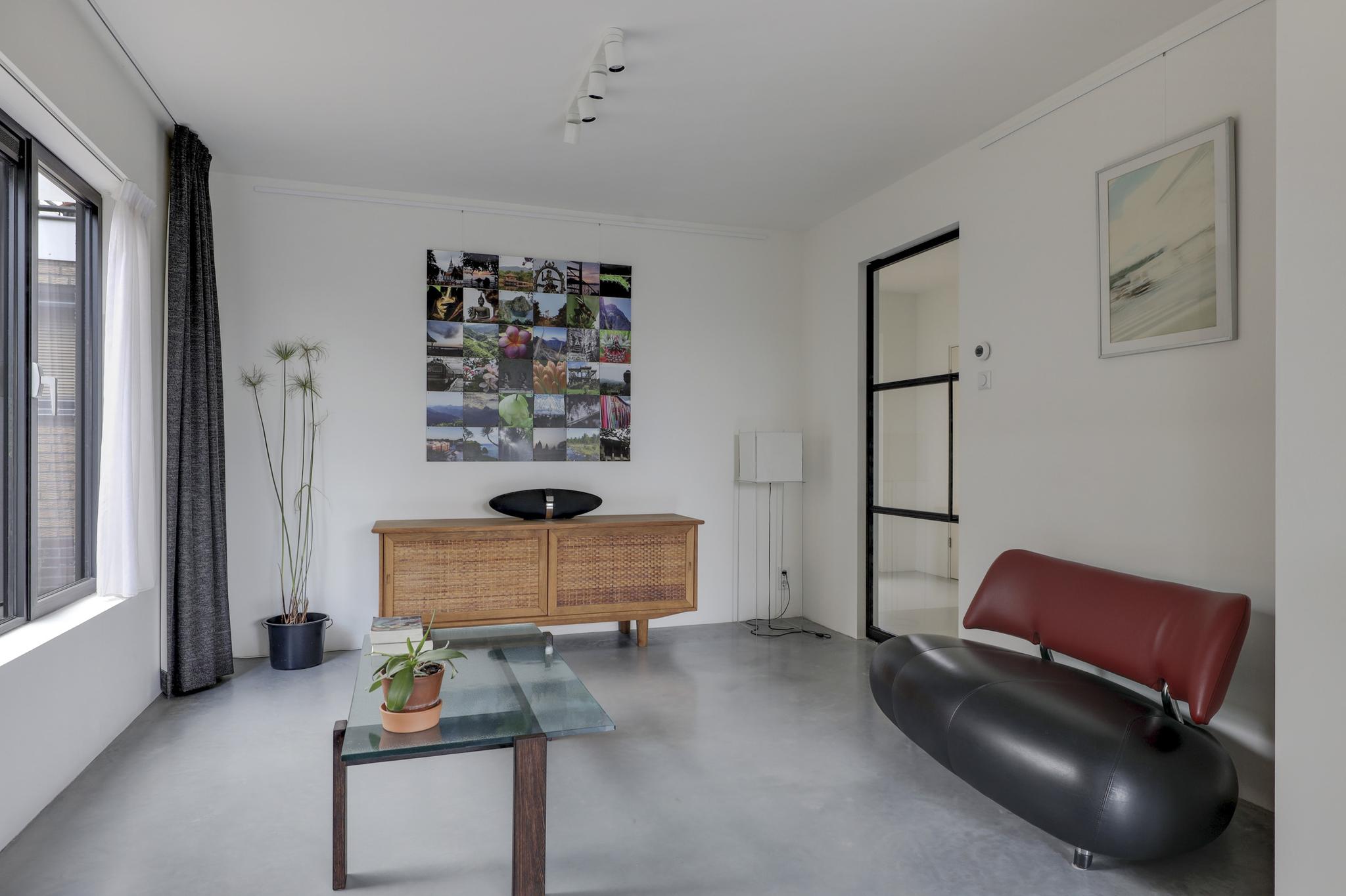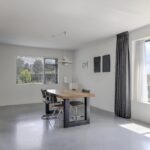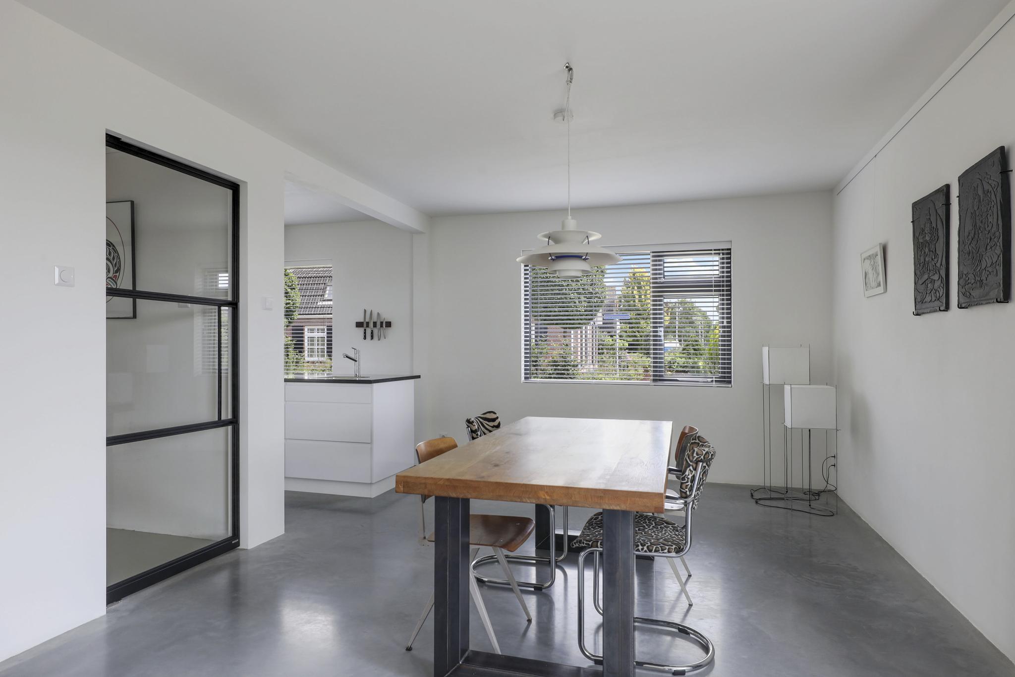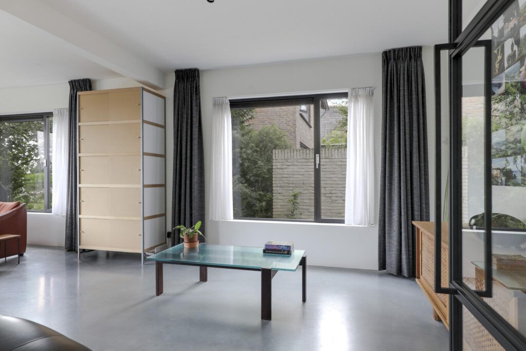 Houd je van een modern en strak interieur? Dan zal deze living je zeker aanspreken. De constructievloer is vervangen door een geïsoleerde betonvloer met vloerverwarming welke aangenaam aanvoelt. De afwerking met een gietvloer geeft de ruimte een strakke uitstraling. Tussen de living en de hal zijn trendy stalen deuren geplaatst. Een leuk detail is dat je vanuit de hal meerdere toegangen hebt tot de living. Grote raampartijen geven de ruimte veel lichtinval, de houtkachel zorgt voor veel sfeer op een koude winterdag.