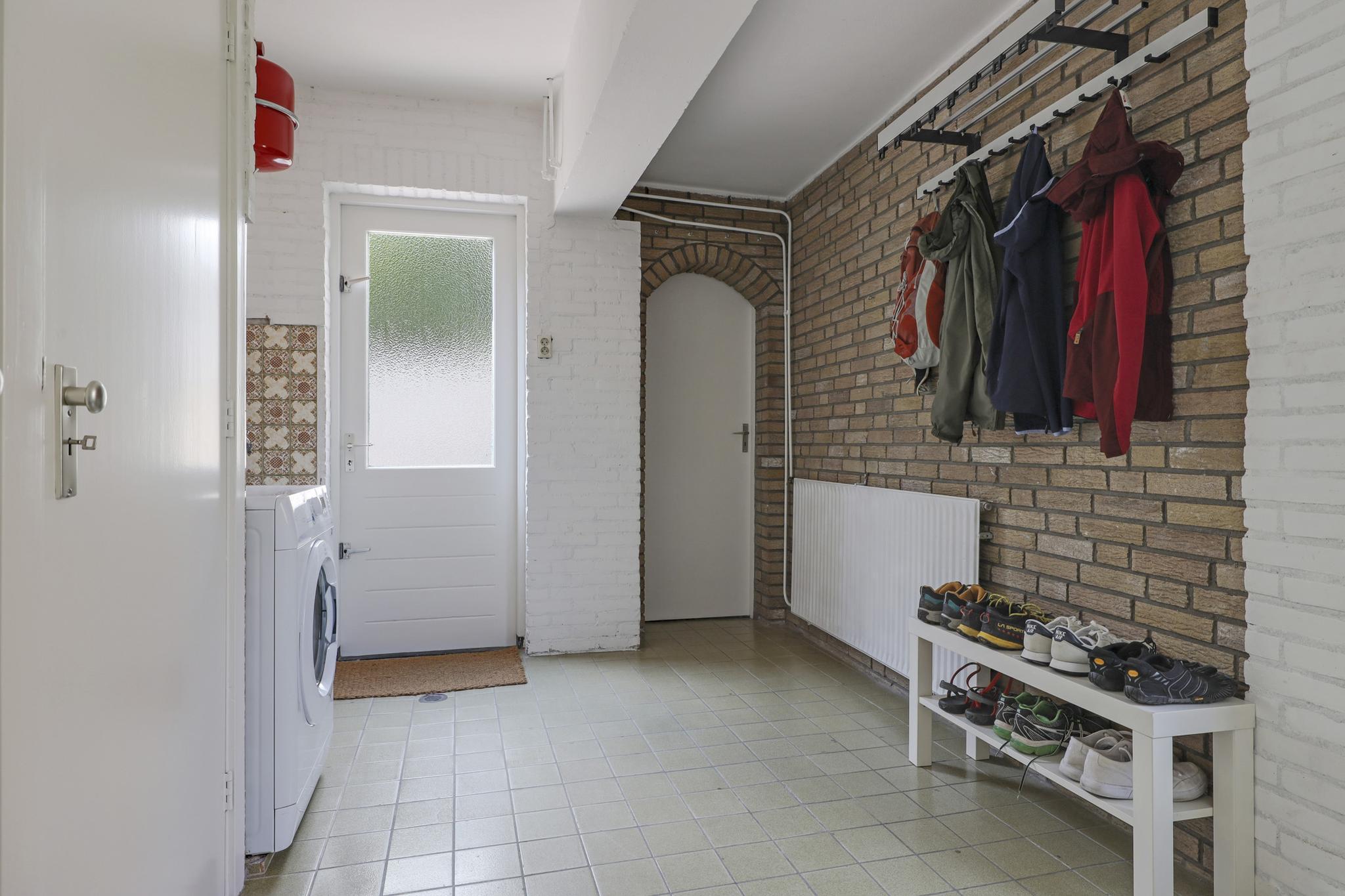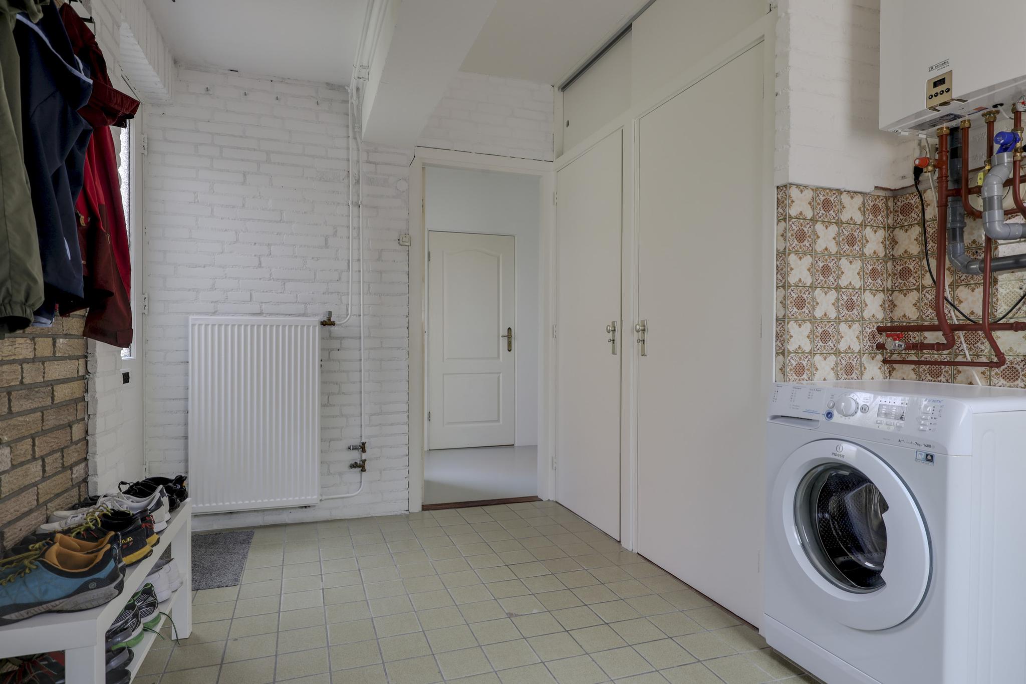 Vanuit de hal is de bijkeuken te bereiken. Dit is een praktische ruimte doordat je hier ruimte hebt voor een extra koelkast of vriezer. Tevens vind je hier de witgoedaansluitingen en de opstelling van de cv-ketel terug. Vanuit de bijkeuken is er toegang richting de achtertuin en de oprit. Ook is de garage middels de bijkeuken binnendoor te bereiken.