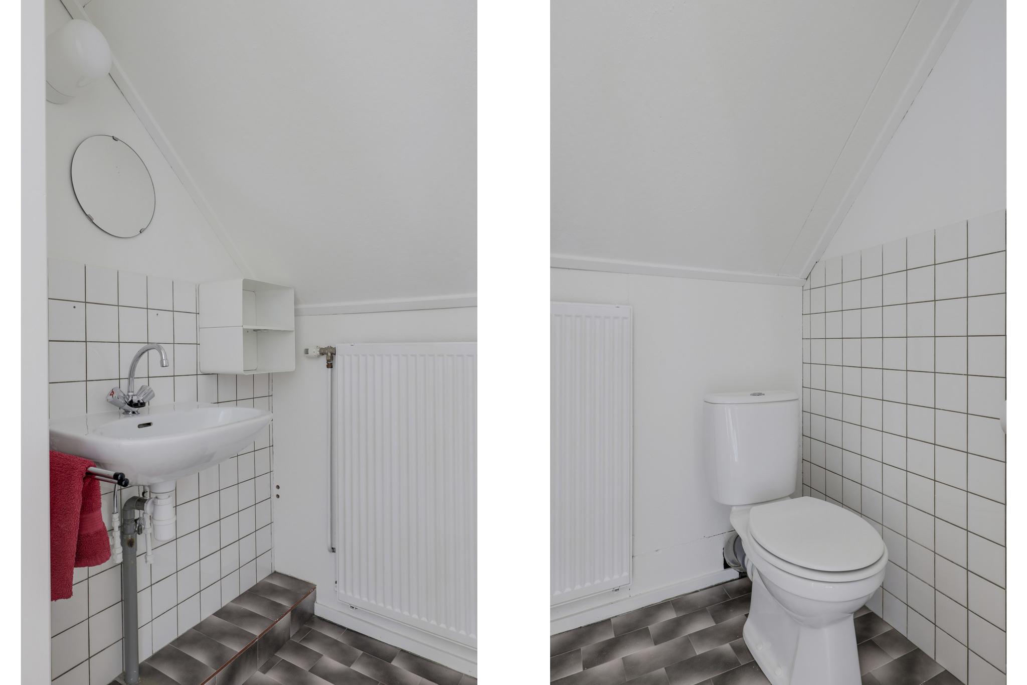 De badkamer is op de begane grond gelegen. Mocht je het wensen dat zou je uiteraard kunnen overwegen de badkamer naar de 1e verdieping te verplaatsen. De badkamer grenst aan de hal en is voorzien van een neutrale uitstraling met licht tegelwerk. De ruimte is compleet ingedeeld met een bad, een douche, een wastafelmeubel en een toilet. Boven het wastafelmeubel is een grote spiegel met verlichting geplaatst. Het hooggeplaatste raam zorgt voor een fijne lichtinval en een mogelijkheid tot ventileren, er is tevens mechanische ventilatie aanwezig.
