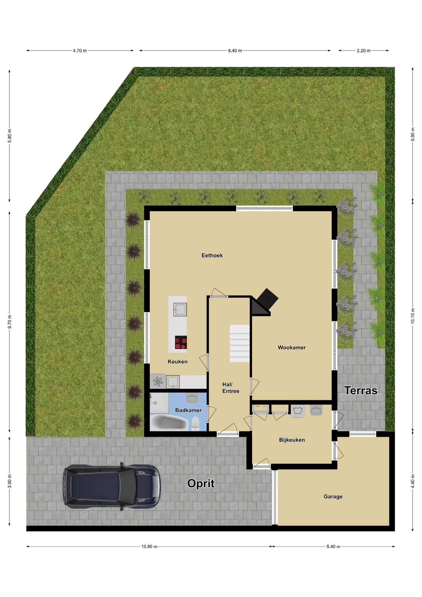 Groen aangelegde tuin rondom de woning