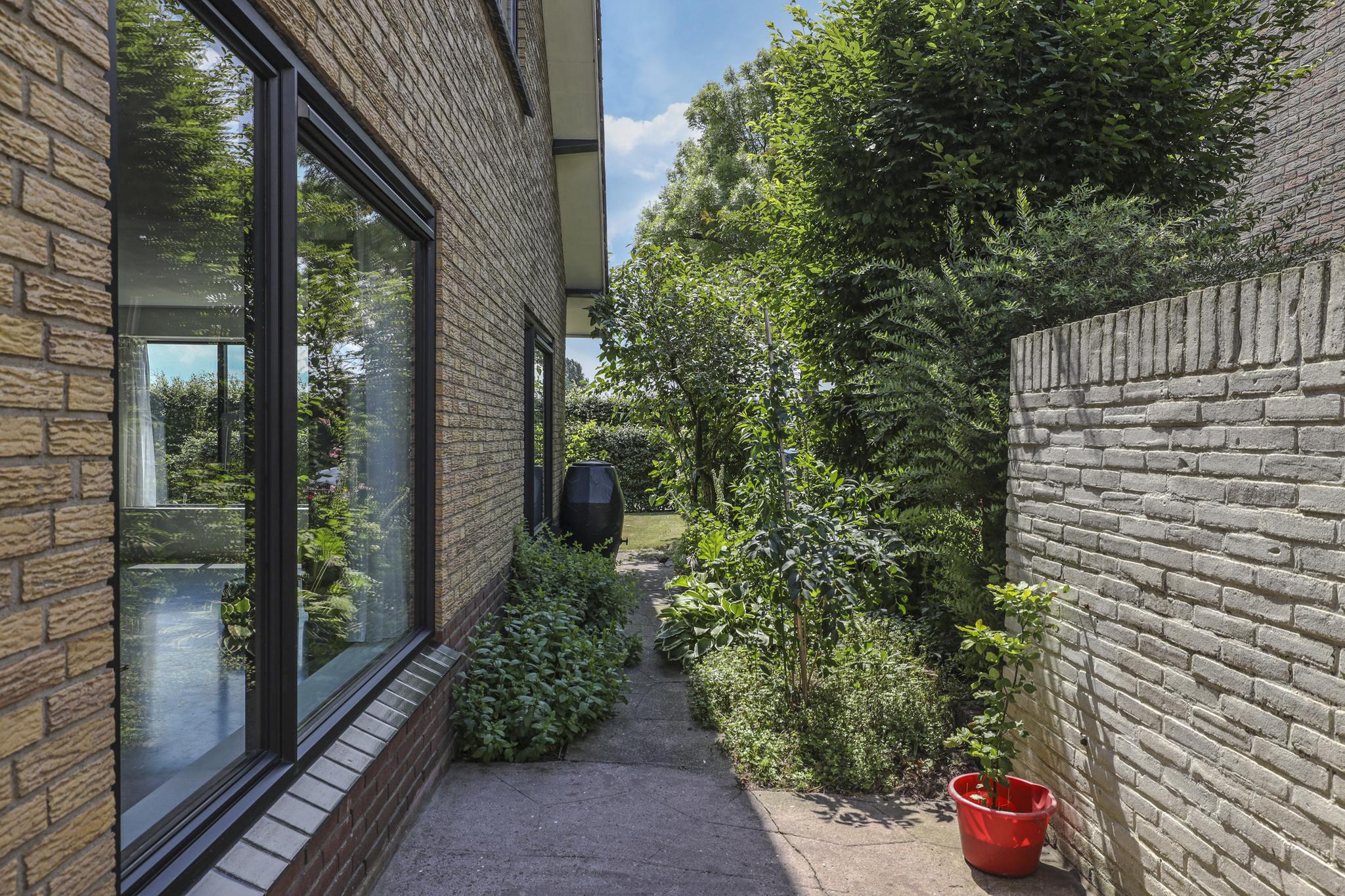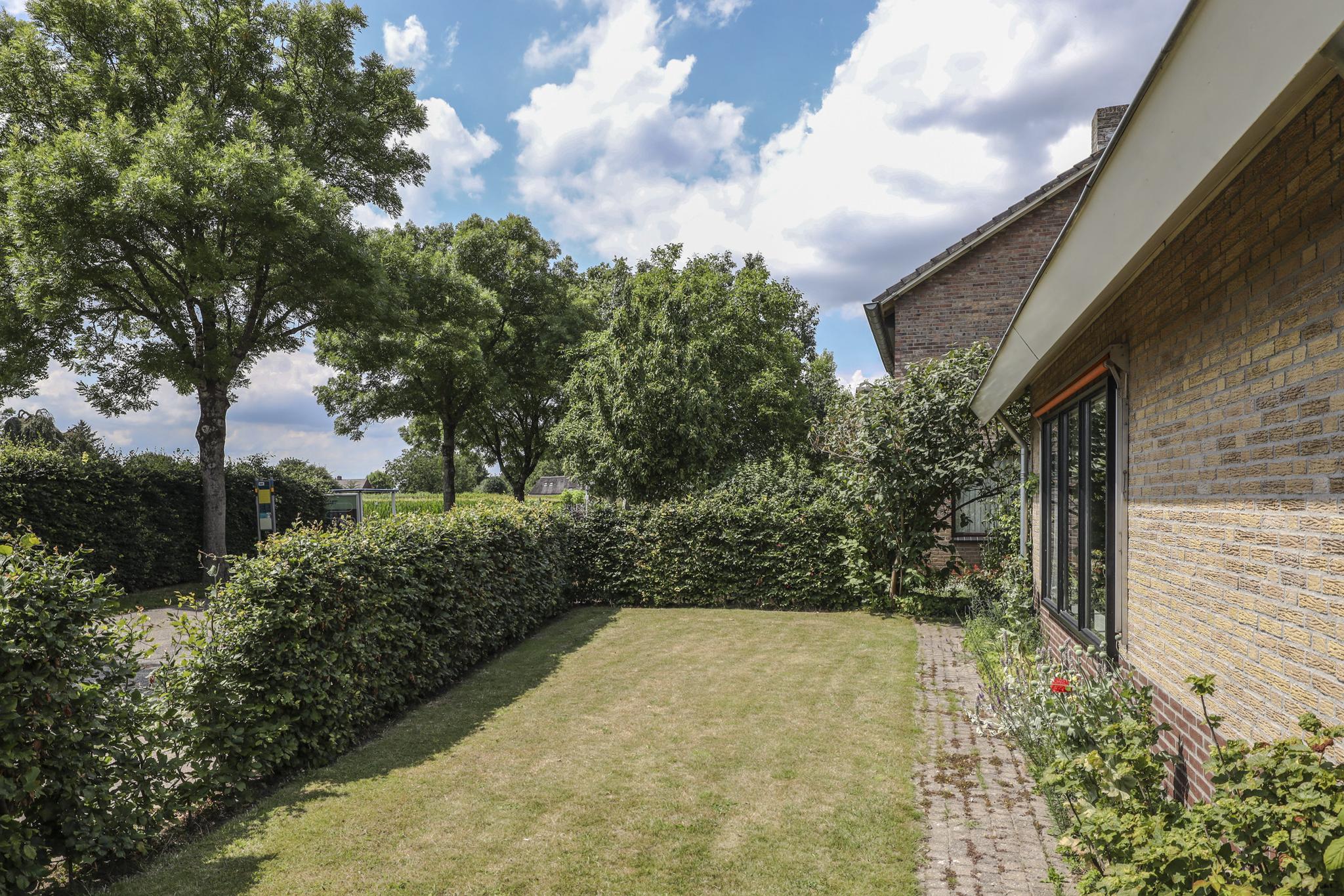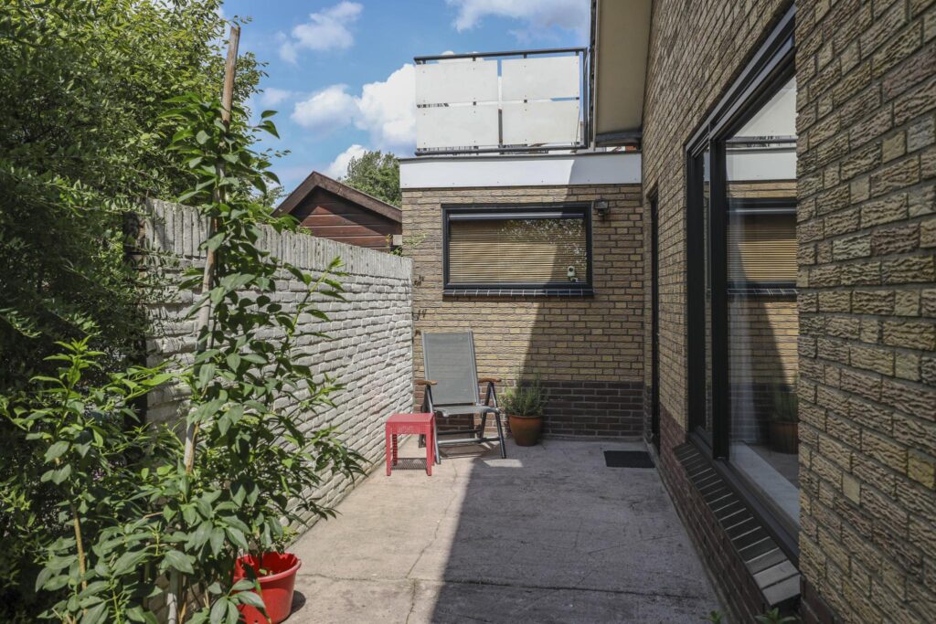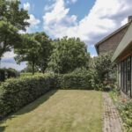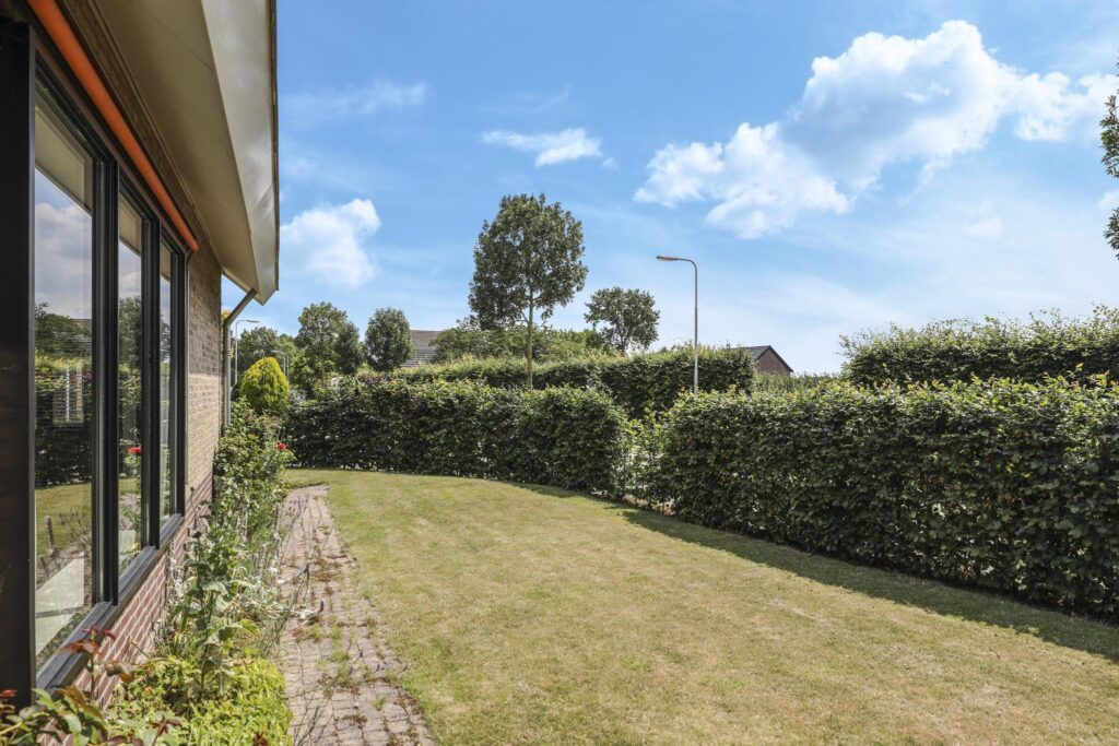 De tuin loopt rondom de woning waardoor er altijd een plekje in de zon of schaduw te vinden is. Bij de achterdeur is een terrasje gelegen waar je beschut en privé kunt zitten. Aan de 2 zijden van de woning is veel gras te vinden met een groene beukenhaag als erfafscheiding. Je ervaart hier dan ook een vrij gevoel. Je kan hier een groot terras creëren en/of een speeltoestel plaatsen. De tuin heeft een groen karakter met diverse planten en een groot grasgazon. Door de groene buffers op de erfgrens, geniet je van relatief veel privacy, zeker in de zomer wanneer het blad vol en groen is.