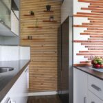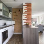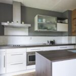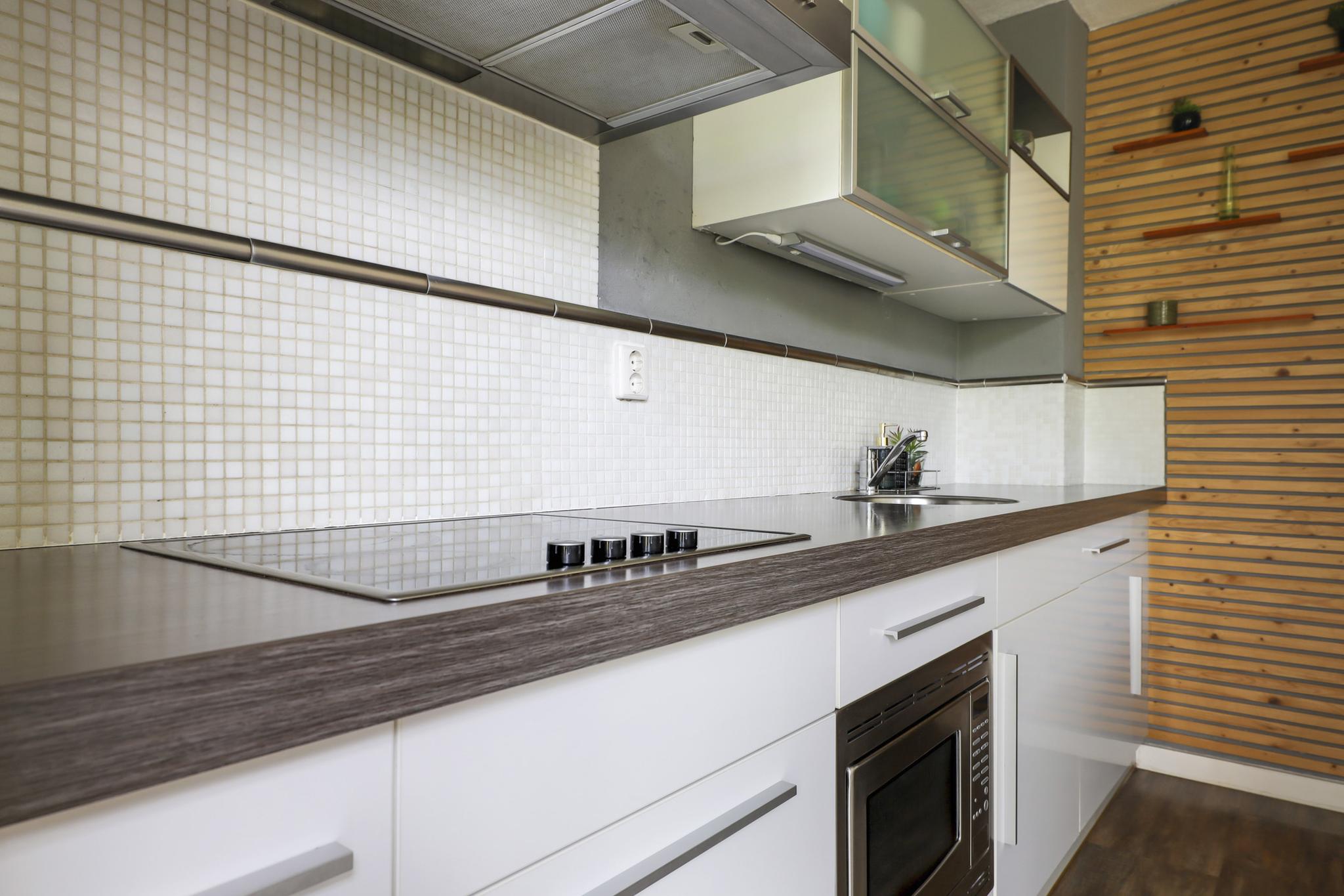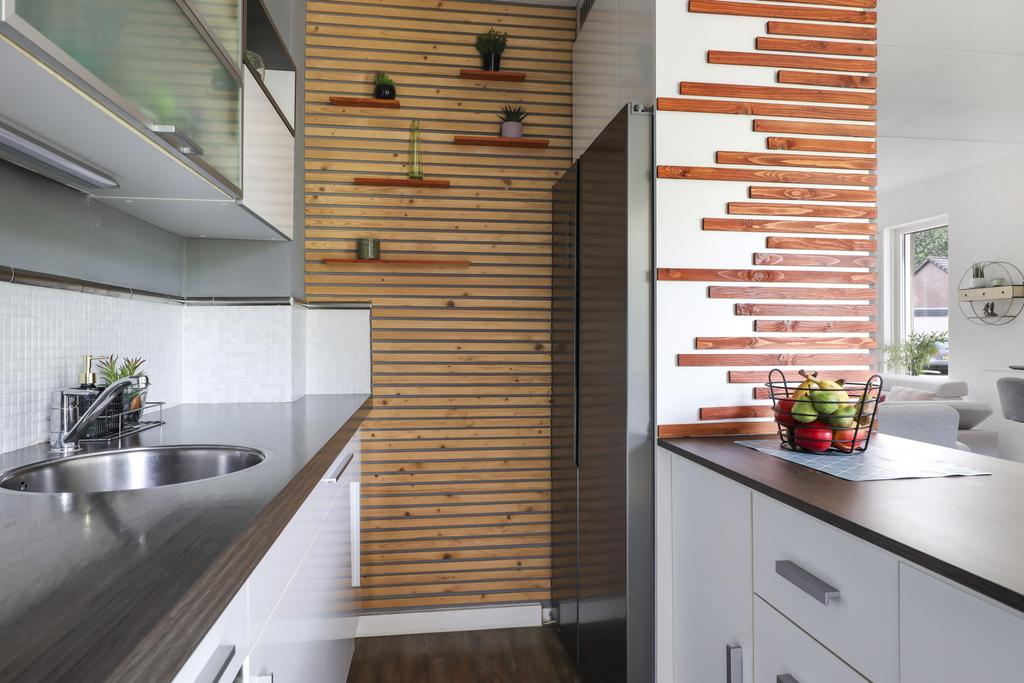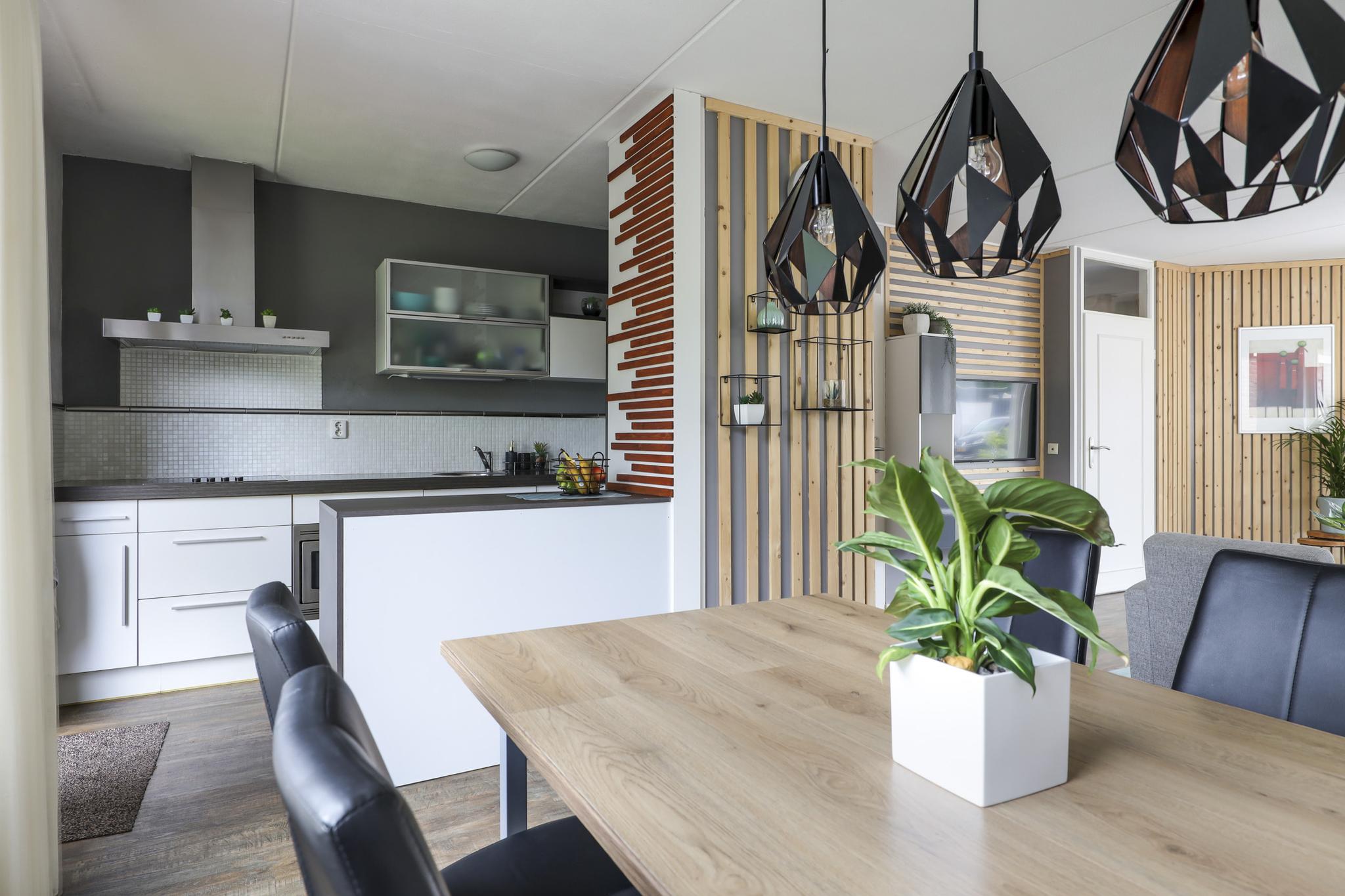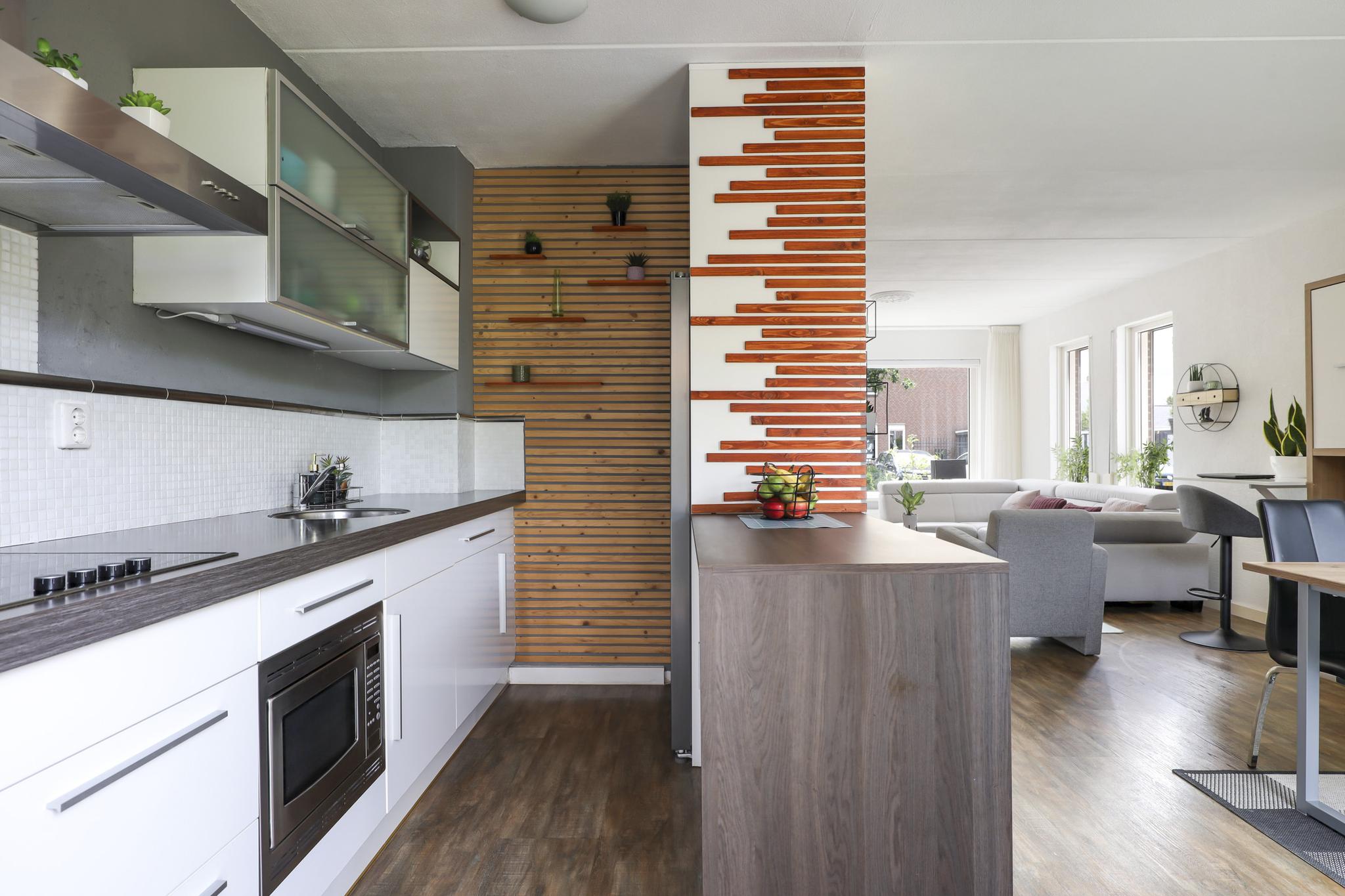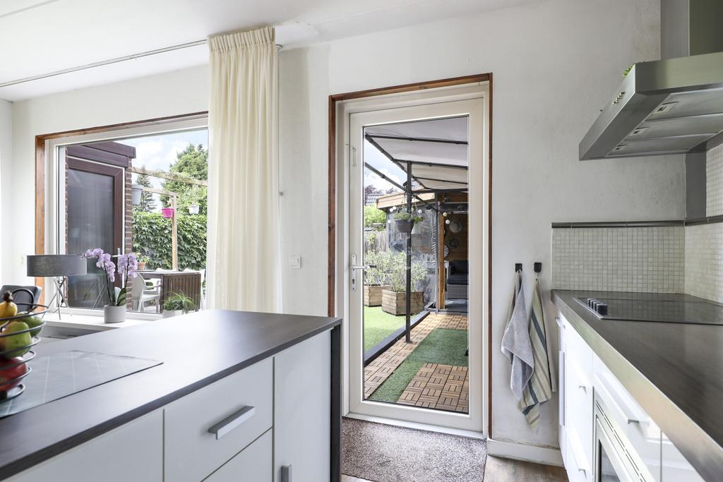 De keuken is aan de achterzijde van de woning te vinden. Je treft hier een moderne lichte inbouwkeuken met schiereiland aan, welke van alle gemakken is voorzien. De inbouwapparatuur bestaat uit een combi-oven/magnetron, een vaatwasser, een keramische kookplaat en een afzuigkap. De losse koel-vriescombinatie blijft tevens achter. Het is een degelijke keuken met stevige fronten en veel opberg- en werkruimte. De keuken is eveneens keurig afgewerkt, met neutrale wandtegeltjes en de laminaatvloer in houtlook welke vanuit de woonkamer naadloos tot in de keuken is doorgelegd. Vanuit de keuken is de toegangsdeur naar de achtertuin. Zo loop je op een zonnige dag heerlijk de privacyvolle achtertuin in.