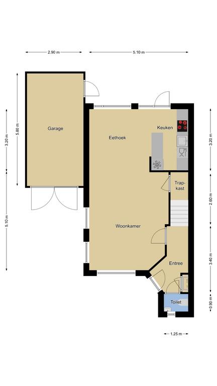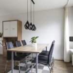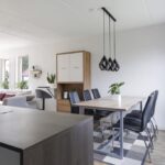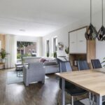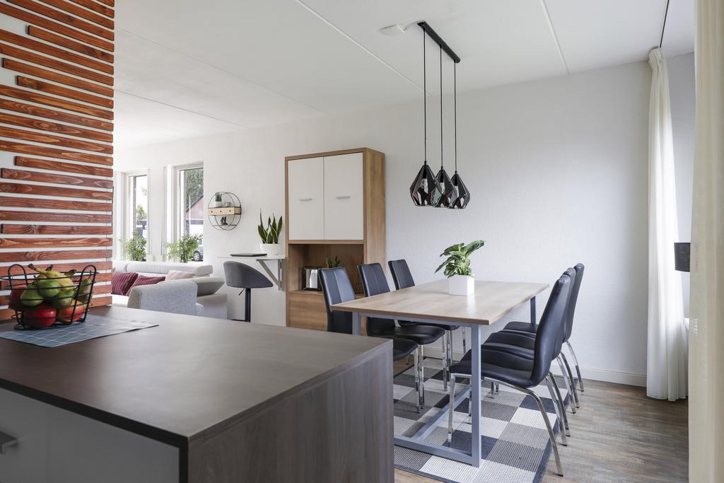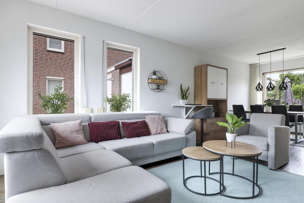 De woonkamer heeft een mooi rechthoekig formaat waarbij de vele lichtinval direct opvalt. De raampartijen aan zowel de voor- als achterzijde maken dit een ware doorzonwoning. Tevens zijn er nog 2 zijgevelramen aanwezig. De woonkamer is over de gehele diepte van de woning gesitueerd, waardoor je hier gemakkelijk een grote hoekbank en een ruime eettafel kwijt kunt. Onder de trap is een trapkast geplaatst welke vanuit de woonkamer toegankelijk is. De entree en het toilet bevinden zich ‘buiten’ de woning waardoor je in de woonkamer meer ruimte over houdt.