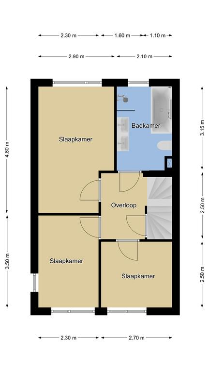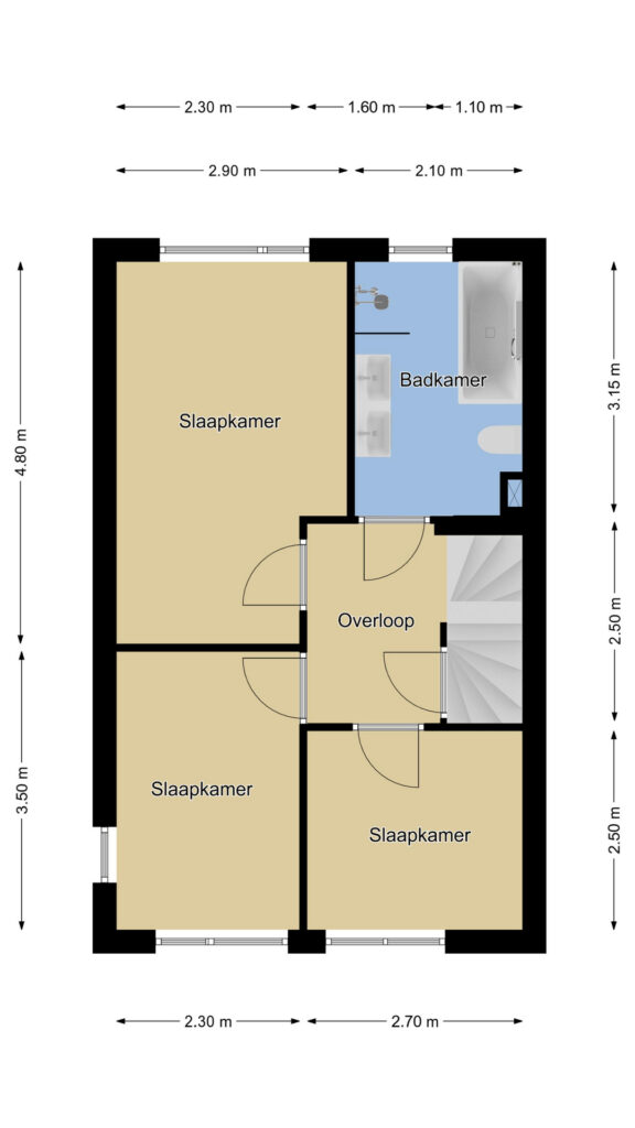 Via de trapopgang in de hal, waar ook het toilet en de meterkast zich bevinden, komen we op de eerste verdieping terecht. Op deze woonlaag zijn 3 slaapkamers en de badkamer gelegen. De slaapkamers zijn allen volwaardig te noemen en zijn respectievelijk 14m², 8m² en 7m² groot. Noemenswaardig is ook de beglazing, aangezien alle kamers zijn voorzien van kunststof kozijnen met isolatieglas en rolluiken. Op een warme dag houd je het daarmee lekker koel in de woning, terwijl tijdens een koude winternacht de woning warmer blijft als je de luiken gesloten hebt.