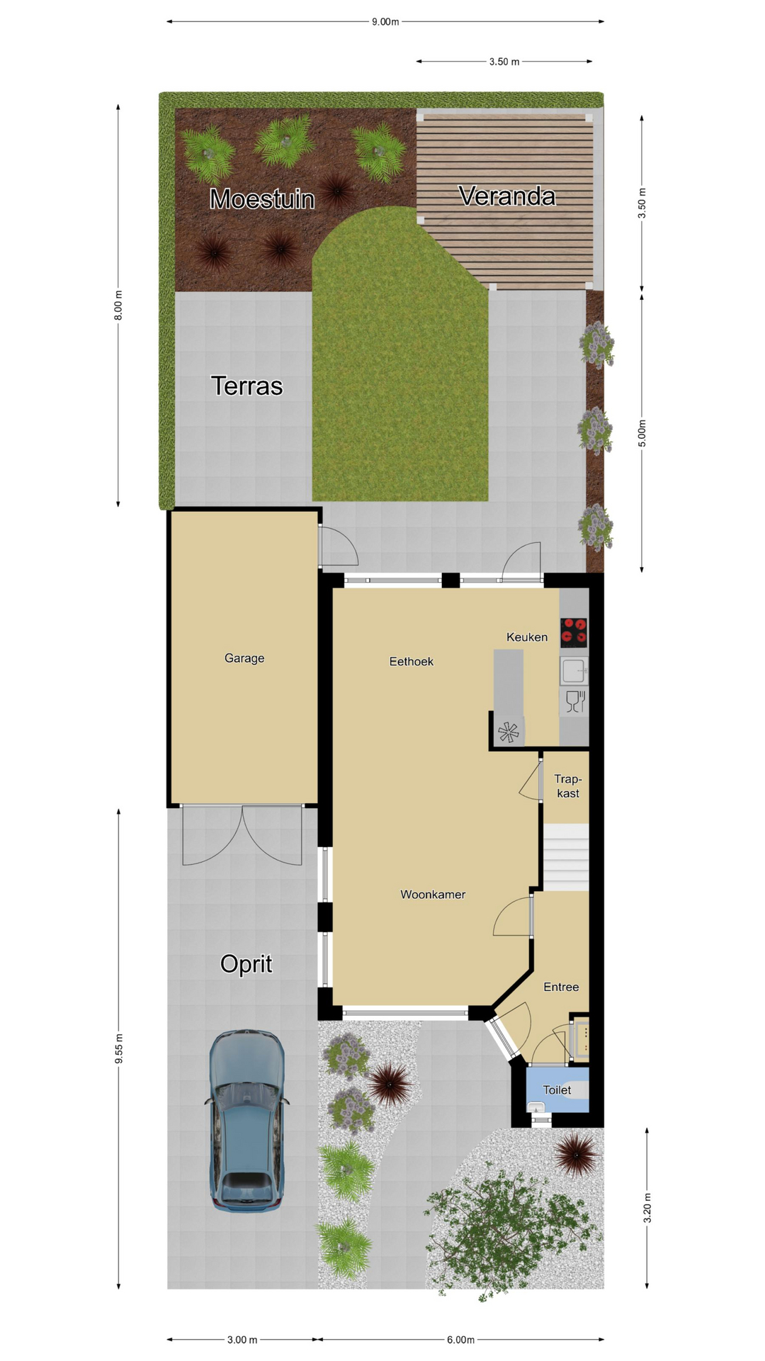 Deze gezinswoning wordt compleet gemaakt door de garage en oprit. Dit biedt veel extra ruimte en de mogelijkheid tot het parkeren van 2 auto’s op eigen terrein. De achtertuin is daardoor ook breder waardoor je hier gemakkelijk meerdere zithoeken kunt realiseren. In de hoek van de tuin staat een houten veranda. Dit alles aan een rustige straat met parkeergelegenheid en op steenworp afstand van voorzieningen.