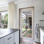 Open keuken met schiereiland, inbouwapparatuur en tuindeur