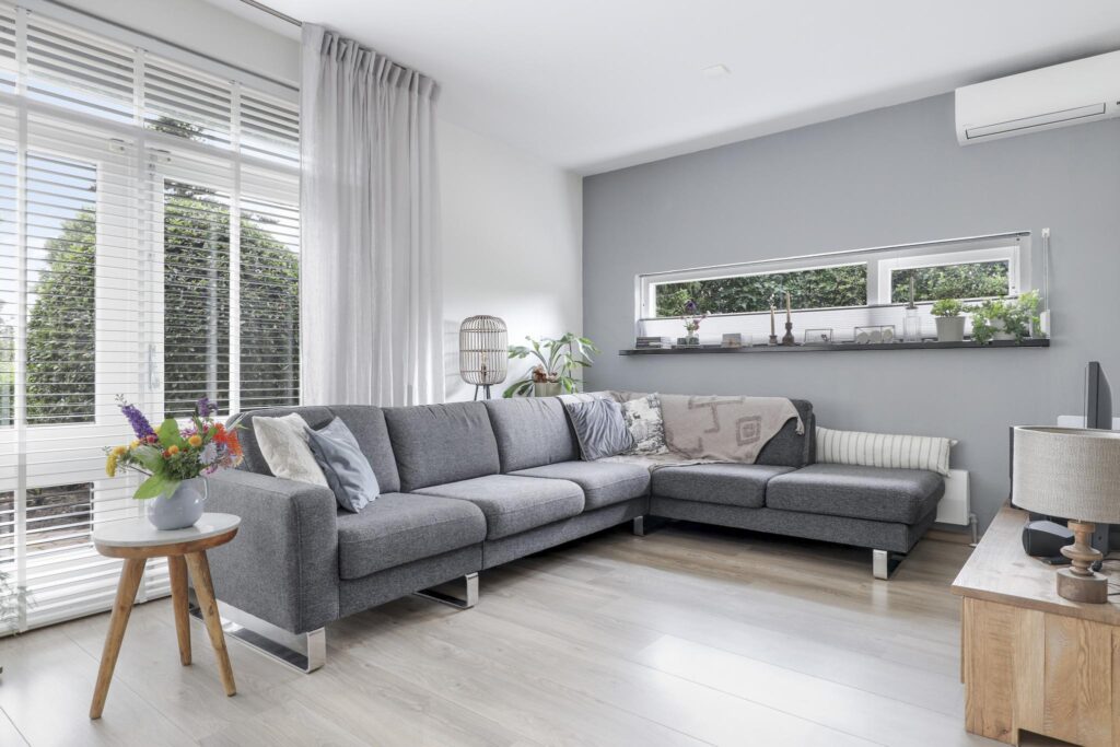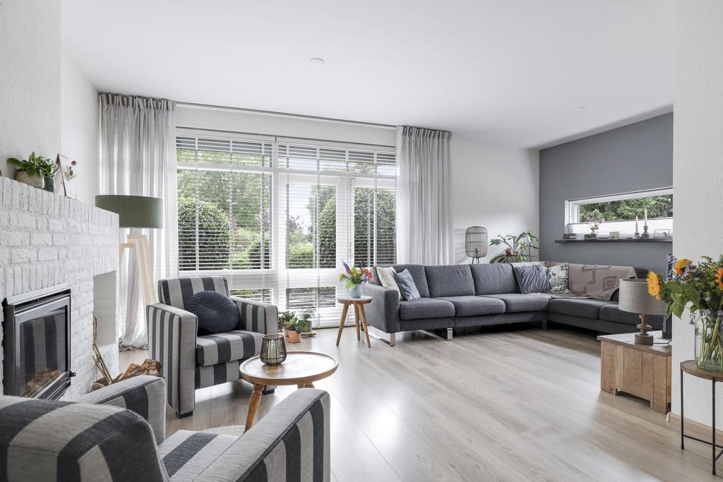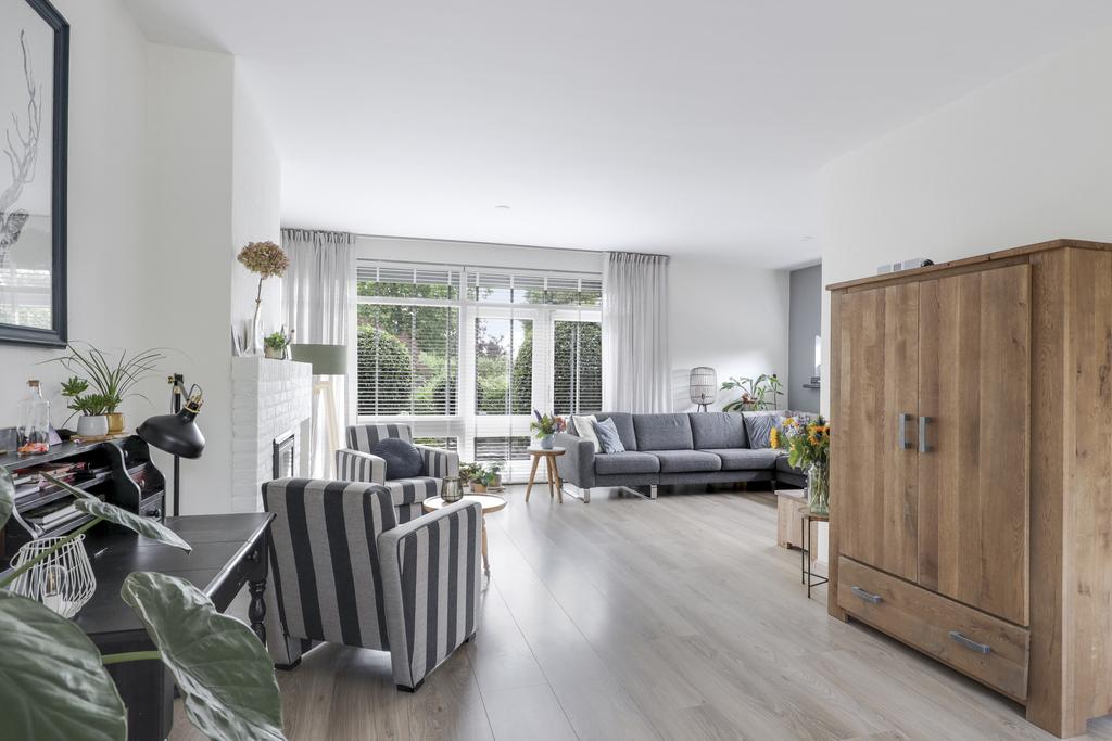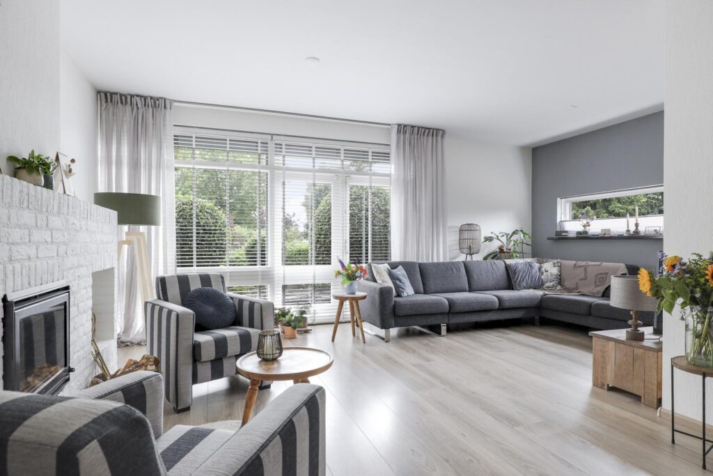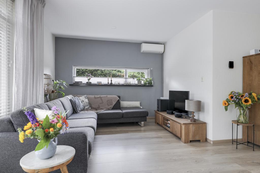 Woonkamer (L-indeling) met dubbele tuindeuren, houtkachel, airco en inbouwkast
