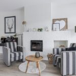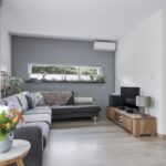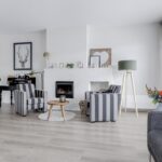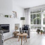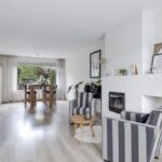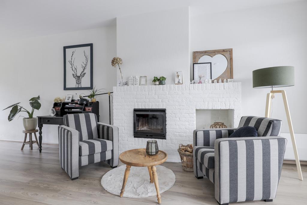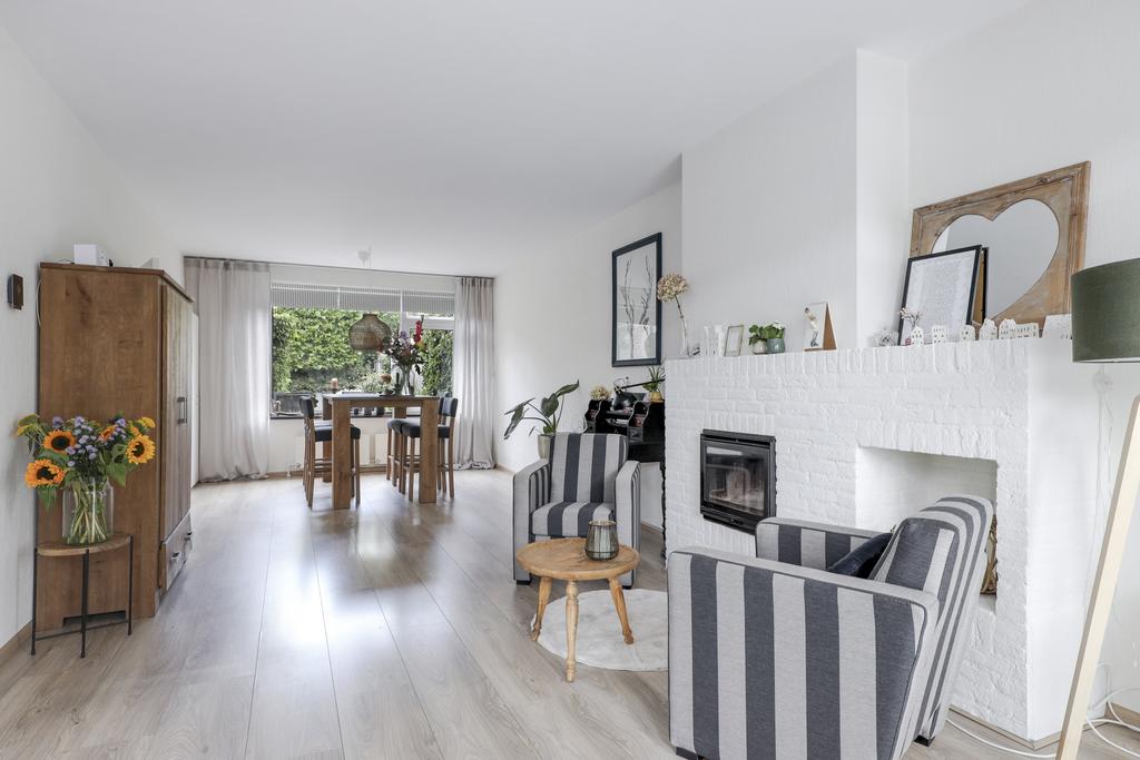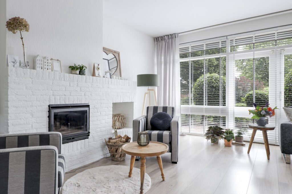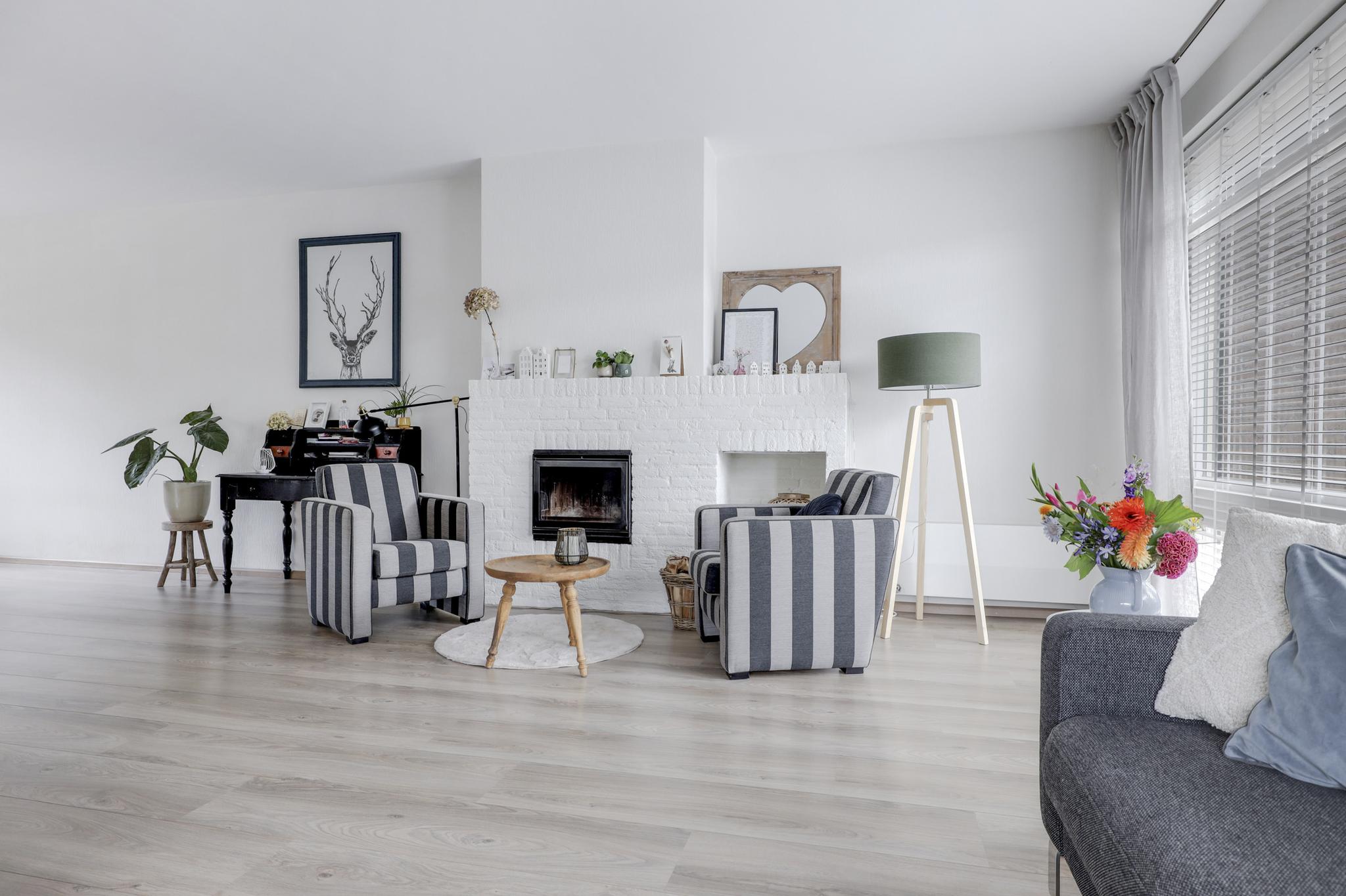Woonkamer (L-indeling) met dubbele tuindeuren, houtkachel, airco en inbouwkast