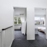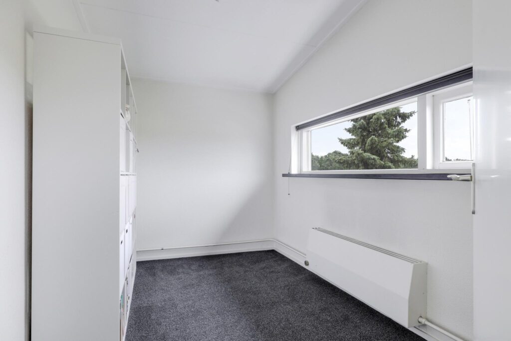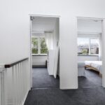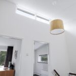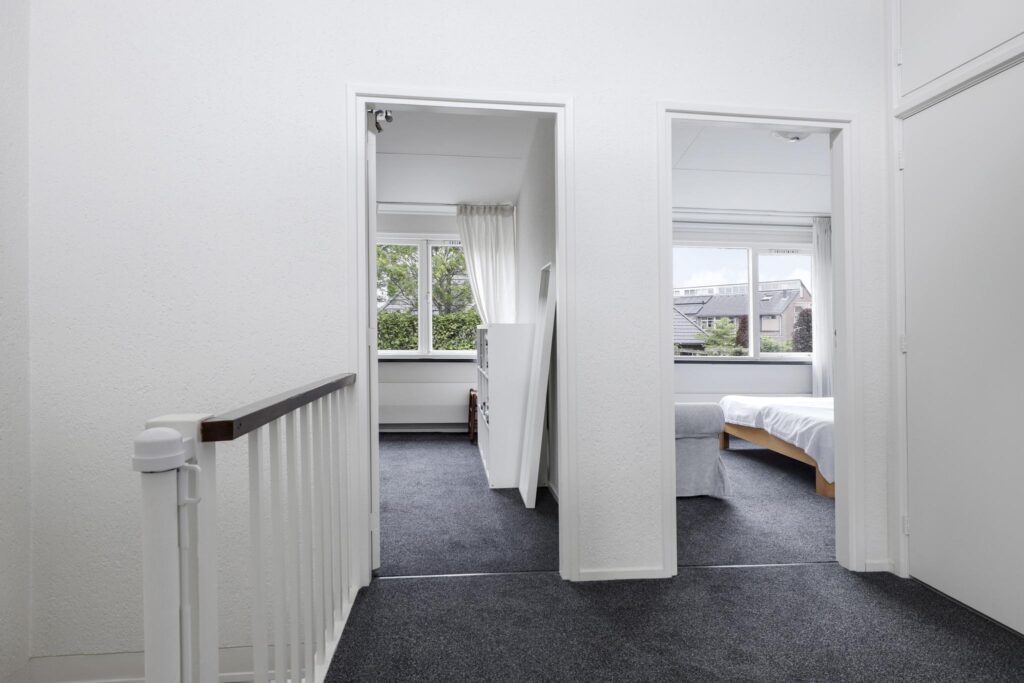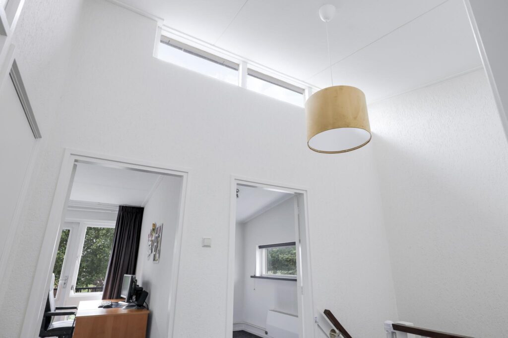 Deze woning heeft een klassiek lessenaarsdak waarbij het ene schuine dak hoger doorloopt dan het andere waarbij het hoogteverschil wordt opgevangen door raampuien. In de woning zie je dit terug op de verdieping waarbij de plafonds schuin oplopen en voor een ruimtelijk gevoel zorgen. Op de overloop zorgen de ‘bovenlichten’ in de nok niet alleen voor nog meer hoogte, maar ook voor een bijzondere prettige lichtinval.