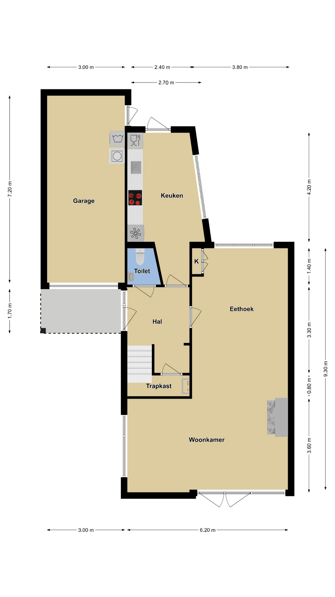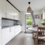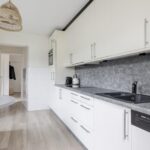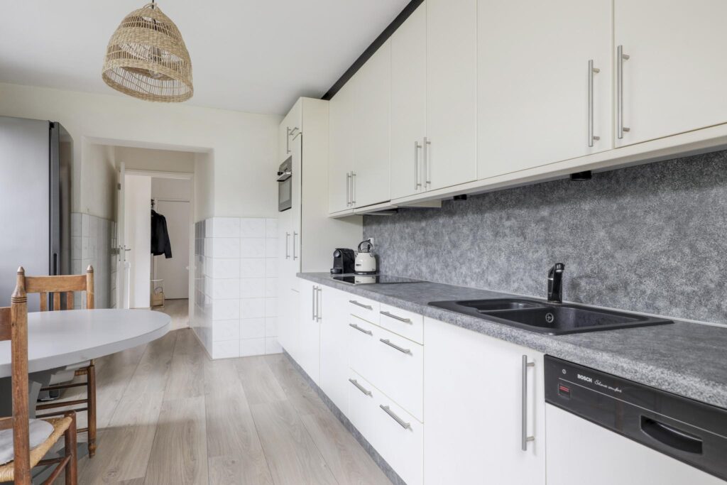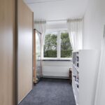 In de huidige indeling is de keuken via de hal te bereiken. Maar mocht je voorkeur uitgaan naar een open karakter met de woonkamer, dan zou je kunnen overwegen om de dubbele inbouwkast tussen woonkamer en keuken door te breken. De indeling zal er nog ruimtelijker van worden.