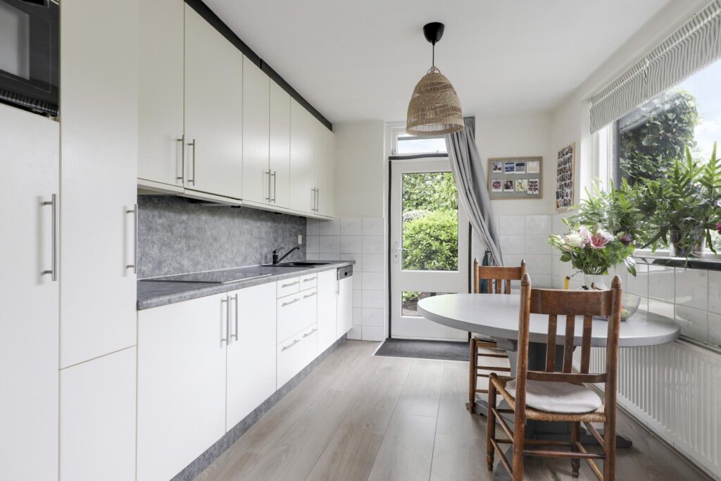 De royale indeling op de begane grond wordt mede gecreëerd doordat de keuken in de ‘aanbouw’ aan de achterzijde is gelegen. En ook de keuken is zeker niet klein te noemen.
