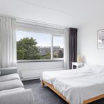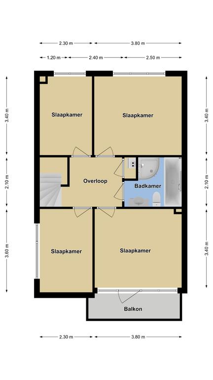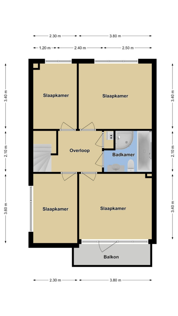 De verdieping bestaat verder uit 4 volwaardige slaapkamers. En het zal je niet verbazen dat ook hier de schuin oplopende plafonds voor een ruimtelijk effect zorgen. De slaapkamers zijn respectievelijk 13m2, 13m2, 8m2 en 8m2 groot. Een kleine kamer zit er dus niet tussen. Bovendien zijn alle kamers praktisch in te richten door rechte muren (geen schuine daken).