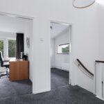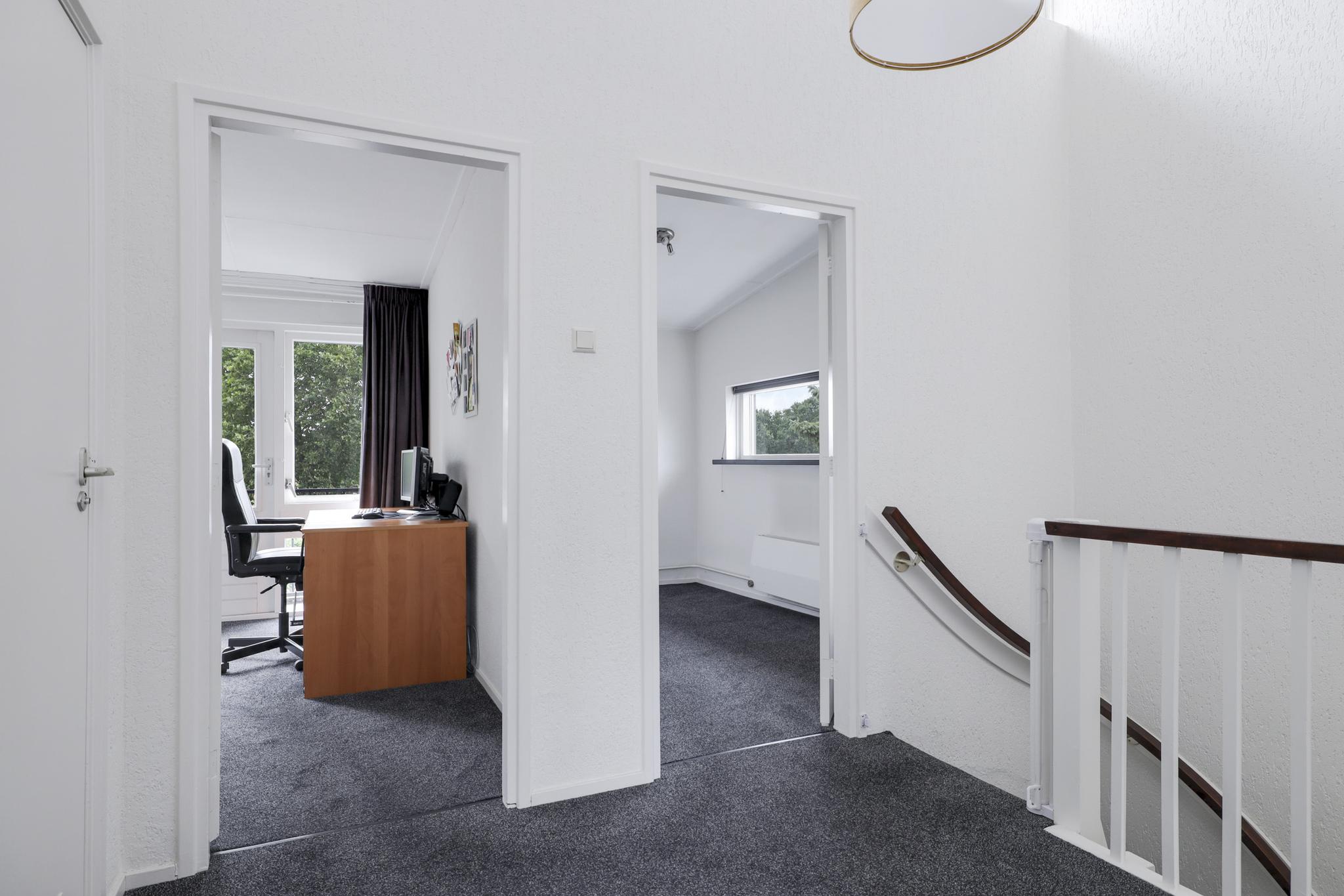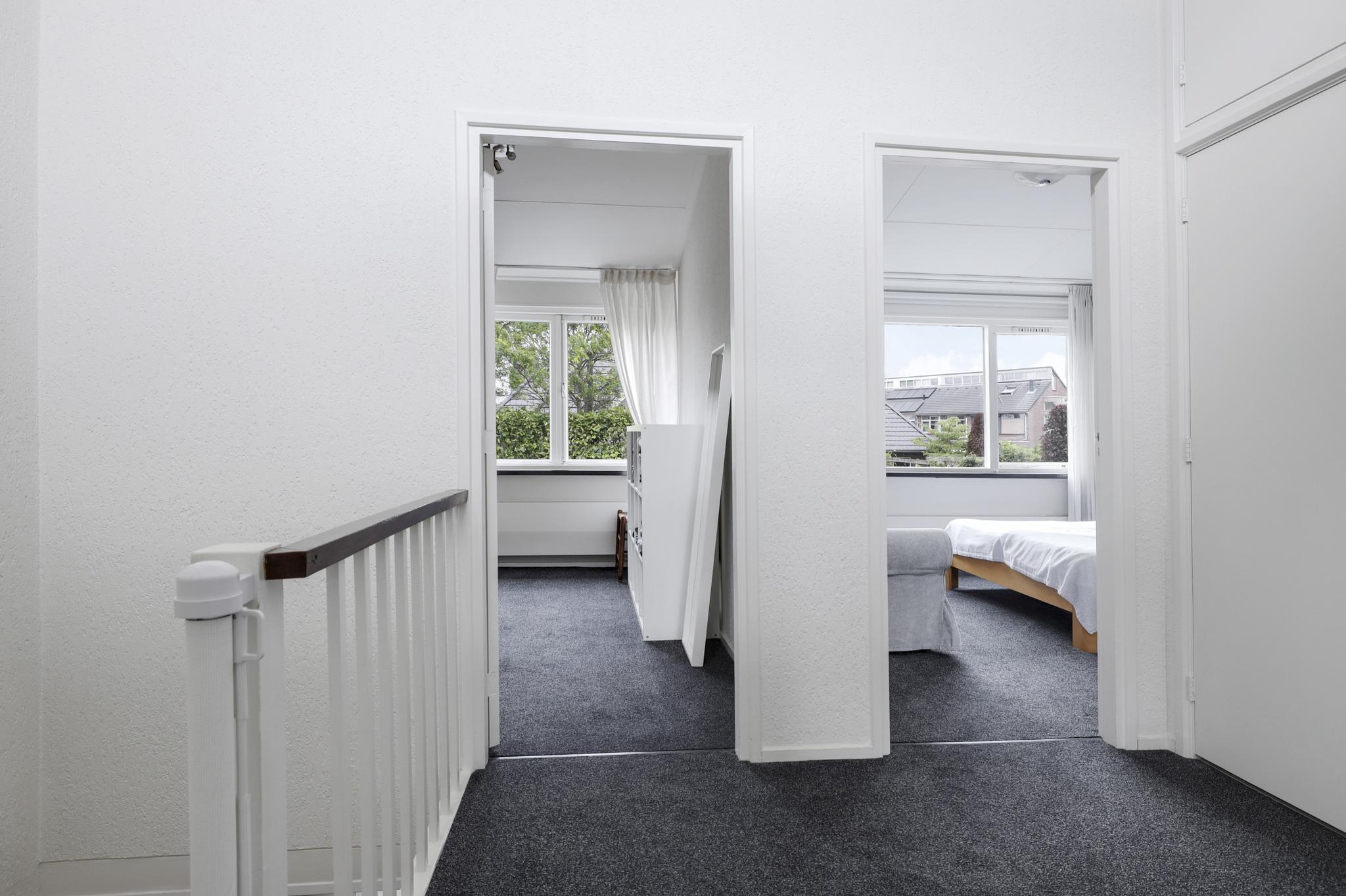 Via een prettige hal met speels opgezet trappenhuis (met vide), bereiken we de 1e verdieping. De overloop is royaal te noemen waarbij het hoge lessenaarsplafond met bovenlichten voor een bijzondere beleving zorgt. Deze lichtinval en ruimtelijkheid kom je niet vaak tegen. OP de overloop vind je tevens een inbouwkast met daarin de CV-ketel geïnstalleerd. Ook kun je hier bijvoorbeeld je linnengoed en handdoeken in opbergen.
