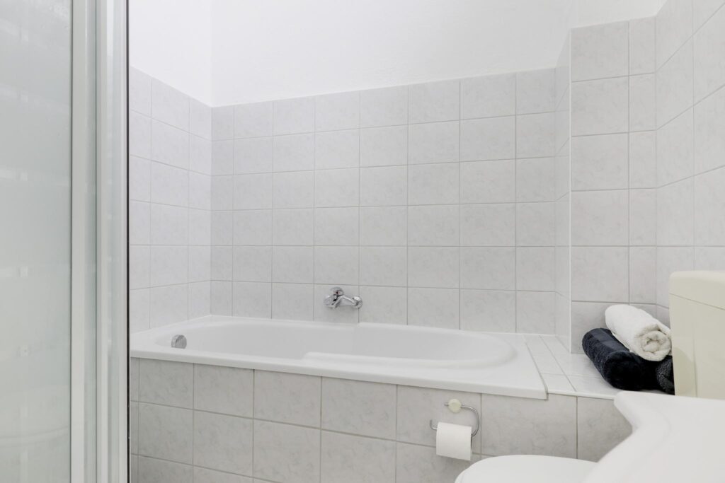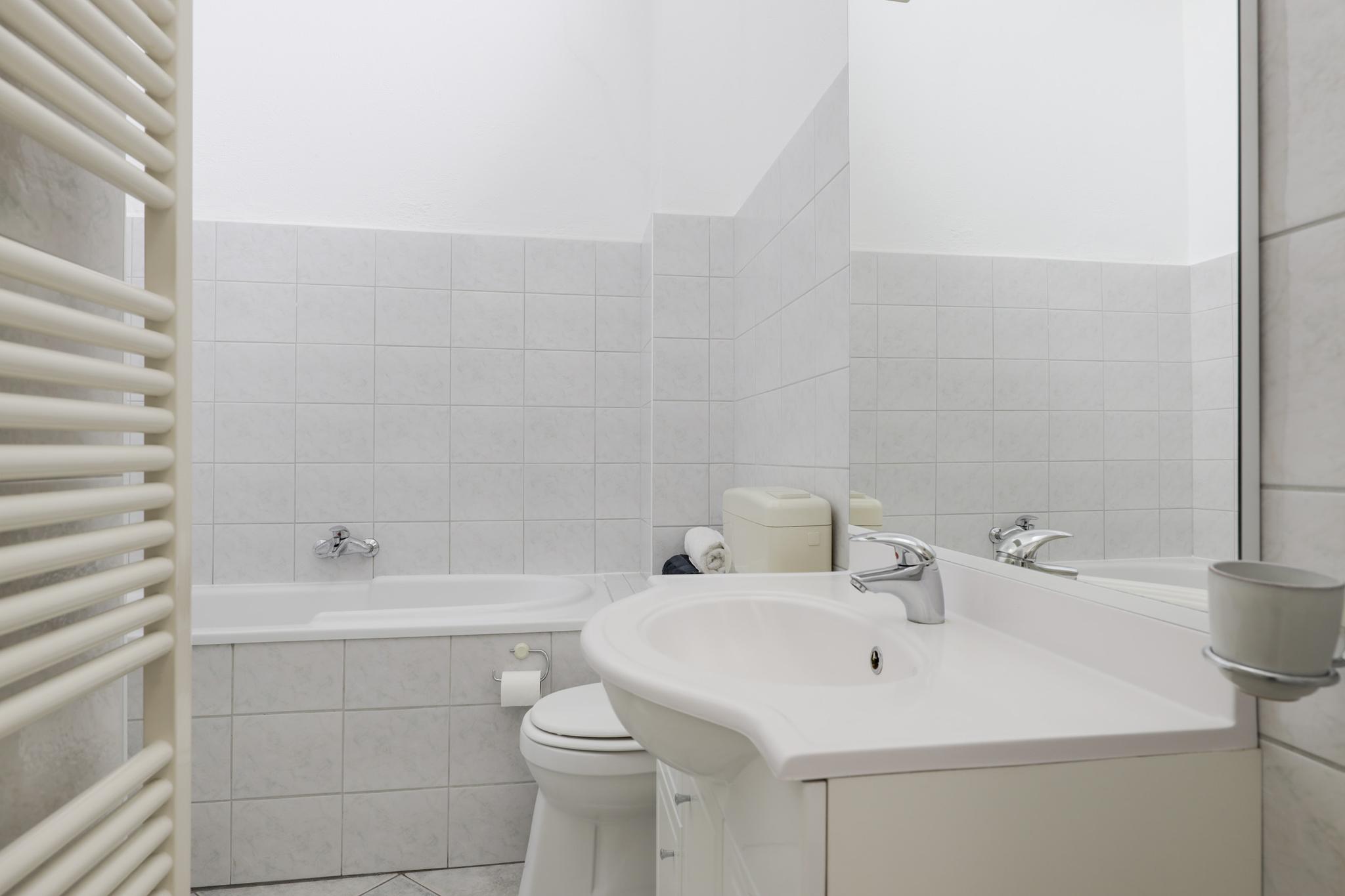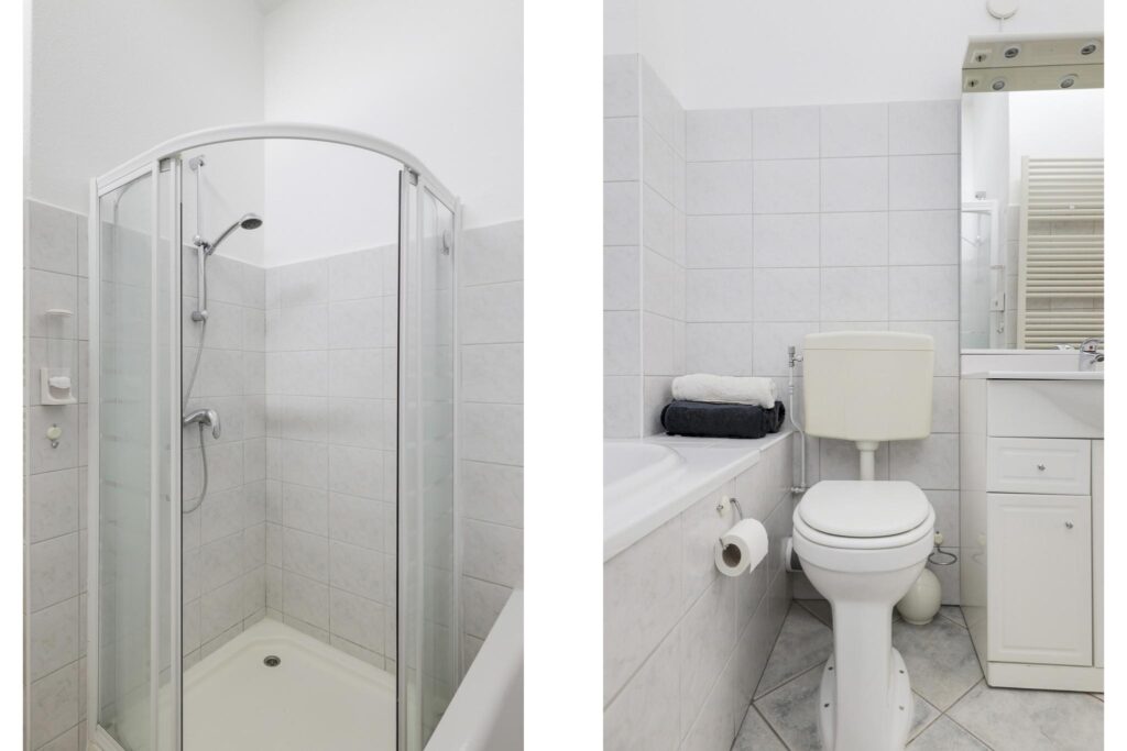 Badkamer met ligbad, separate douche, 2e toilet en wastafelmeubel.