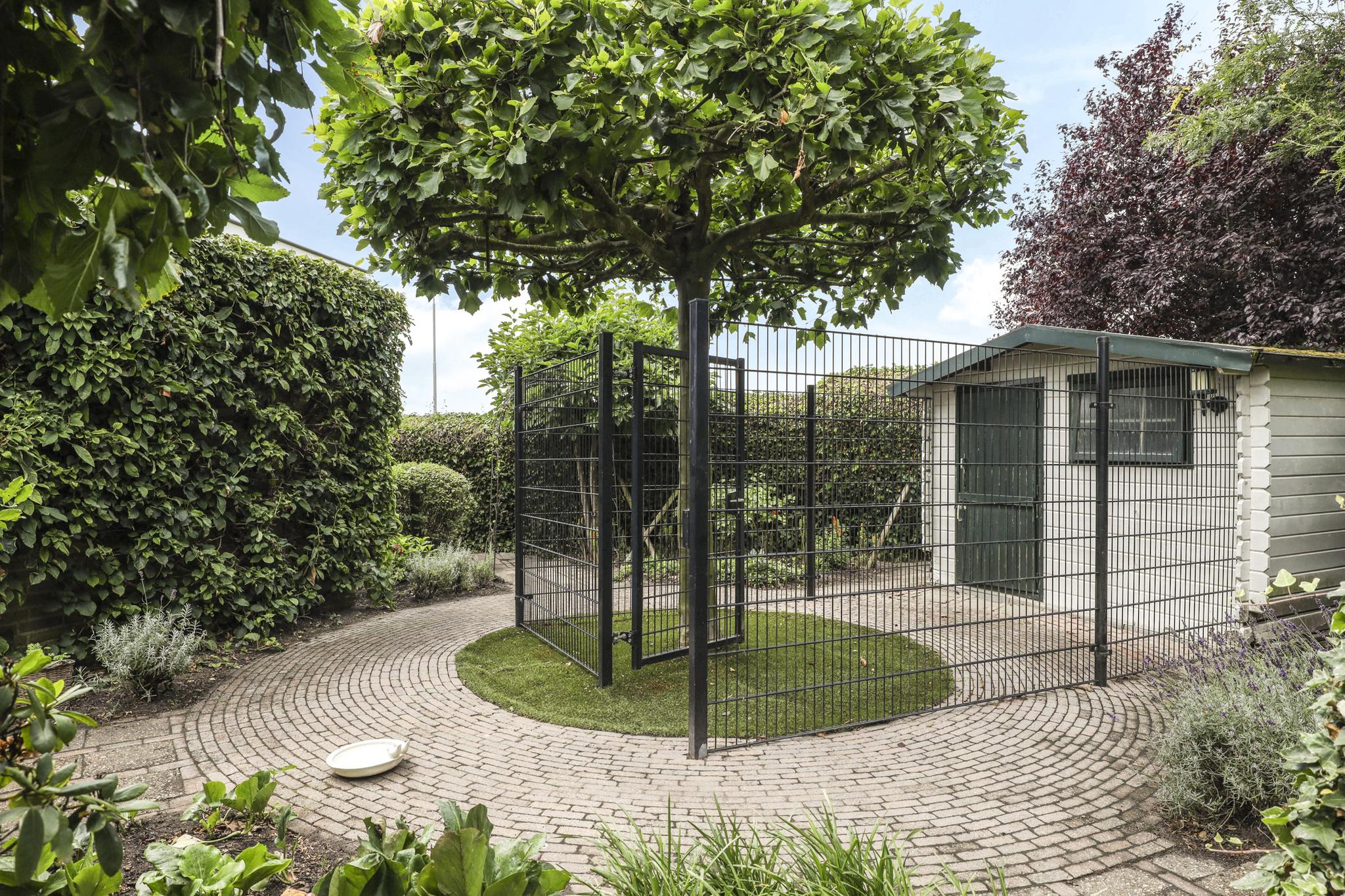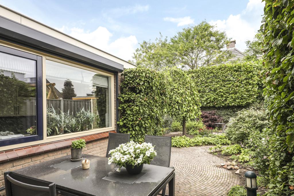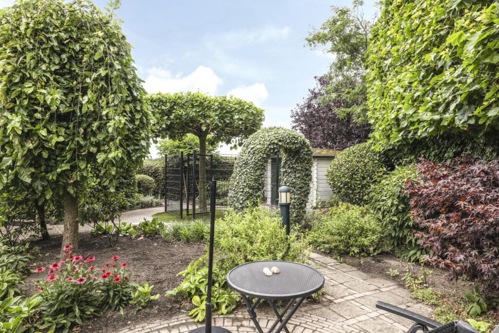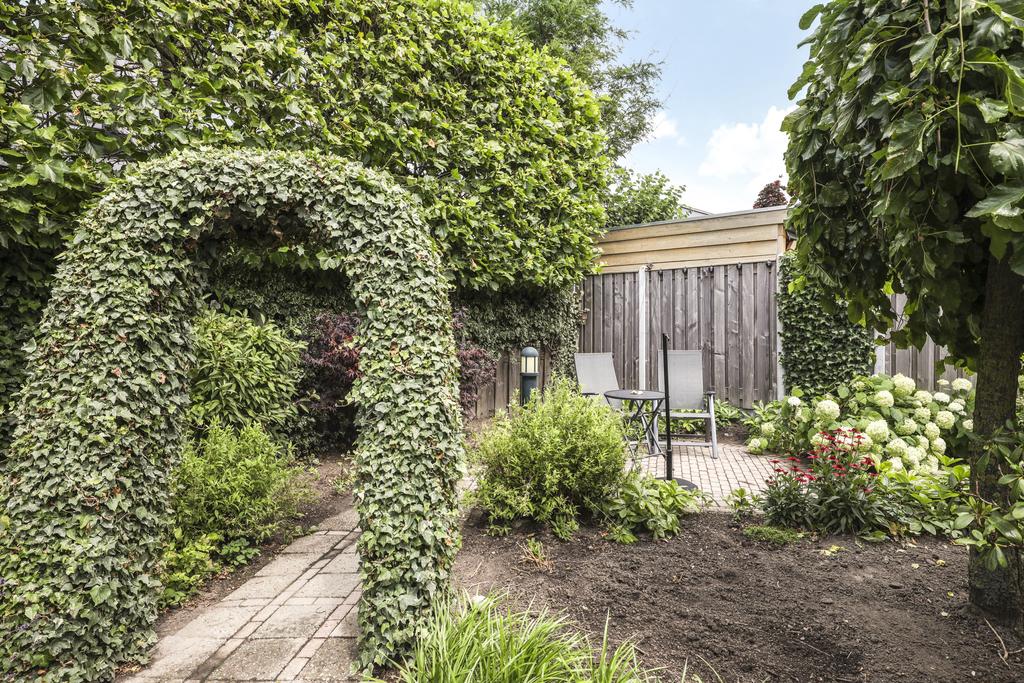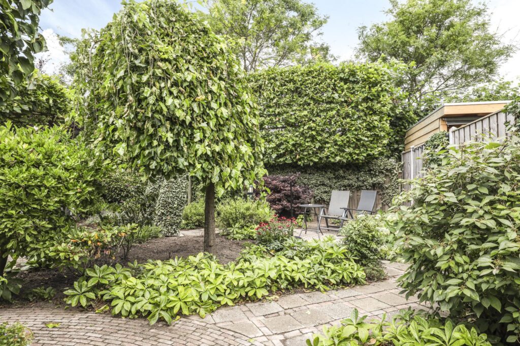Door verschillende bomen, struiken en planten heeft de tuin een groen karakter. Een dakplataan zorgt op een warme zomerdag voor de (gewenste) schaduw. Het houten tuinhuis heeft zijn beste tijd wel gehad, maar biedt ook perspectief om er een nieuwe veranda te plaatsen. Verder is de schutting met de buren onlangs vervangen door een degelijke erfafscheiding met betonpalen.