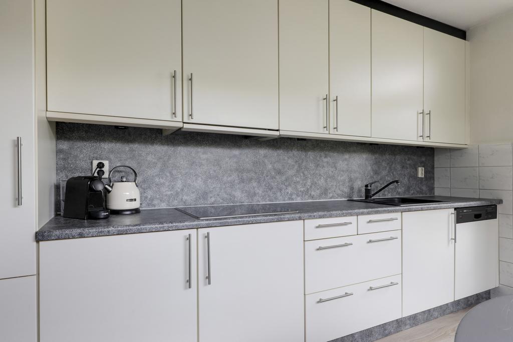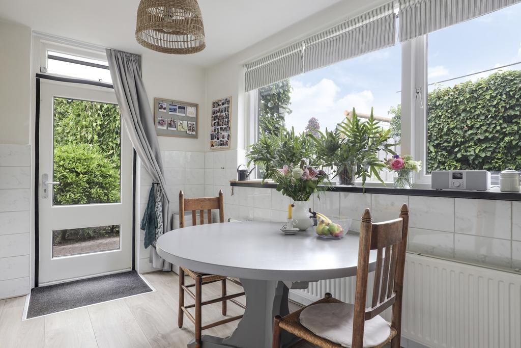 De lengte van het keukenblok is maar liefst 4,2 meter en dat is uitzonderlijk. Hierdoor heb je niet alleen veel aanrecht, maar ook bovengemiddeld veel kastruimte, bijvoorbeeld een hoge apothekerskast. De inbouwapparatuur bestaat uit een 4-pits keramische kookplaat, een afzuiger, een vaatwasser, een koelkast met vriesvak en een combi-oven/magnetron. Een close-in-boiler zorgt voor direct warm water. Naast de uitgebreide keukenopstelling, is er plaats voor een eethoek. Een tuindeur geeft direct toegang tot het buitenterras.