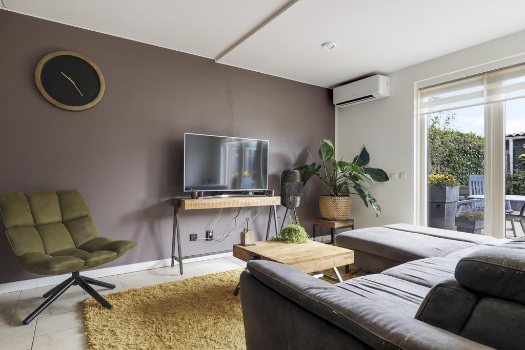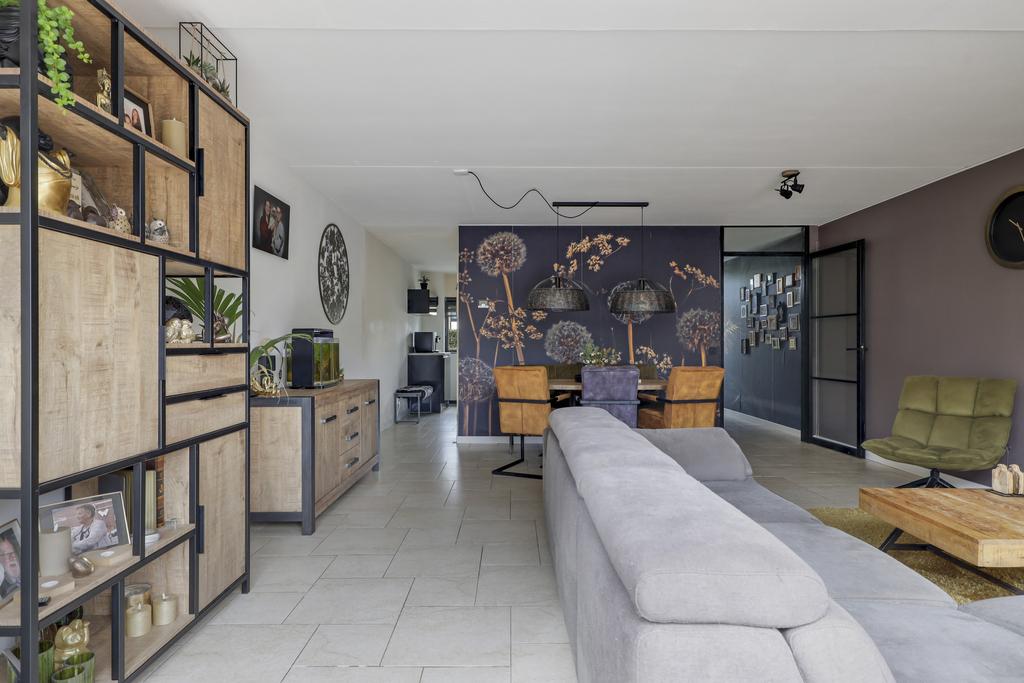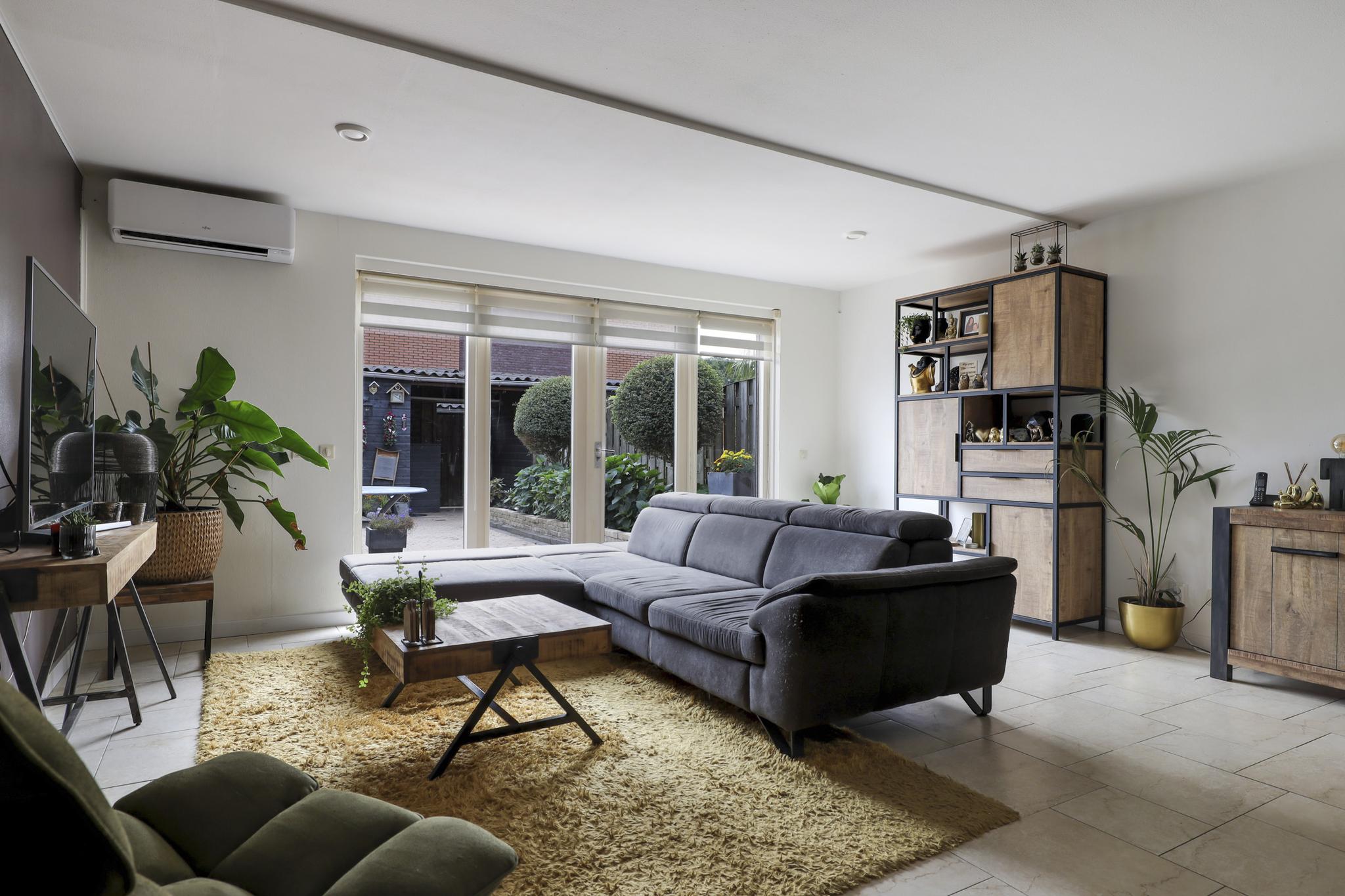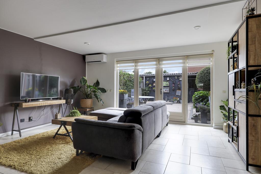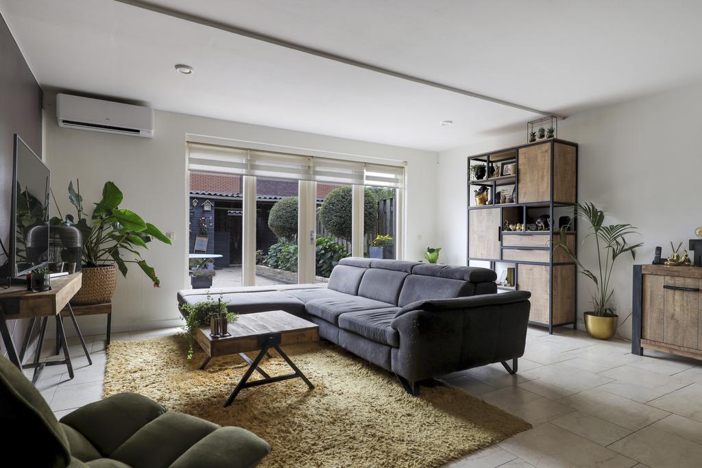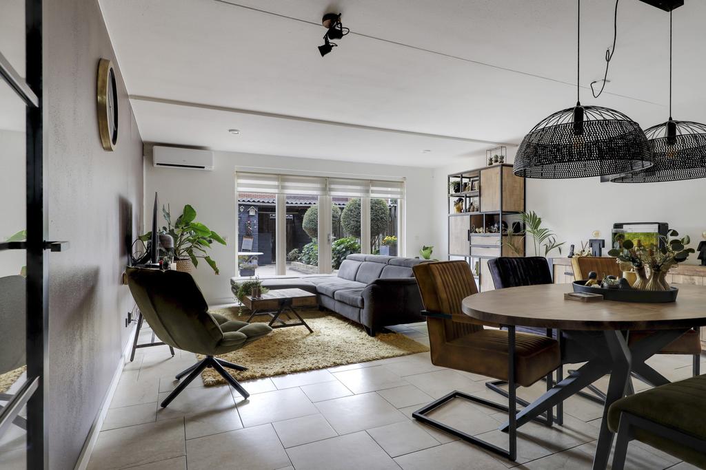 Een groot pluspunt bij deze woning is de uitbouw, dit maakt de woonkamer groter dan gemiddeld. Een grote raampartij met openslaande tuindeuren versterkt het ruimtelijke gevoel. De plavuizen vloer is voorzien van vloerverwarming wat niet alleen aangenaam aanvoelt, maar ook zorgt dat er geen radiatoren in de weg staan bij het inrichten van de ruimte. Je kan er dan ook met gemak een grote hoekbank, een 6-persoons eettafel en een servieskast kwijt. In de woonkamer is airconditioning geplaatst (2022) waarmee de ruimte zowel gekoeld als verwarmd kan worden. De woonkamer wordt van de hal gescheiden door een trendy zwarte staal-look deur.