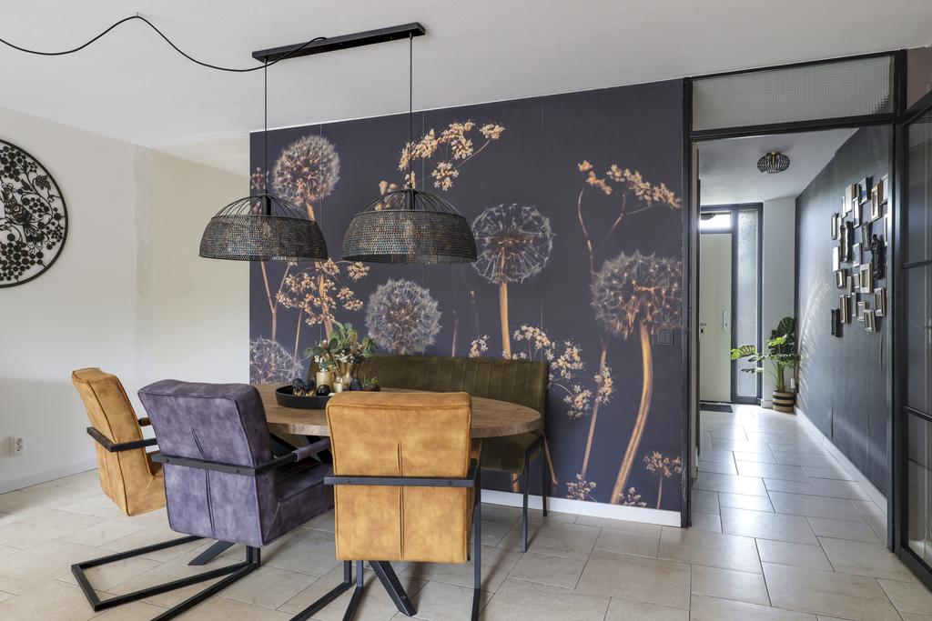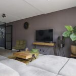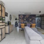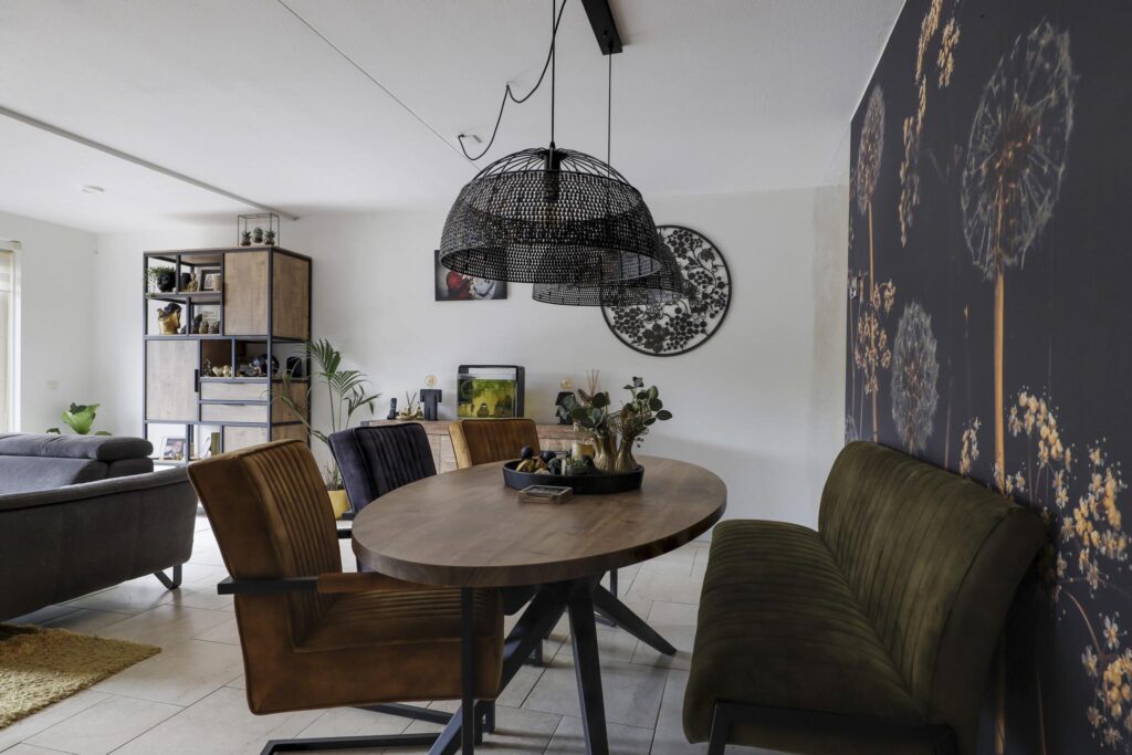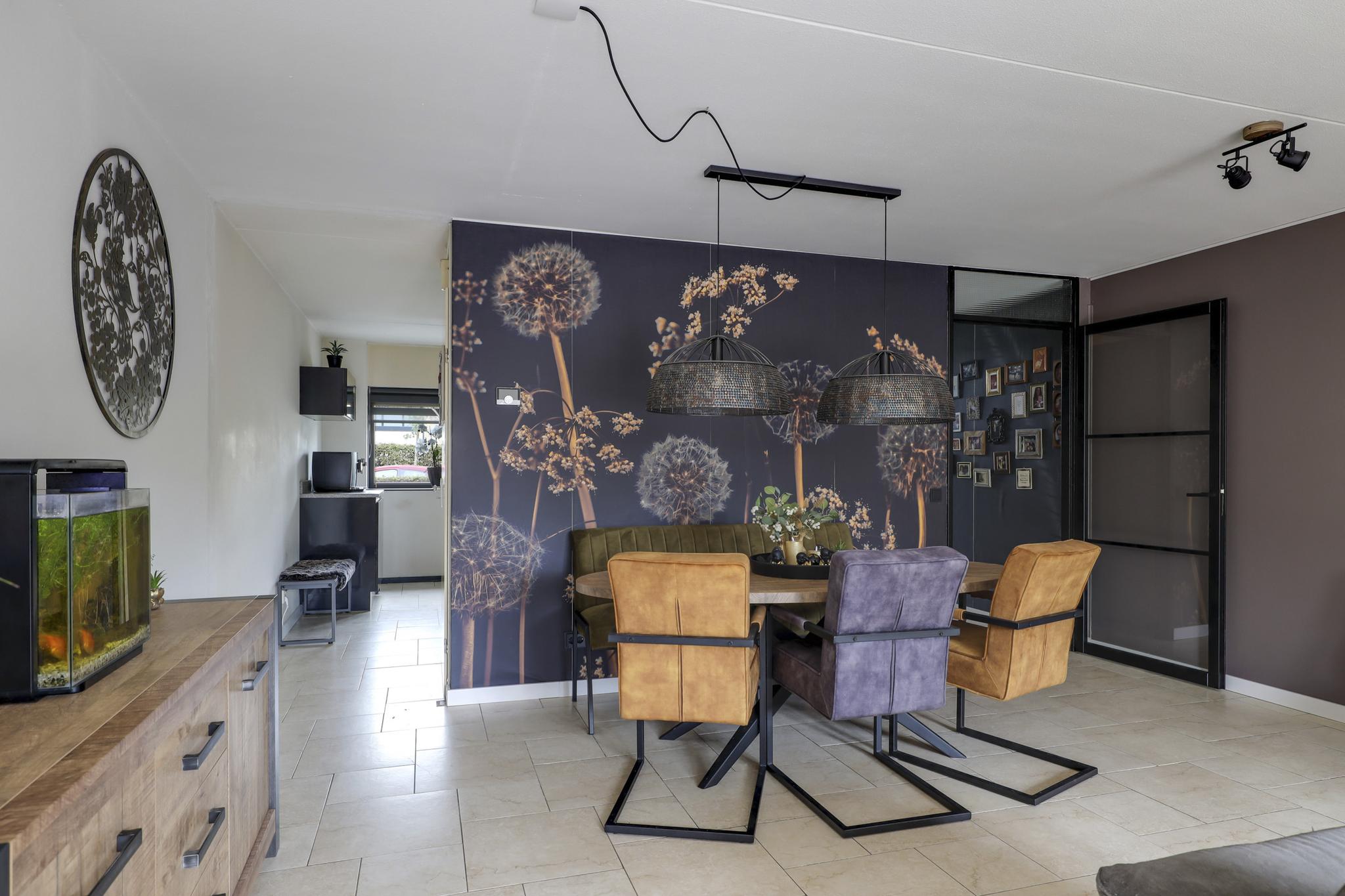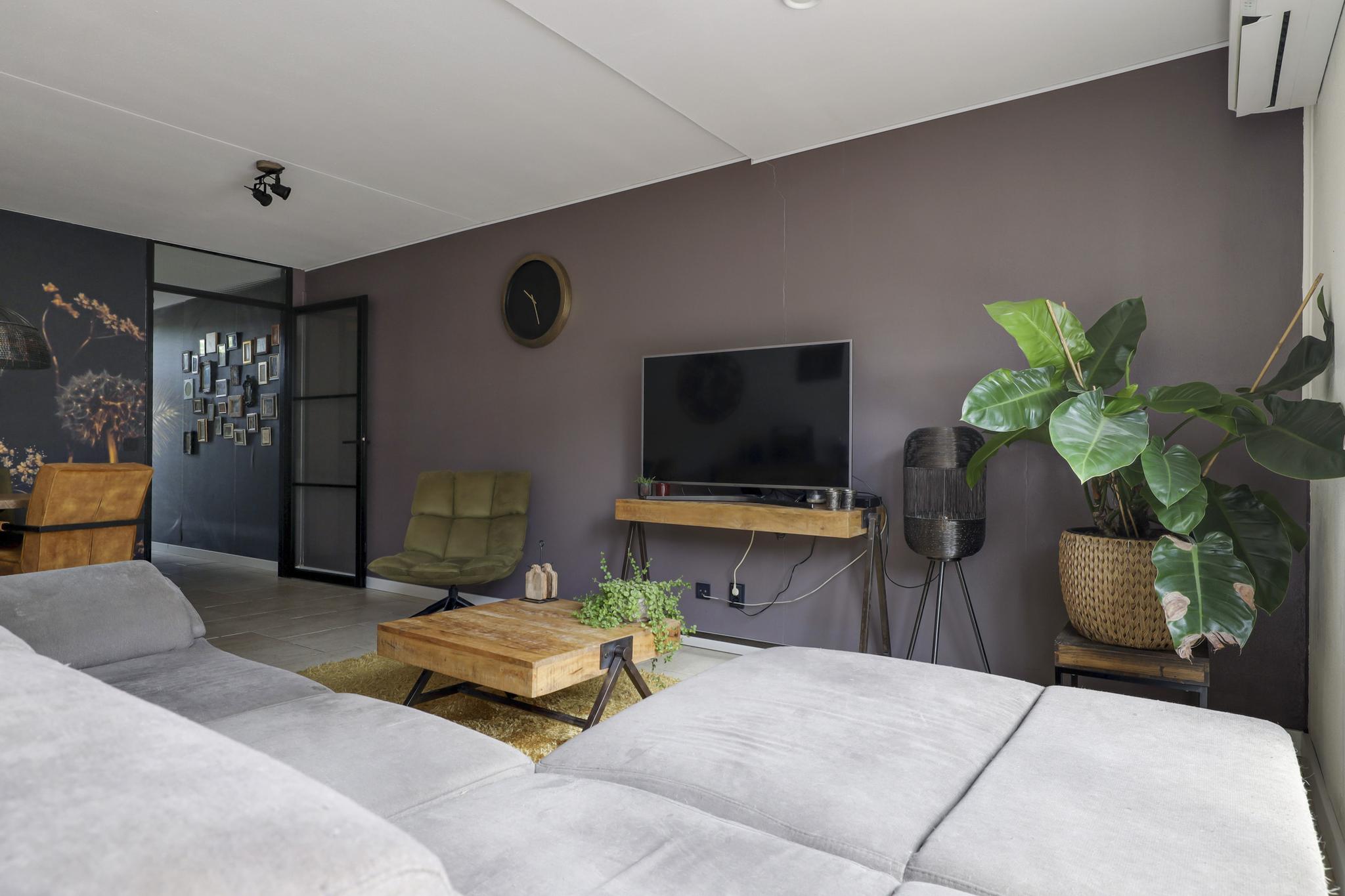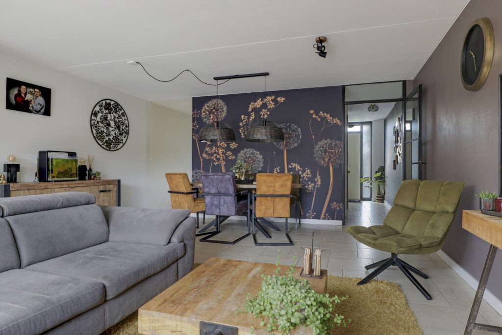 Een groot pluspunt bij deze woning is de uitbouw, dit maakt de woonkamer groter dan gemiddeld. Een grote raampartij met openslaande tuindeuren versterkt het ruimtelijke gevoel. De plavuizen vloer is voorzien van vloerverwarming wat niet alleen aangenaam aanvoelt, maar ook zorgt dat er geen radiatoren in de weg staan bij het inrichten van de ruimte. Je kan er dan ook met gemak een grote hoekbank, een 6-persoons eettafel en een servieskast kwijt. In de woonkamer is airconditioning geplaatst (2022) waarmee de ruimte zowel gekoeld als verwarmd kan worden. De woonkamer wordt van de hal gescheiden door een trendy zwarte staal-look deur.