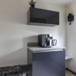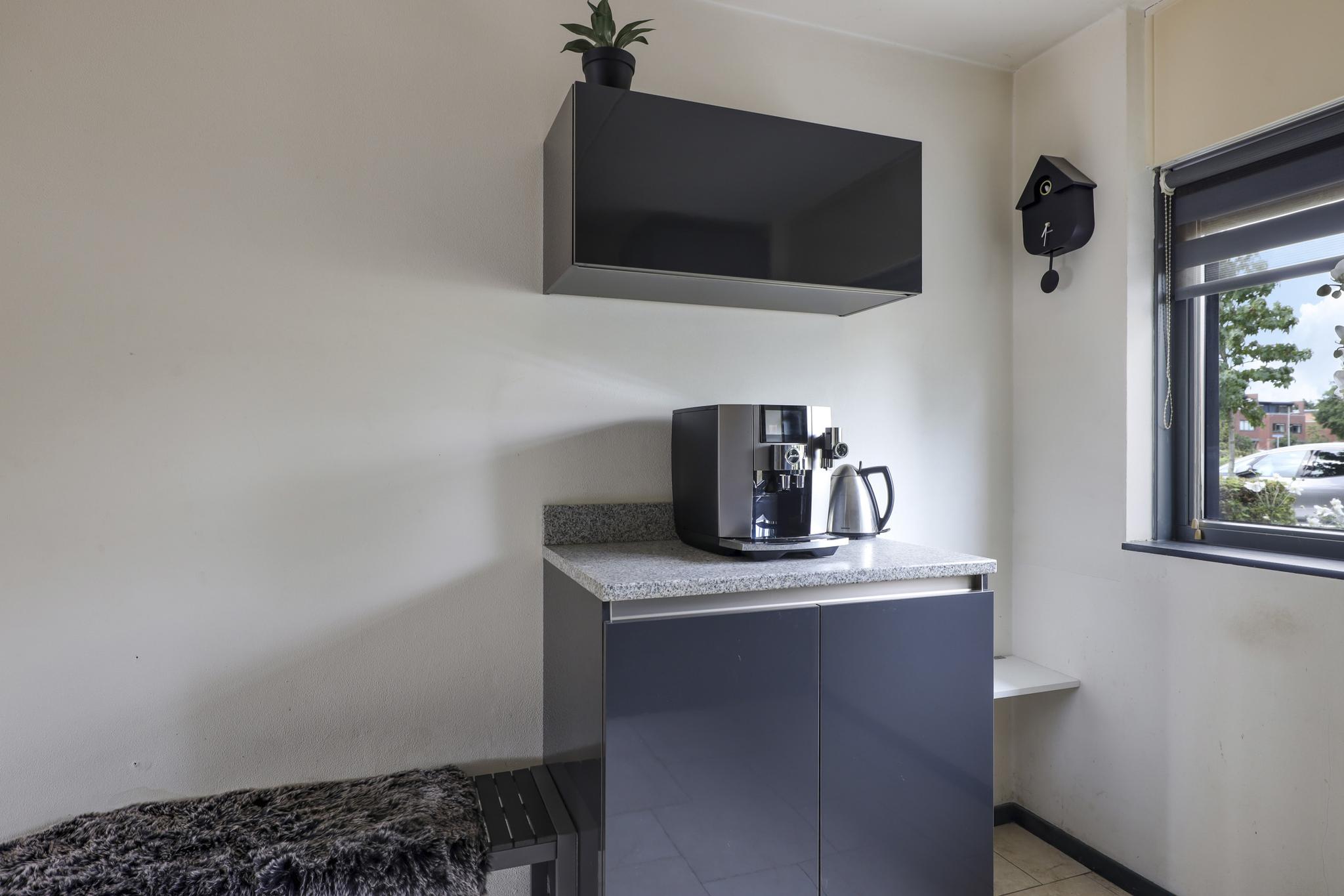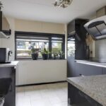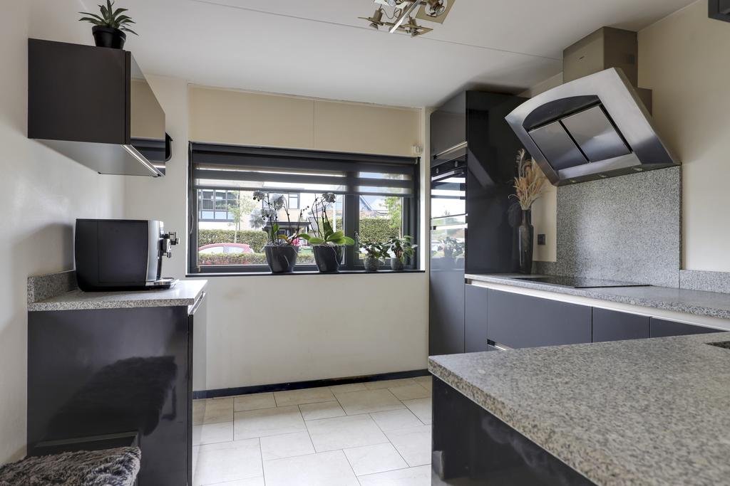 De keuken is aan de voorzijde van de woning gelegen en staat in halfopen verbinding met de woonkamer. Het keukenblok is in een hoekopstelling geplaatst met een aparte koffie-corner en voorzien van alle luxe en comfort. Het composiet werkblad steekt mooi af bij de donkere fronten. Aan opbergruimte heb je geen gebrek met de brede ladekorven en kasten. De inbouwapparatuur bestaat uit een 4-pits inductiekookplaat, een afzuigkap, een vaatwasser, een combi-oven/magnetron en een koelkast. Mocht je de koffie-corner weghalen, dan kan je hier zelfs een 2e eettafel kwijt. Direct naast de keuken is een diepe trapkast gelegen wat nog meer opbergruimte biedt. Aan de voorzijde van de woning kijk je prettig van je af, mede door de brede opzet van de straat.