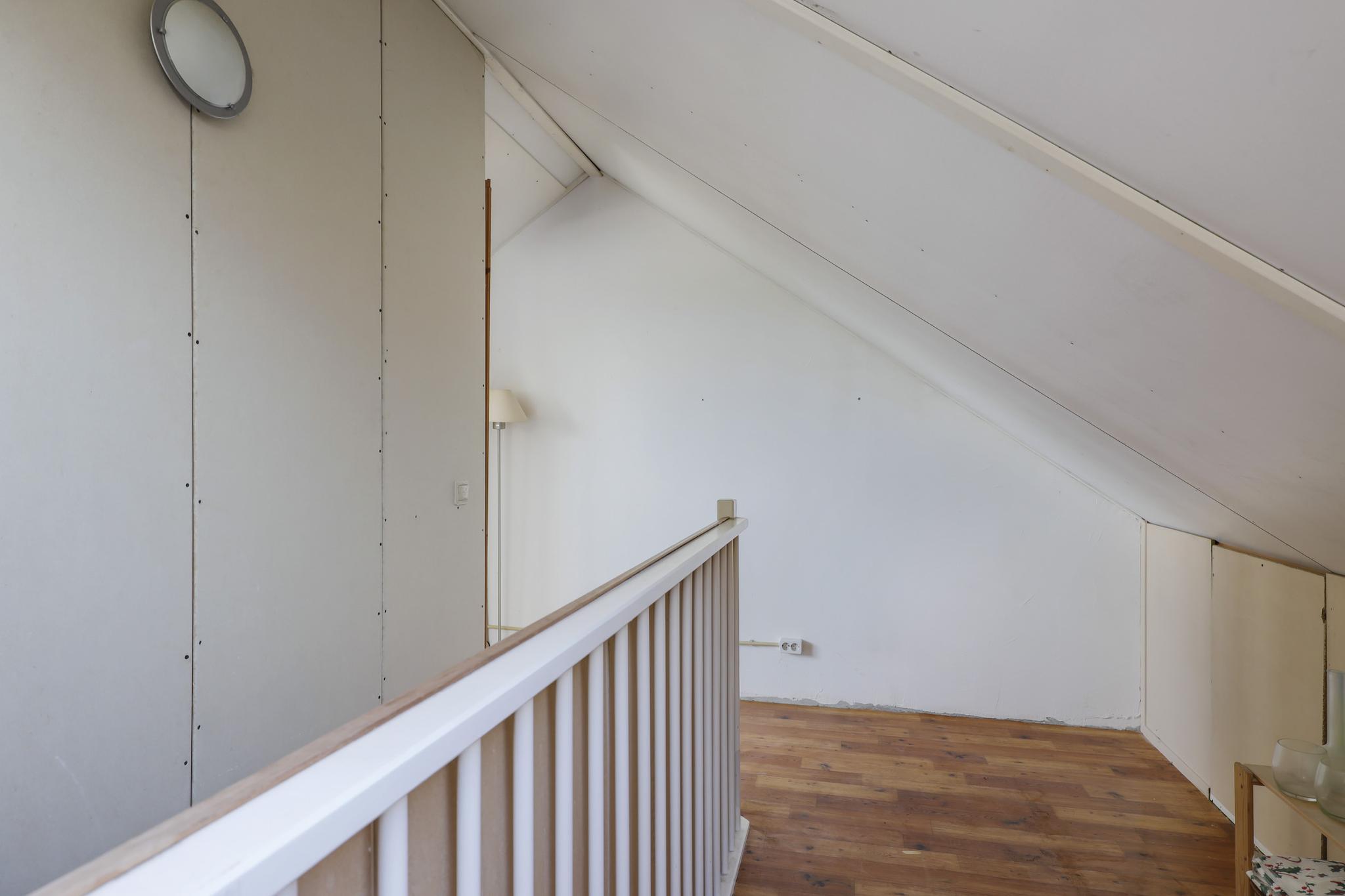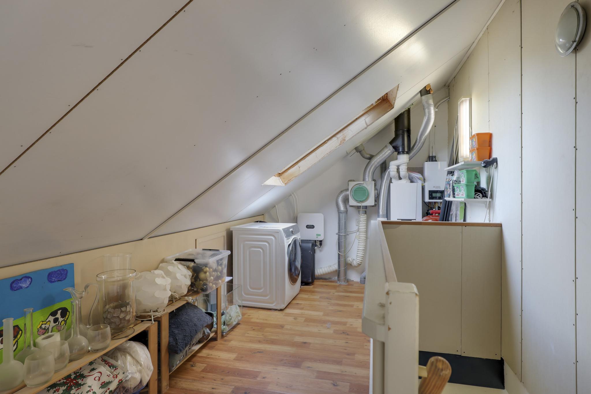 De 2e verdieping is via een vaste trapopgang bereikbaar. De ruimte is hier gunstig opgedeeld in een voorzolder en een 4e slaapkamer. Op de voorzolder is tevens de technische ruimte te vinden. Heel recent (augustus 2023) is de oude cv-ketel vervangen en is een hybride warmtepomp geplaatst. Deze is niet alleen een stuk energiezuiniger, je bespaart veel op je gasverbruik en de warmtepomp maakt gebruik van de energie die je zelf opwerkt middels de zonnepanelen. Je treft hier tevens de mechanische ventilatie-unit en de omvormer van de zonnepanelen (15 stuks). Ook de witgoedaansluitingen zijn hier terug te vinden. Een extra dakraam biedt een fijne lichtinval. Aan beiden zijden van de woning is knieschot opbergruimte aanwezig.