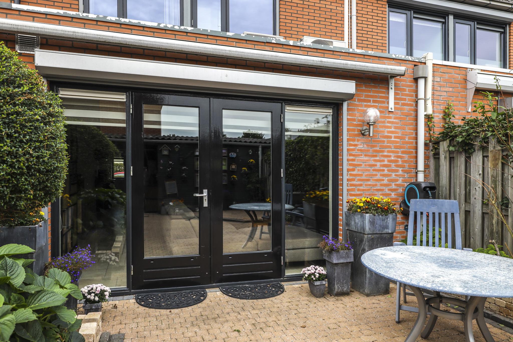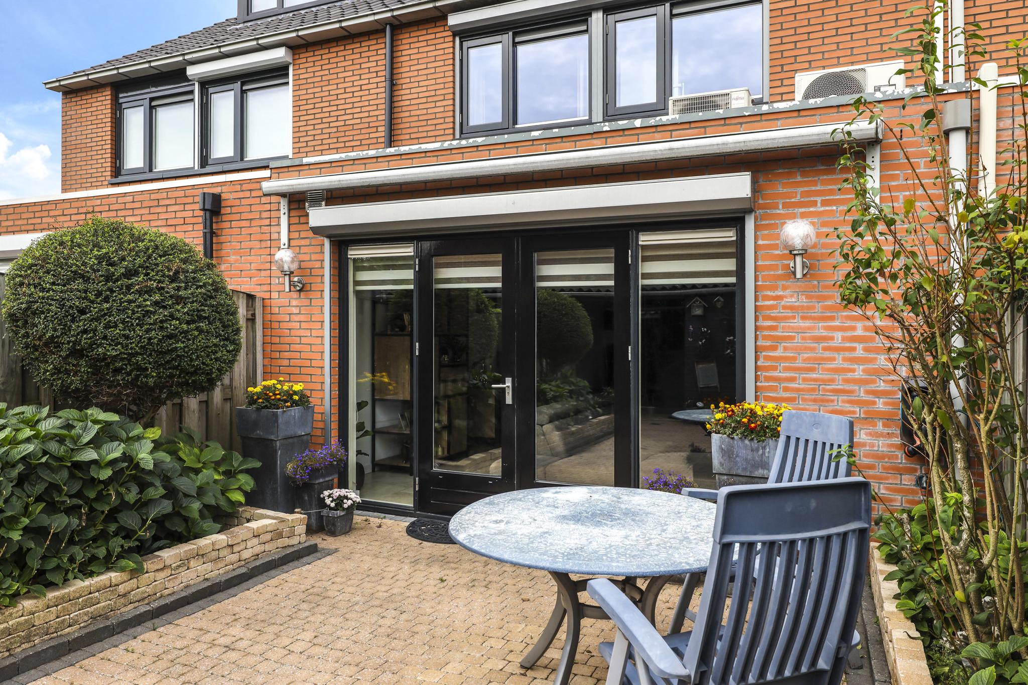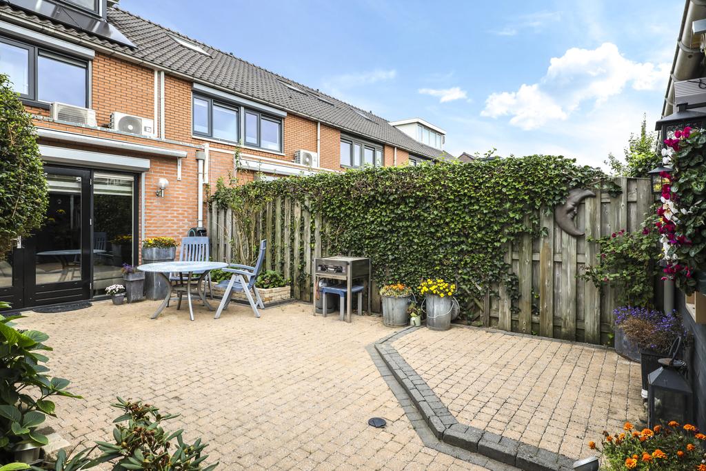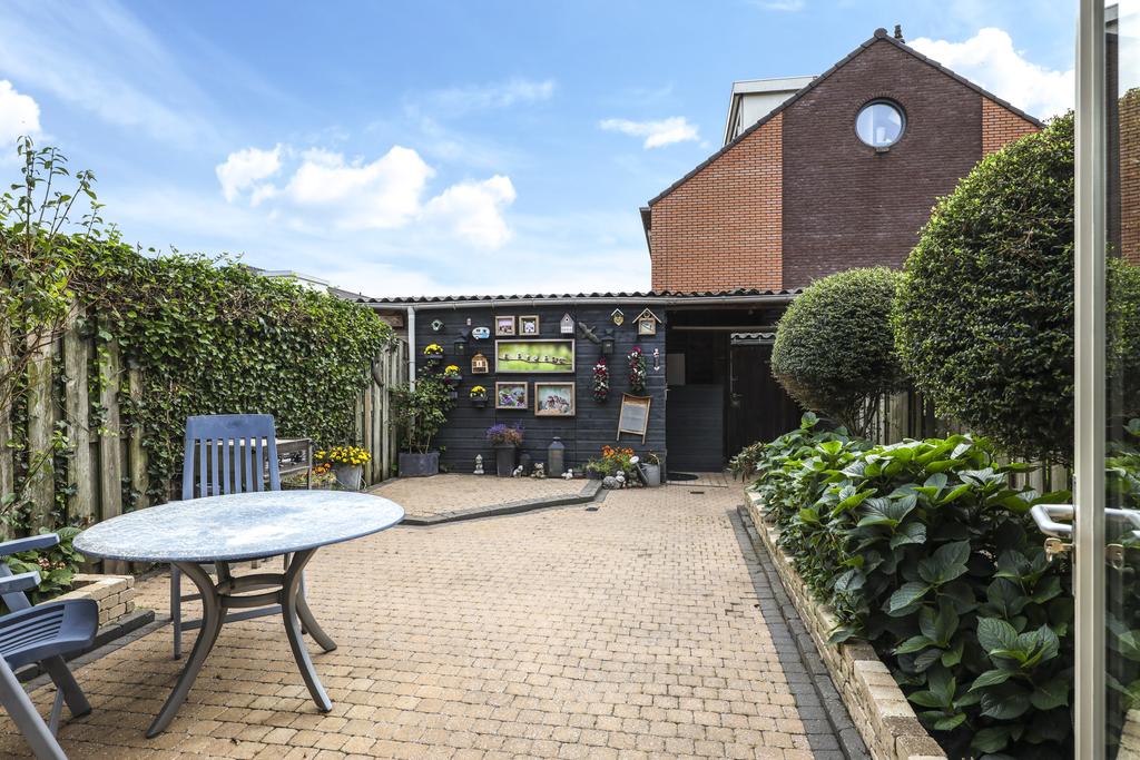 De woning wordt compleet gemaakt door een sfeervolle, zonnige achtertuin. De tuin is ingericht met een groot terras waar je meerder zithoeken kwijt kunt. Een speels detail is de kleine verhoging in de hoek. Aan de zijkanten van de tuin zijn groenborders gemaakt waardoor diverse planten en struiken de tuin een groene uitstraling bieden. Achter in de tuin staat een houten schuur welke zwart is gebeitst voor een stoere uitstraling. Aan de schuur is een overkapping te vinden waar (achter een schot) ruimte is voor de containers. Ook de achterom is hier aanwezig welke tevens aansluiting biedt aan de achtergelegen parkeerplaats. De tuin ligt op het oosten, maar geniet de gehele dag zon. Om de zon enigszins uit de woning te kunnen weren, is er over de volle breedte zonwering en een rolluik aanwezig (beiden elektrisch te bedienen).