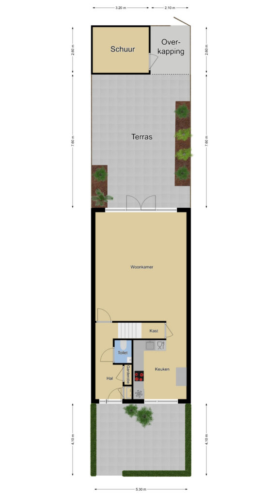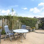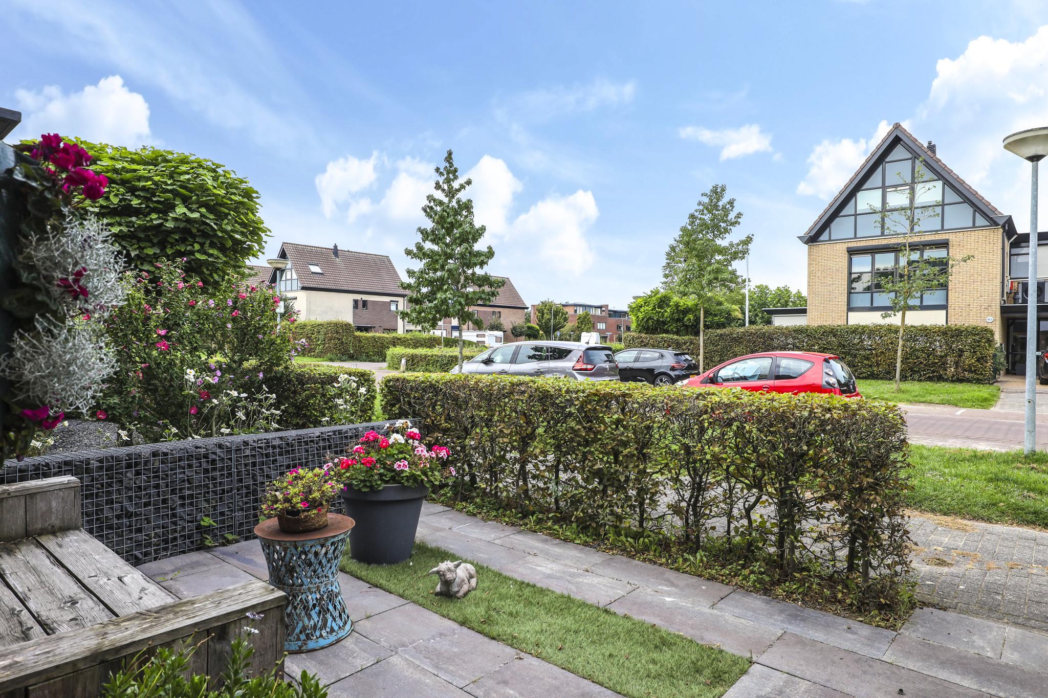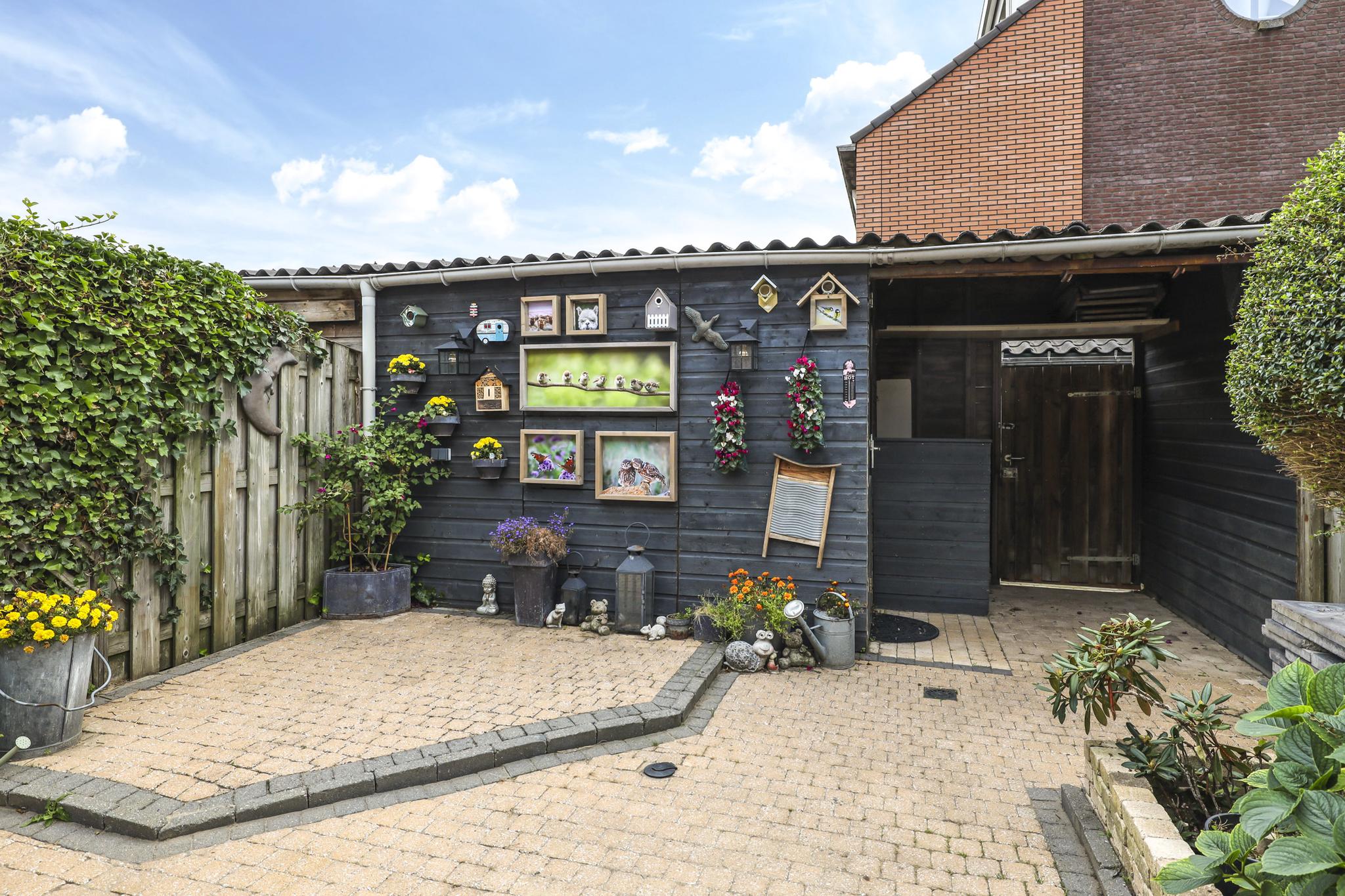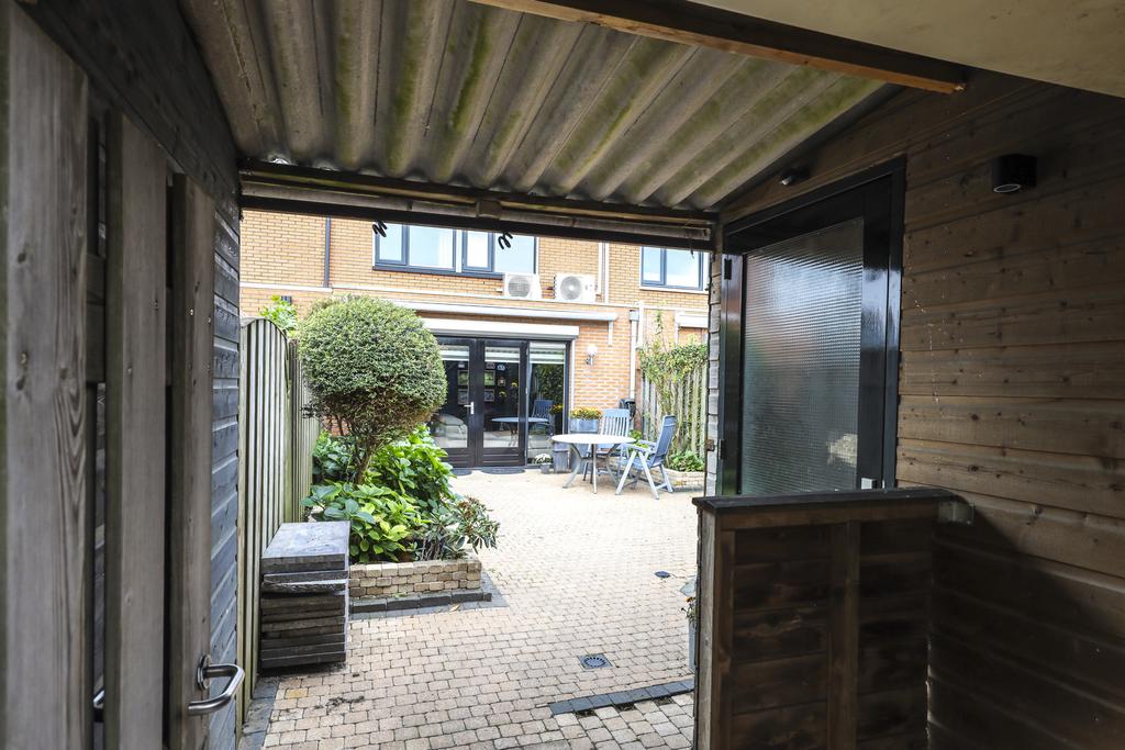 De woning wordt compleet gemaakt door een sfeervolle, zonnige achtertuin. De tuin is ingericht met een groot terras waar je meerder zithoeken kwijt kunt. Een speels detail is de kleine verhoging in de hoek. Aan de zijkanten van de tuin zijn groenborders gemaakt waardoor diverse planten en struiken de tuin een groene uitstraling bieden. Achter in de tuin staat een houten schuur welke zwart is gebeitst voor een stoere uitstraling. Aan de schuur is een overkapping te vinden waar (achter een schot) ruimte is voor de containers. Ook de achterom is hier aanwezig welke tevens aansluiting biedt aan de achtergelegen parkeerplaats. De tuin ligt op het oosten, maar geniet de gehele dag zon. Om de zon enigszins uit de woning te kunnen weren, is er over de volle breedte zonwering en een rolluik aanwezig (beiden elektrisch te bedienen).