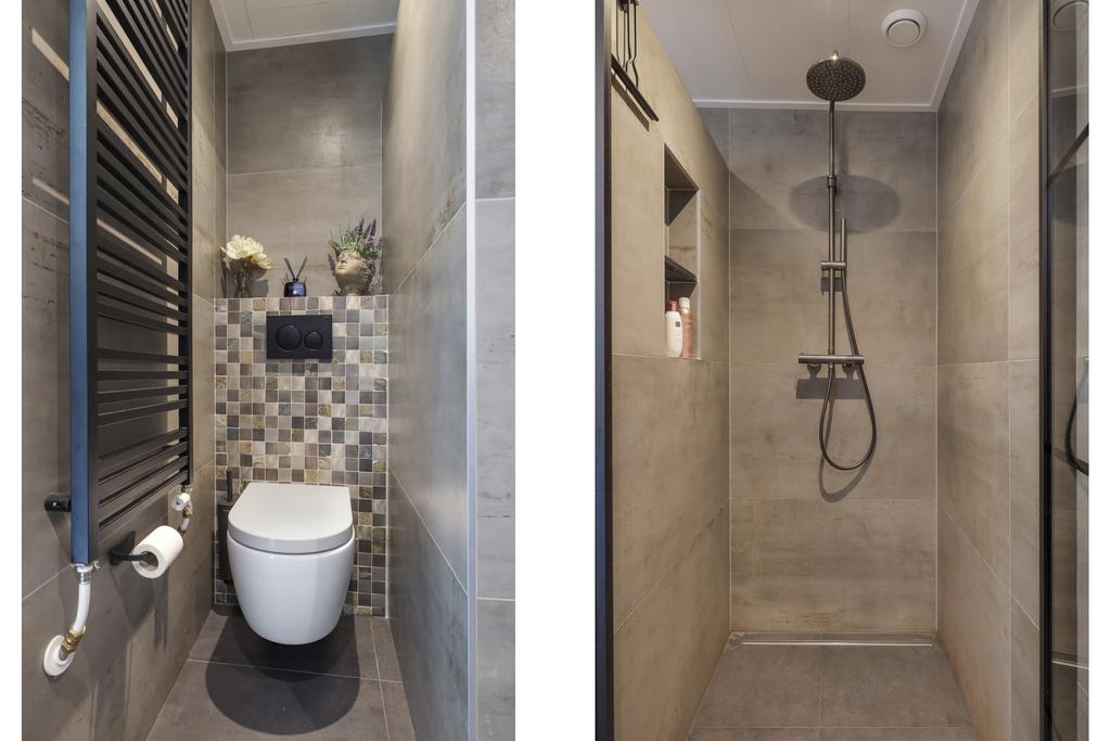 De badkamer in deze woning is slechts 1 jaar oud en dat zie je zeker terug! Geen wonder dat de moderne uitstraling en de laatste trends je direct op zullen vallen. De ruimte is ingedeeld met een royale inloopdouche, een 2e toilet en een wastafelmeubel. Het meubel is voorzien van brede ladekorven en een aparte toiletkast wat veel opbergruimte biedt. De stijlvolle, rechthoekige spiegel is voorzien van verlichting én verwarming. De inloopdouche heeft een zwartstalen deur, een nis in de scheidingswand, een regendouche, een handdouche en een drain afvoer. De designradiator ontbreekt ook niet en is in trendy zwart uitgevoerd zodat deze past bij de rest van de badkamer. Grote tegels in aardtinten geven de badkamer een warme en luxe uitstraling. De badkamer is voorzien van een eigen mechanische ventilatie kanaal waardoor deze goed te ventileren is.